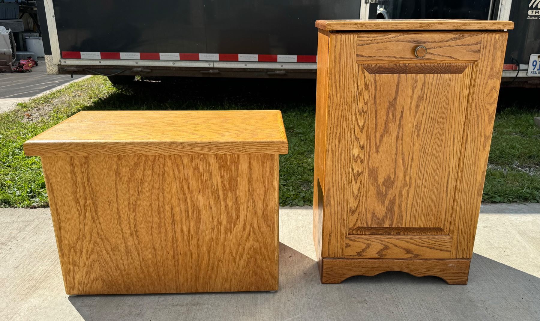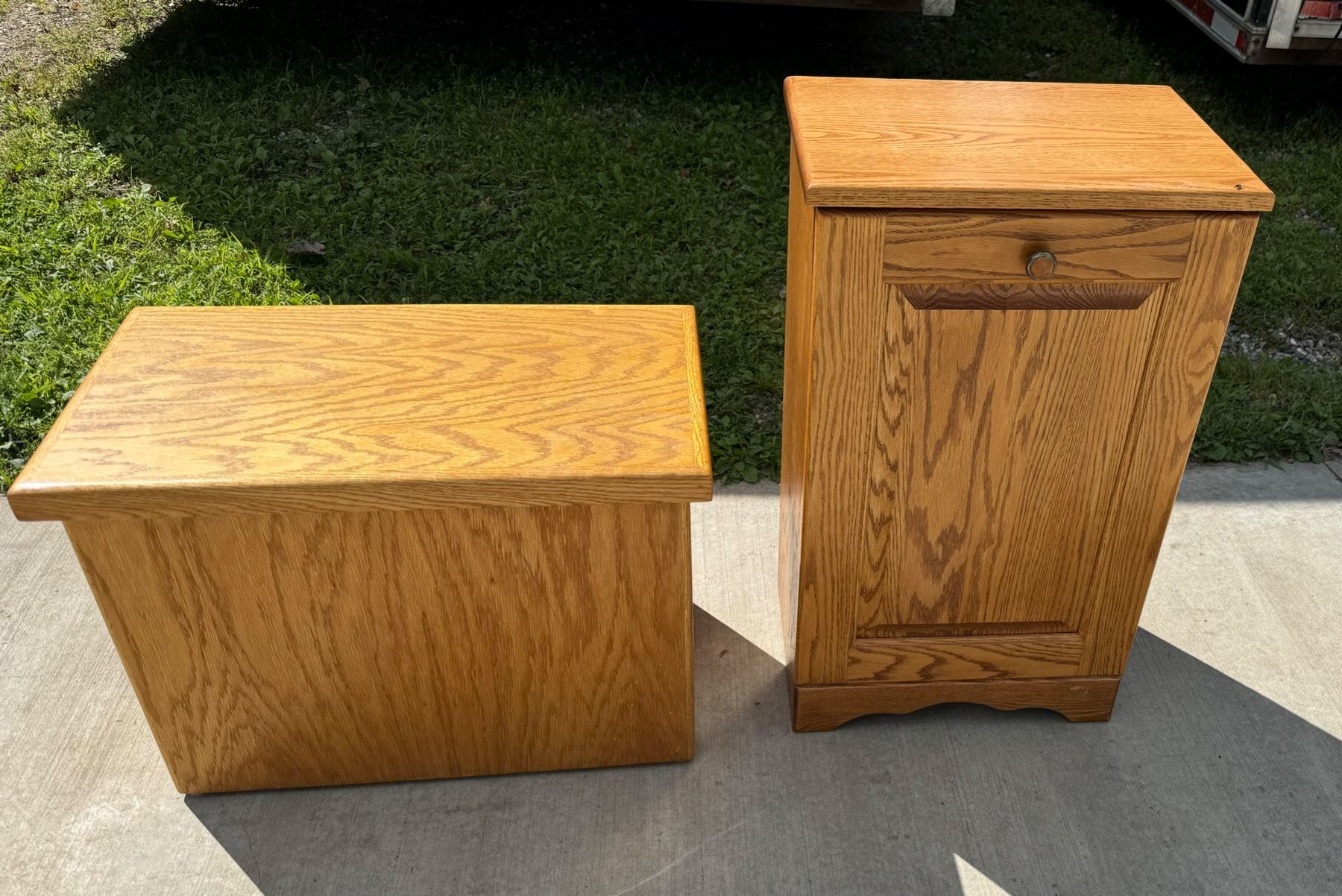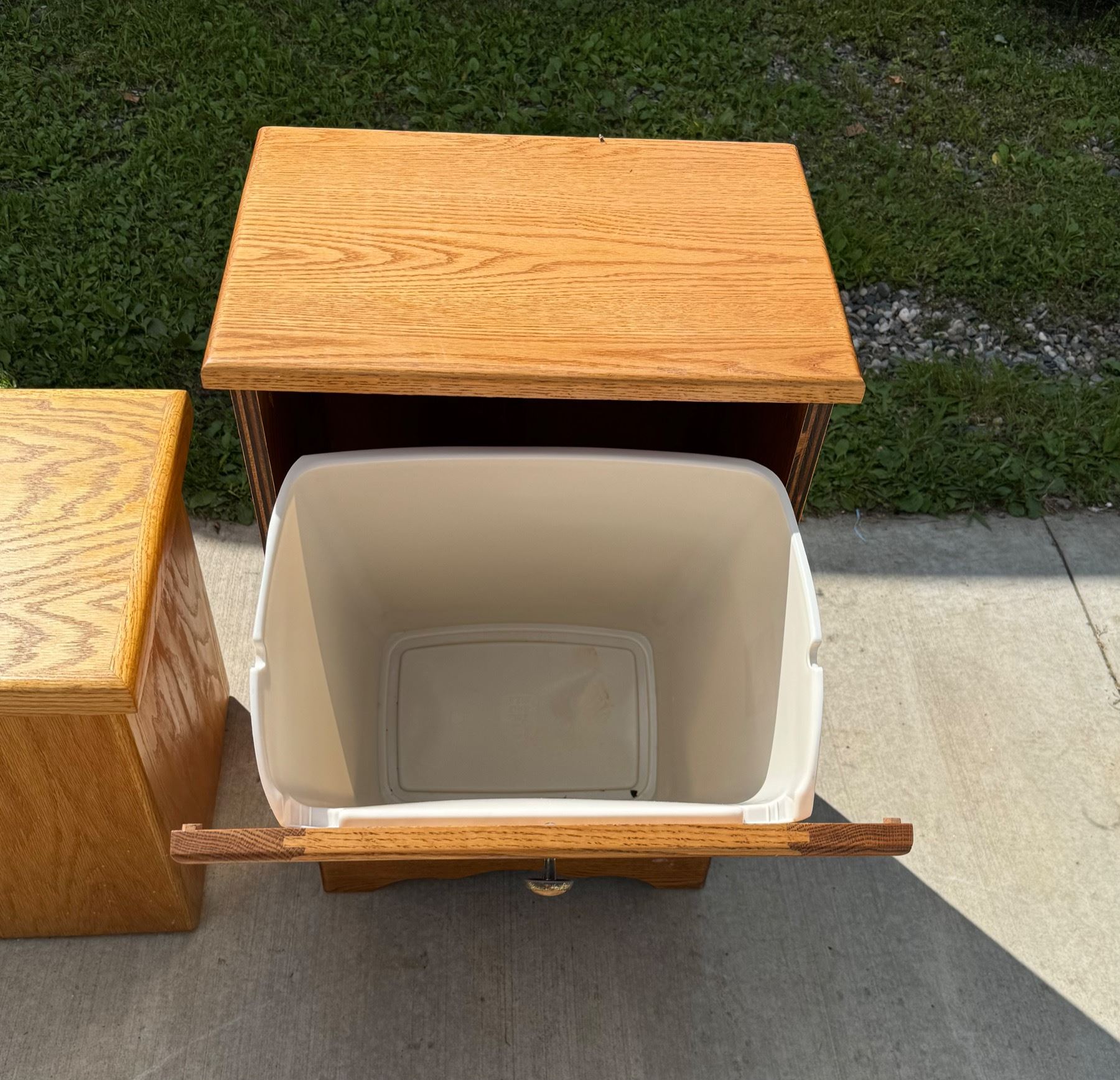 OAK DISPLAY STAND AND TIP DOWN TRASH CABINET