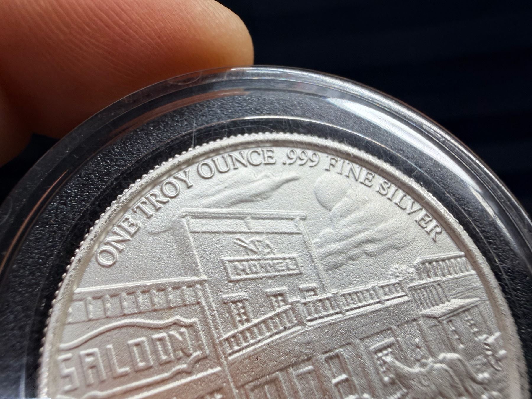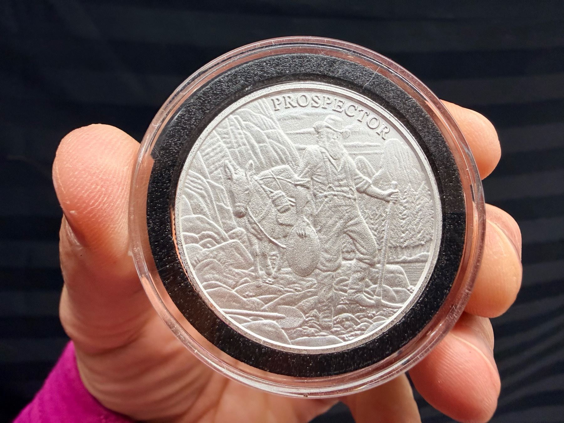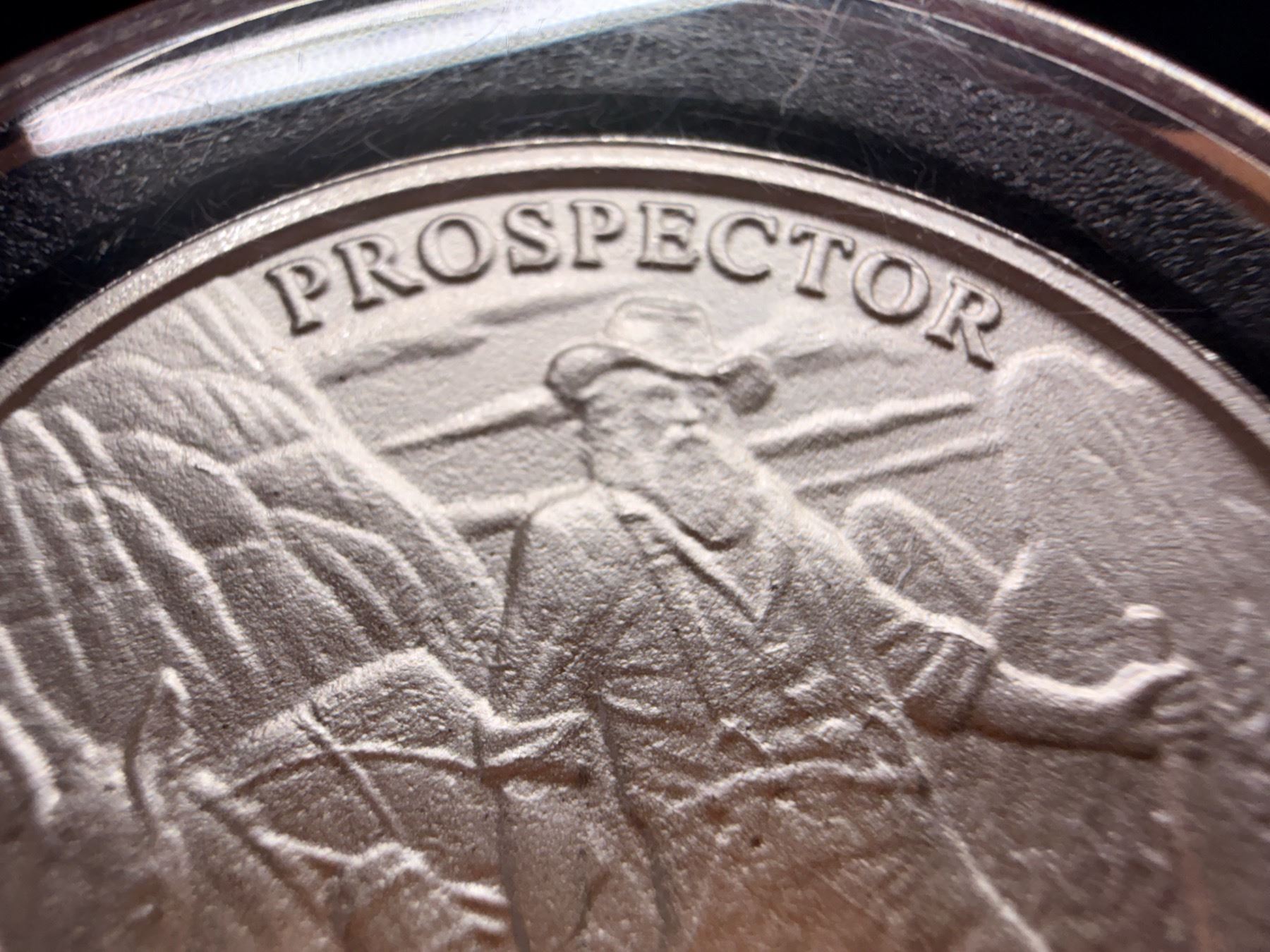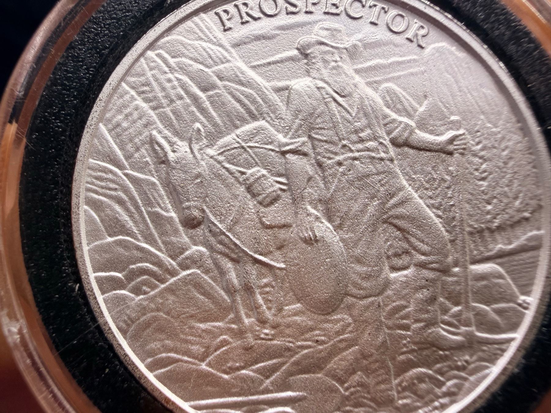 FIRST OF THE PROVIDENT PROSPECTOR SERIES; OBVERSE INCLUDES THE IMAGE OF THE PROSPECTOR ALONG WITH HIS PACK MULE IN THE SIERRA NEVADA; REVERSE FEATURES THE SLEEPY WILD WEST TOWN USED FOR ALL RELEASES IN THE COLLECTION; THE PROVIDENT PROSPECTOR SERIES INCLUDES A TOTAL OF FOUR DESIGNS. NONE OF THE DESIGNS HAD A MINTAGE CAP, THE ROUNDS STRUCK FOR A LIMITED PERIOD OF TIME WHILE DEMAND EXISTED AND THEN PRODUCTION OF EACH CAME TO AN END; THIS PROSPECTOR DESIGN HELPED LAUNCH THE COLLECTION AND WAS FOLLOWED BY THE GUNSLINGER, PONY EXPRESS, AND CAN CAN GIRL DESIGNS