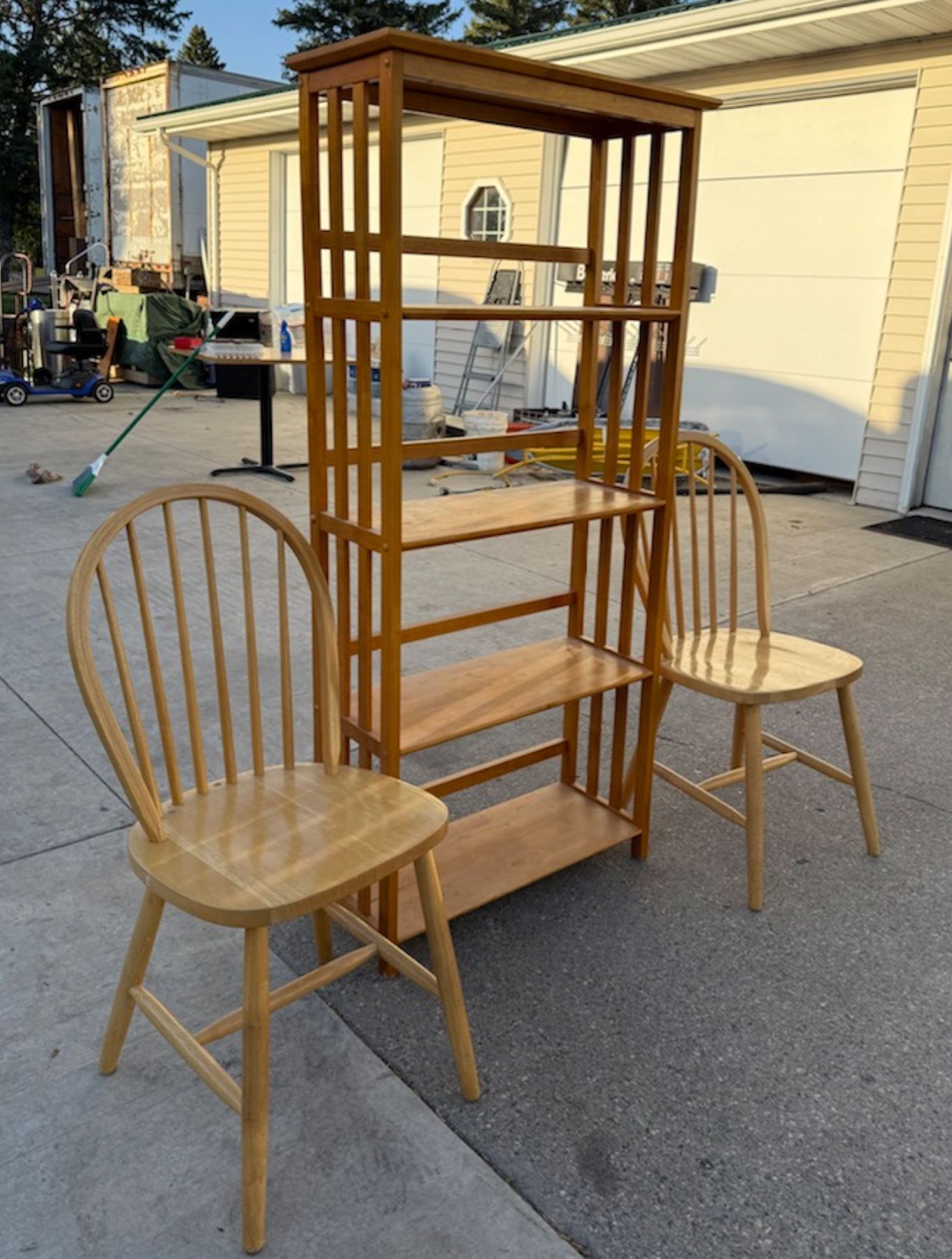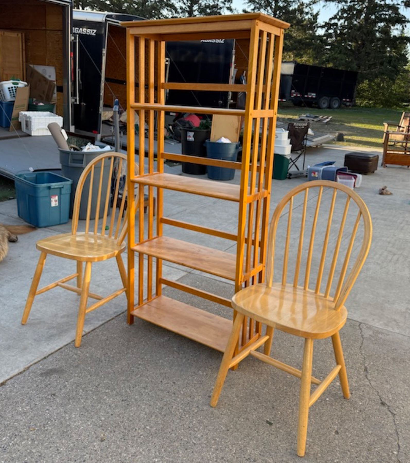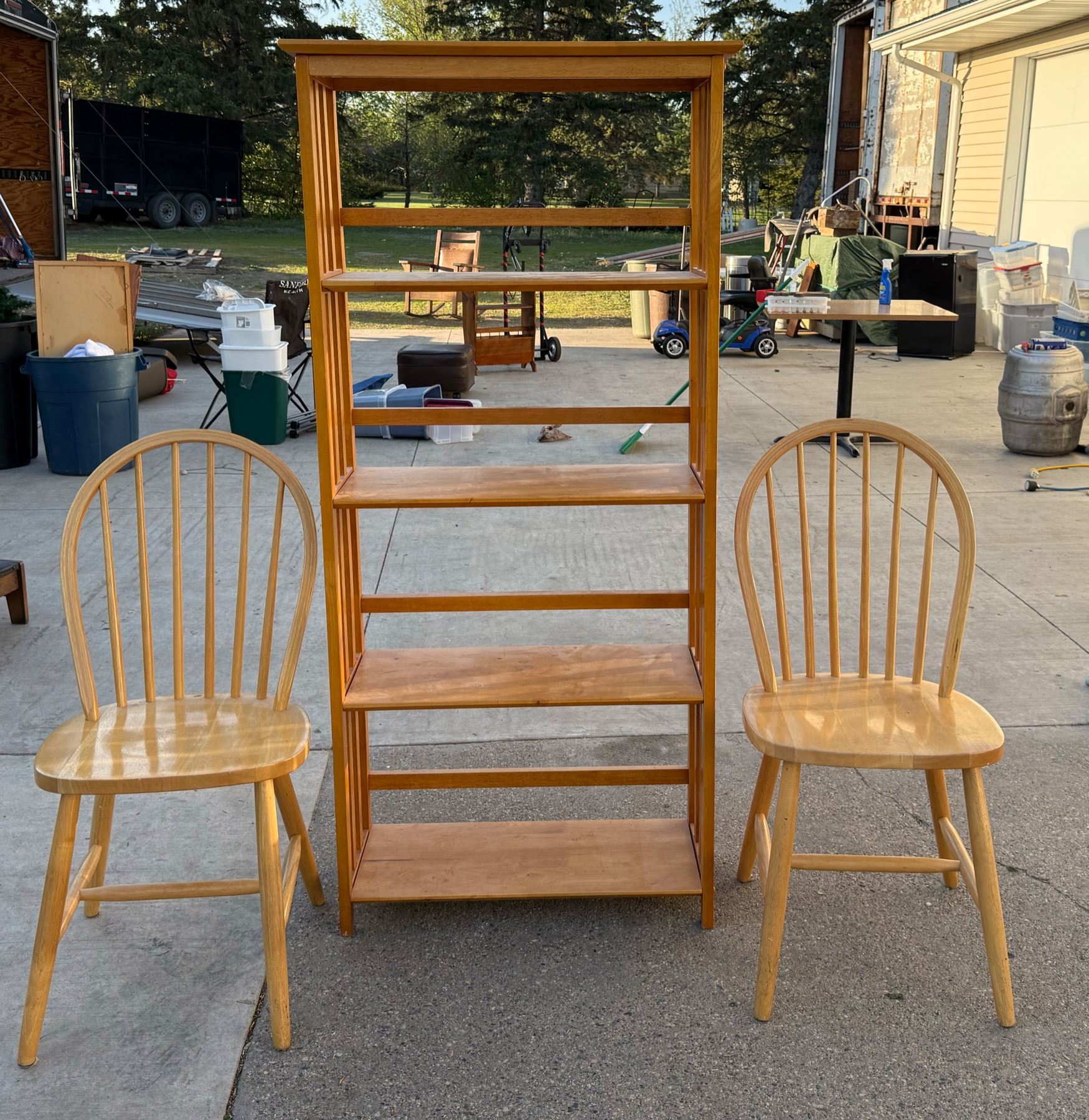 OPEN SIDE MISSION STYLE BOOKSHELF AND TWO BENT BACK CHAIRS