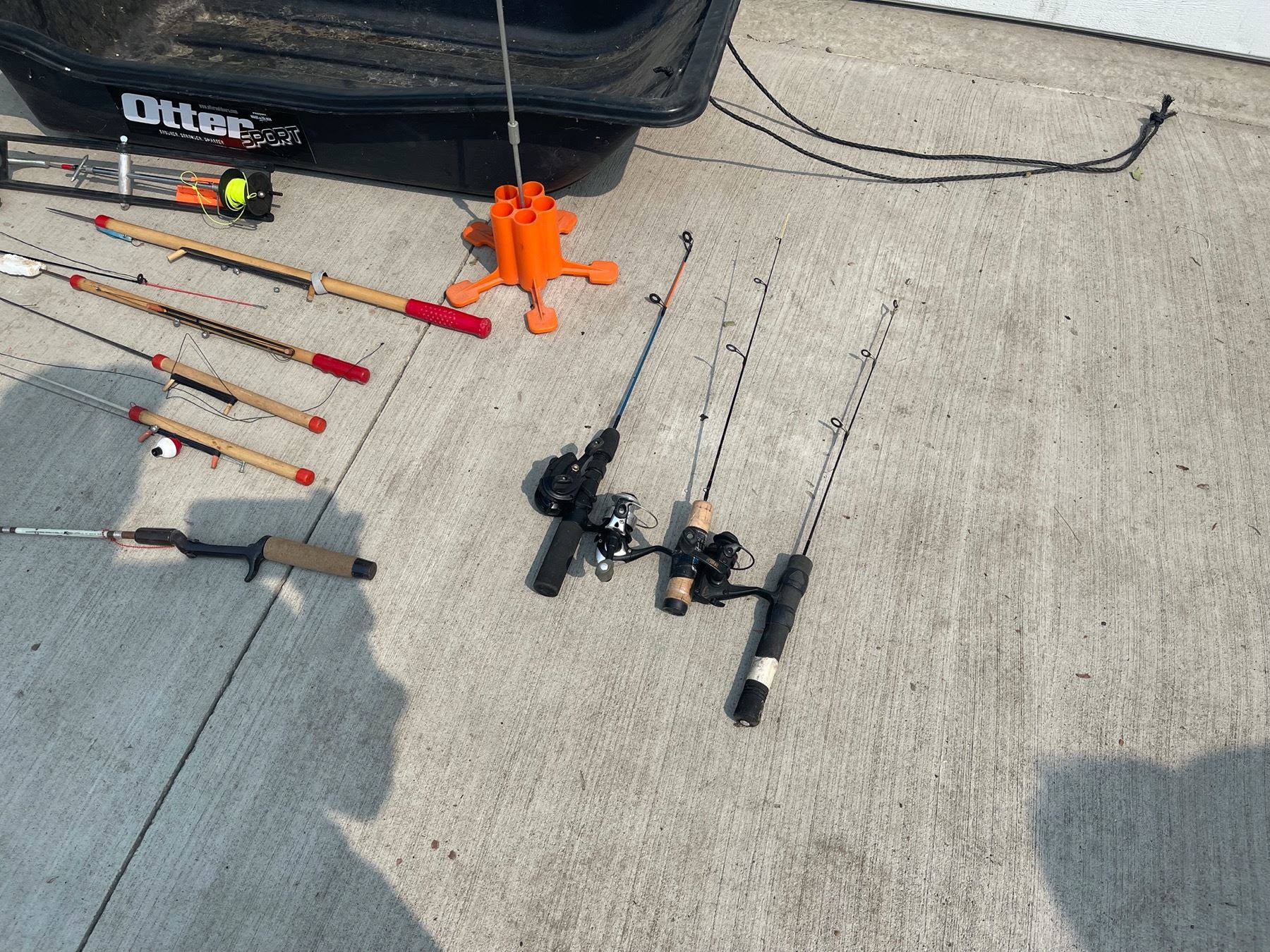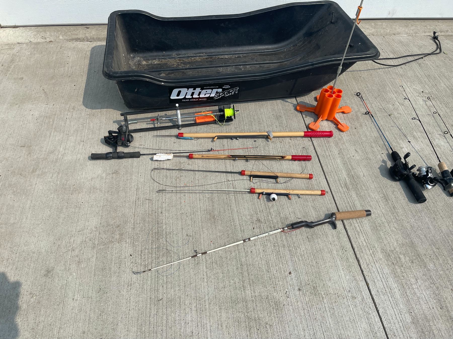 OTTER SPORT SLED AND ICE FISHING POLES; SEE PICTURES FOR DETAILS AND CONDITIONS