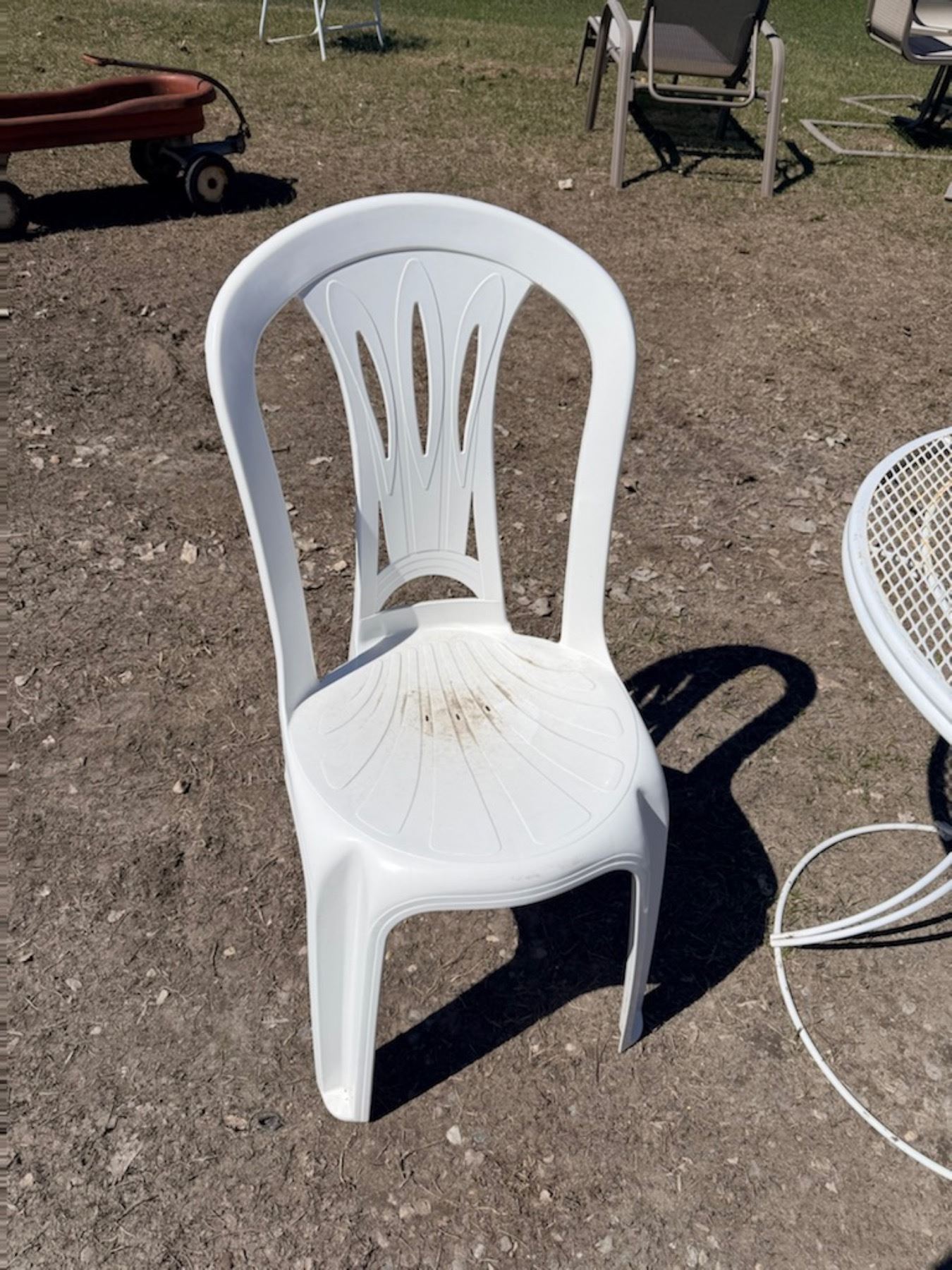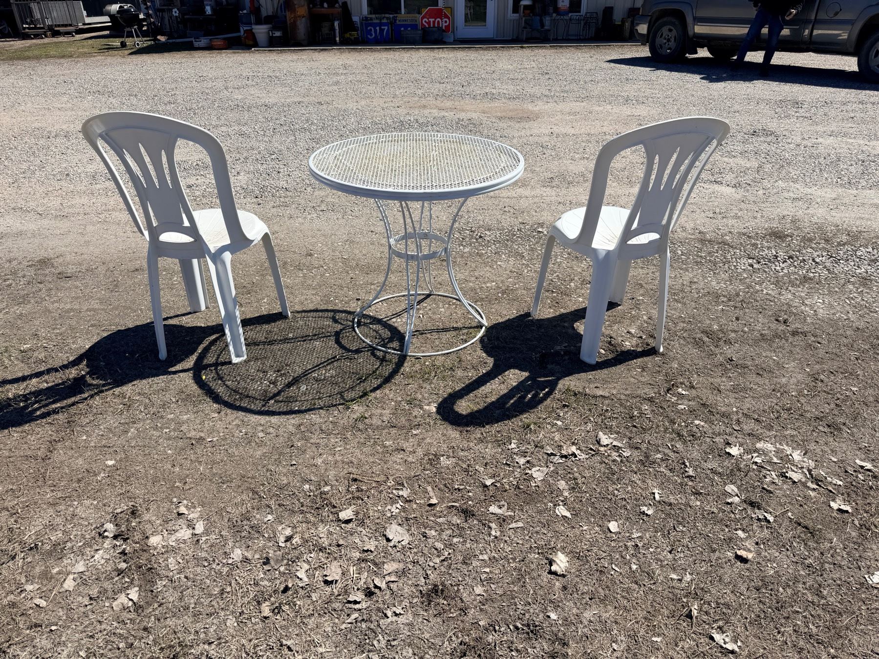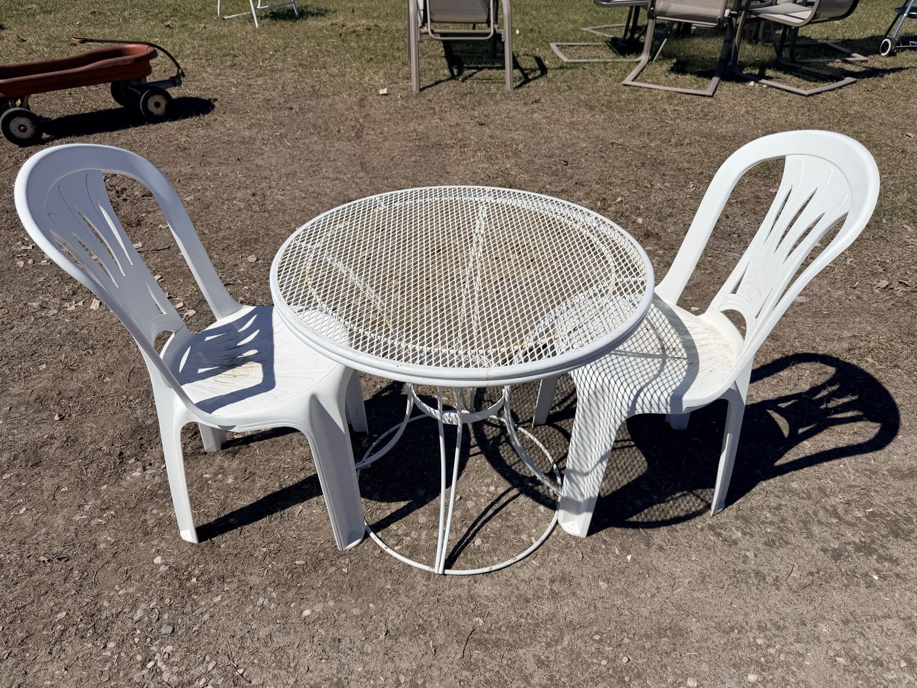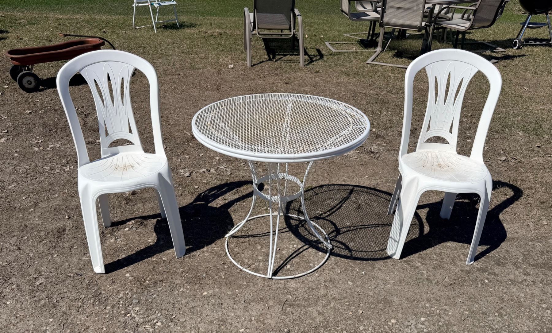 PATIO METAL BISTRO TABLE AND TWO PLASTIC PATIO CHAIRS