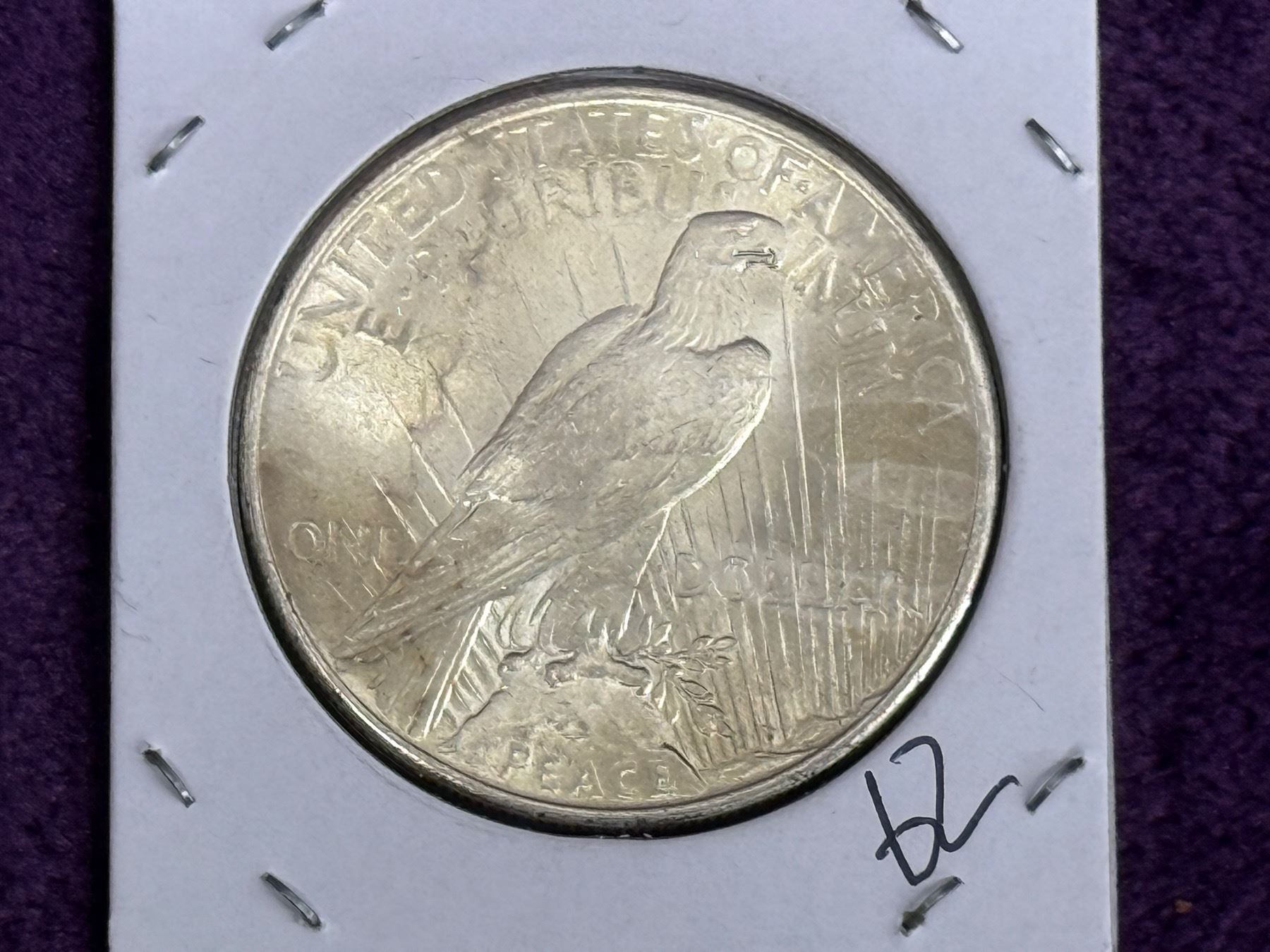 PHILADELPHIA MINT; THE PEACE SILVER DOLLAR WAS ISSUED FROM 1921-1928 AND FROM 1934-1935 AND IS 90 PERCENT SILVER AND 10 PERCENT COPPER