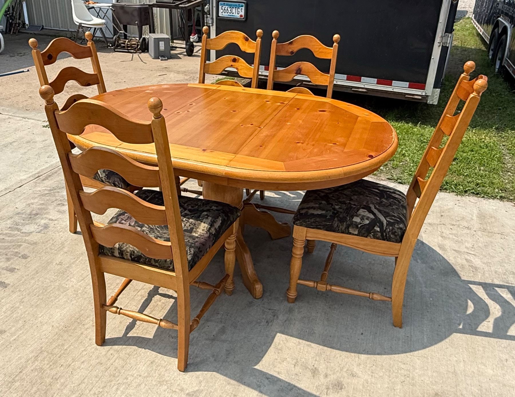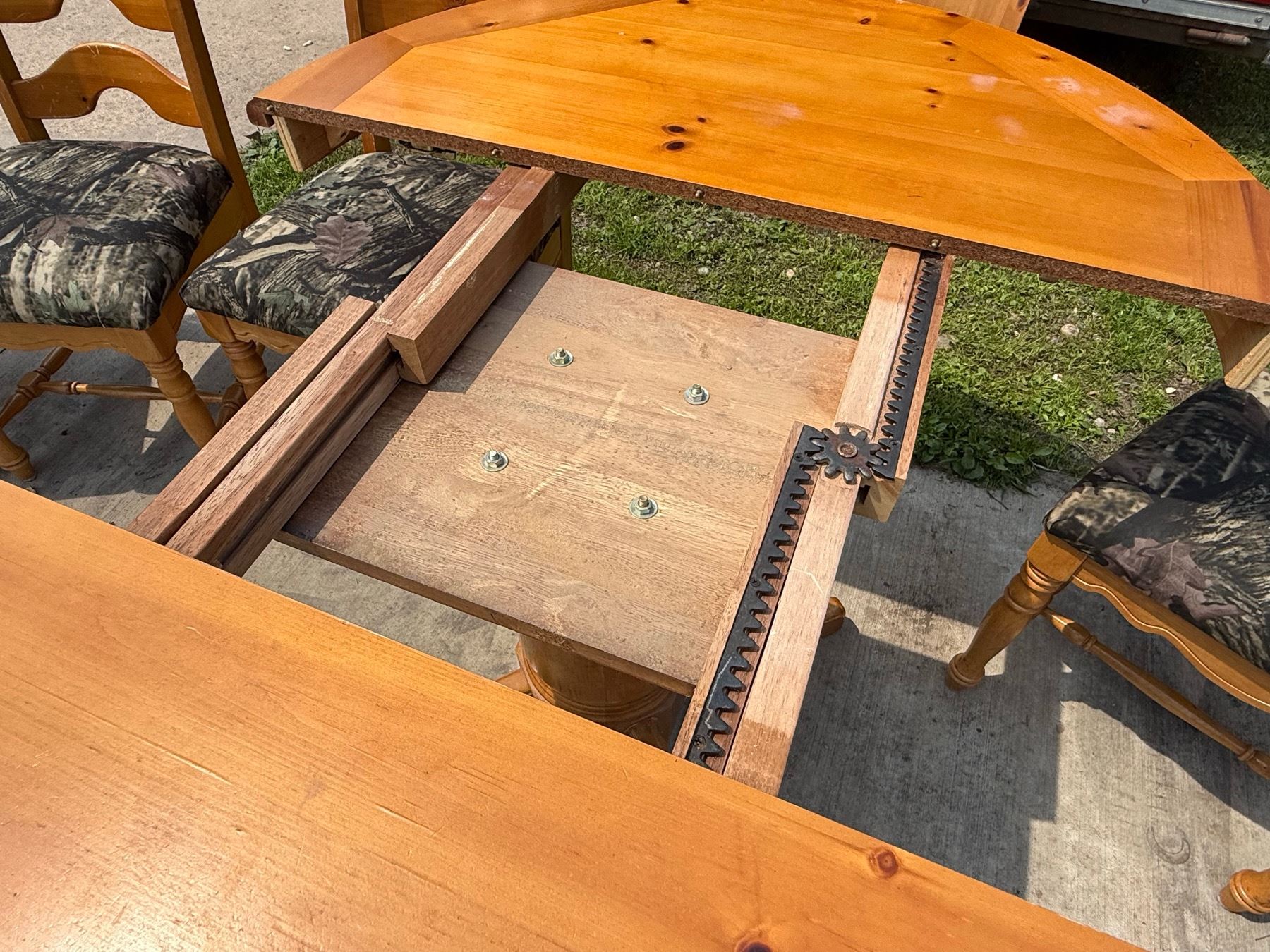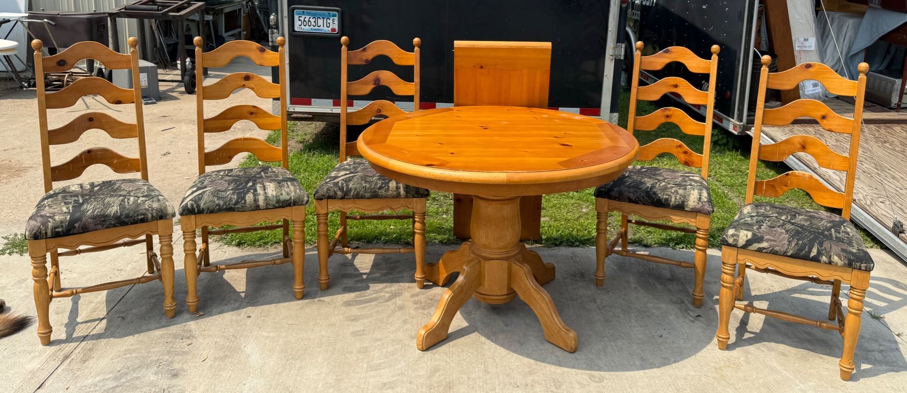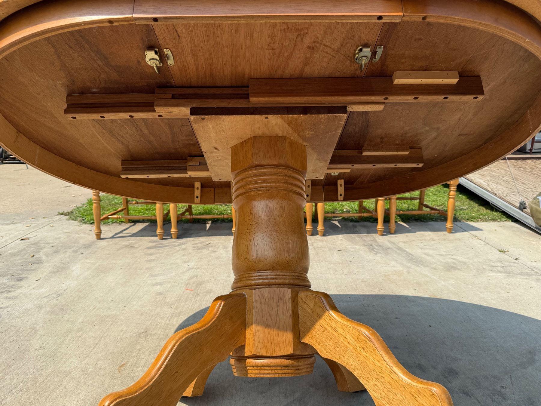 PEDESTAL TABLE WITH FIVE UPHOLSTERED CHAIRS AND LEAF