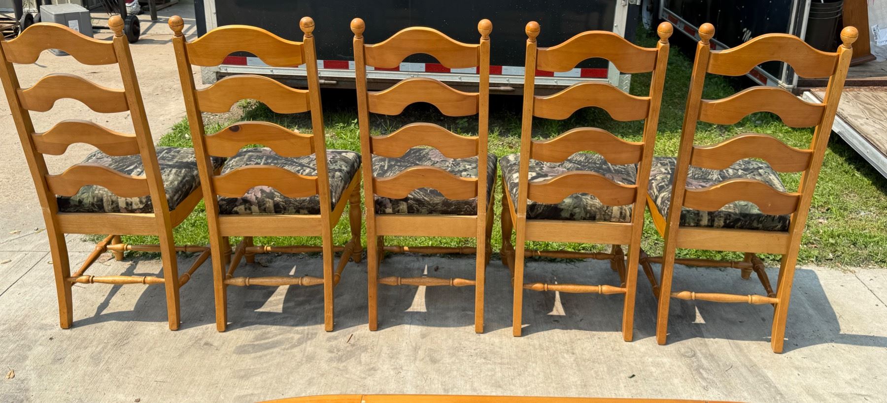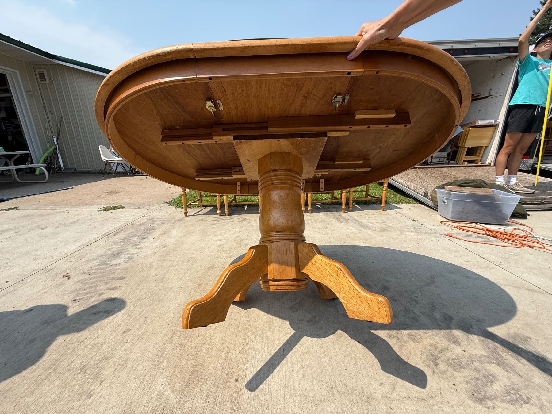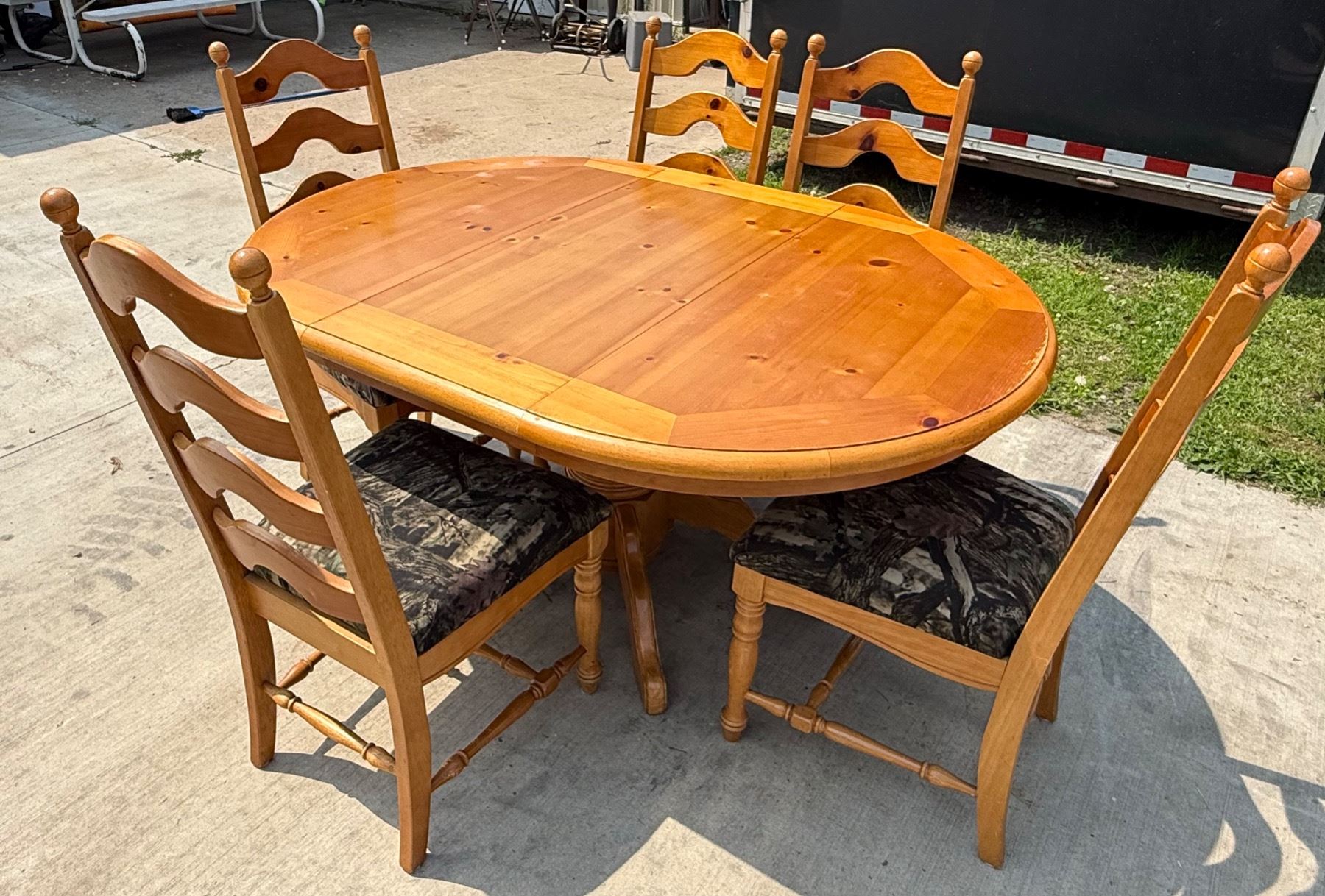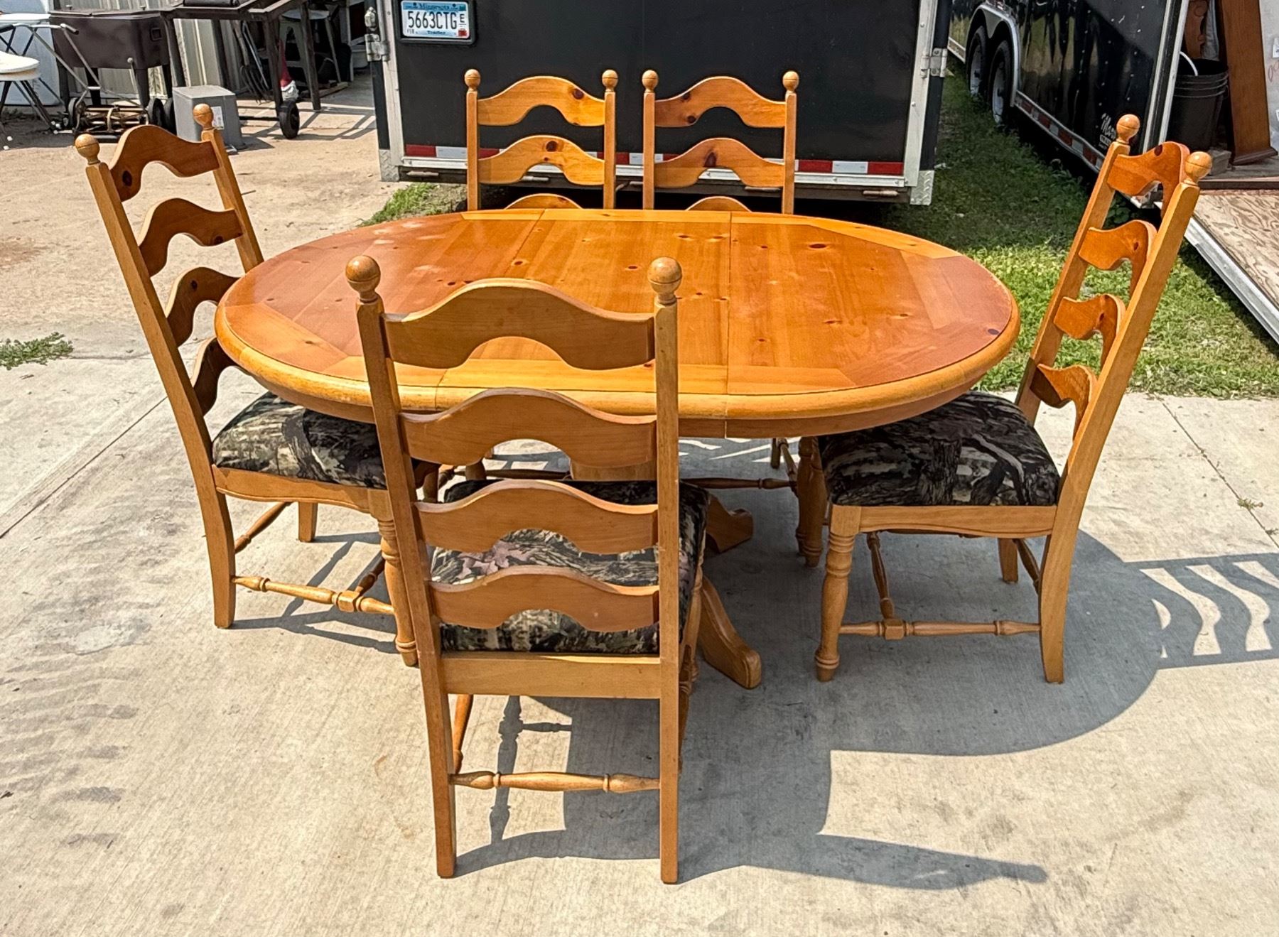 PEDESTAL TABLE WITH FIVE UPHOLSTERED CHAIRS AND LEAF