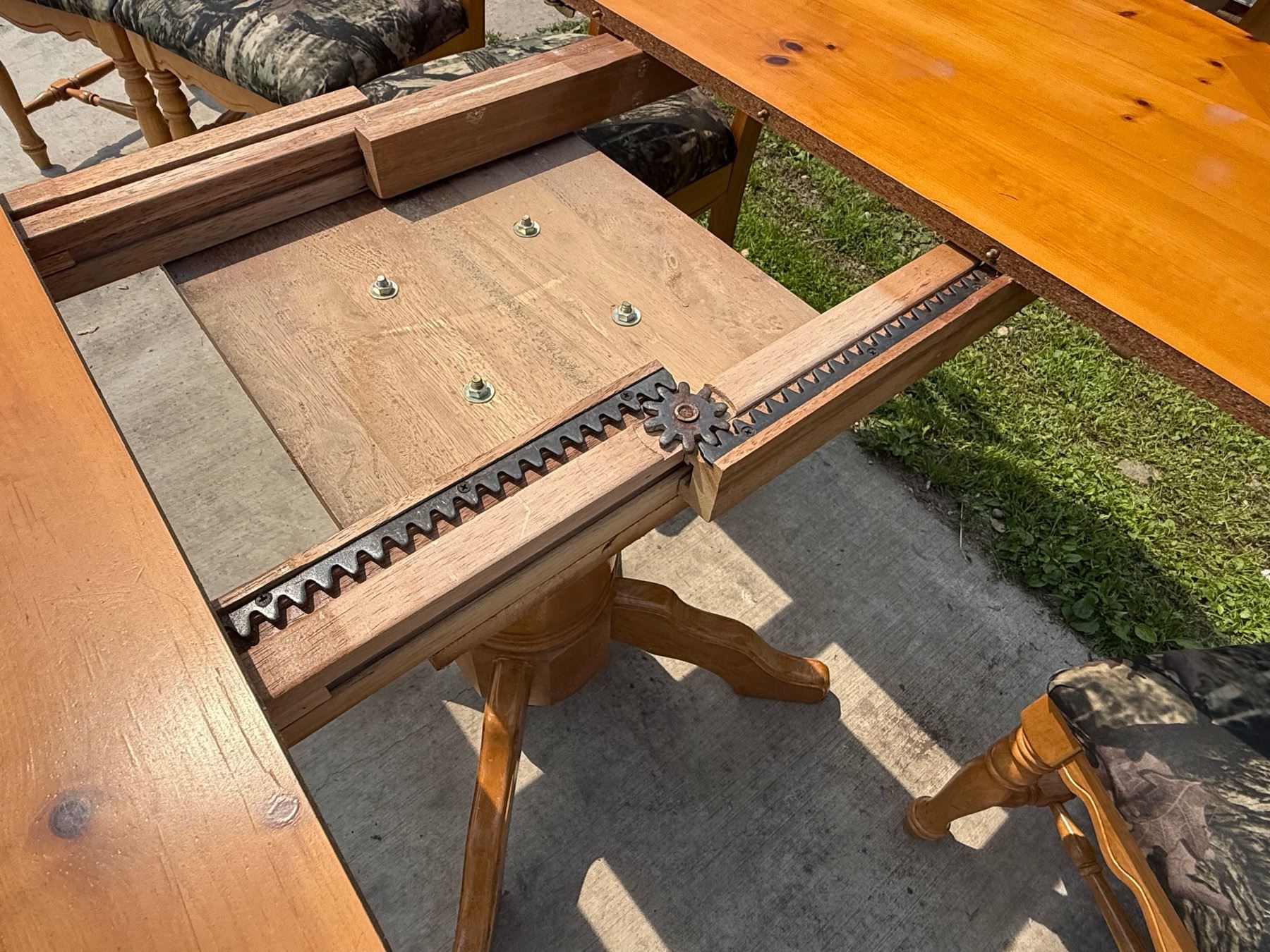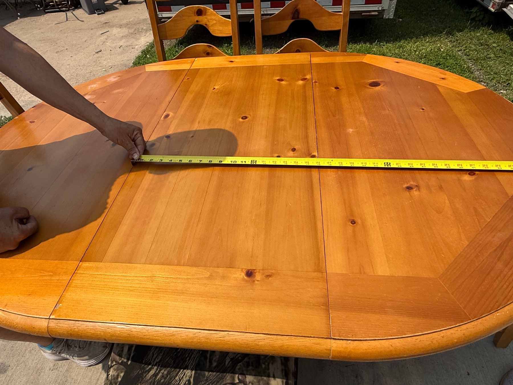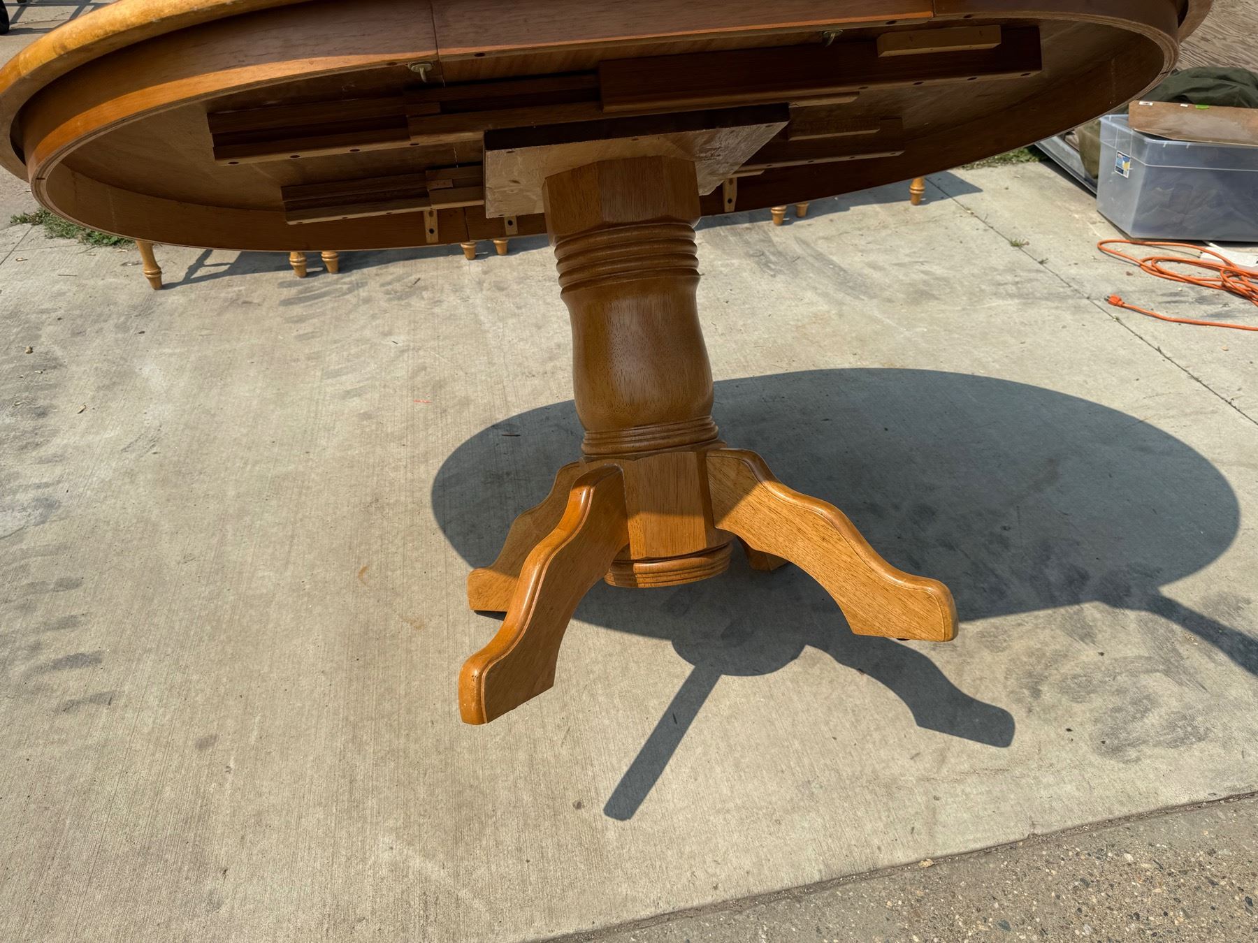 PINE, WITH A LOVELY DESIGN ON THE EDGES; LEAF (18-INCHES) EXTENDS ROUND TABLE TO OVAL; IN EXCELLENT CONDITION!