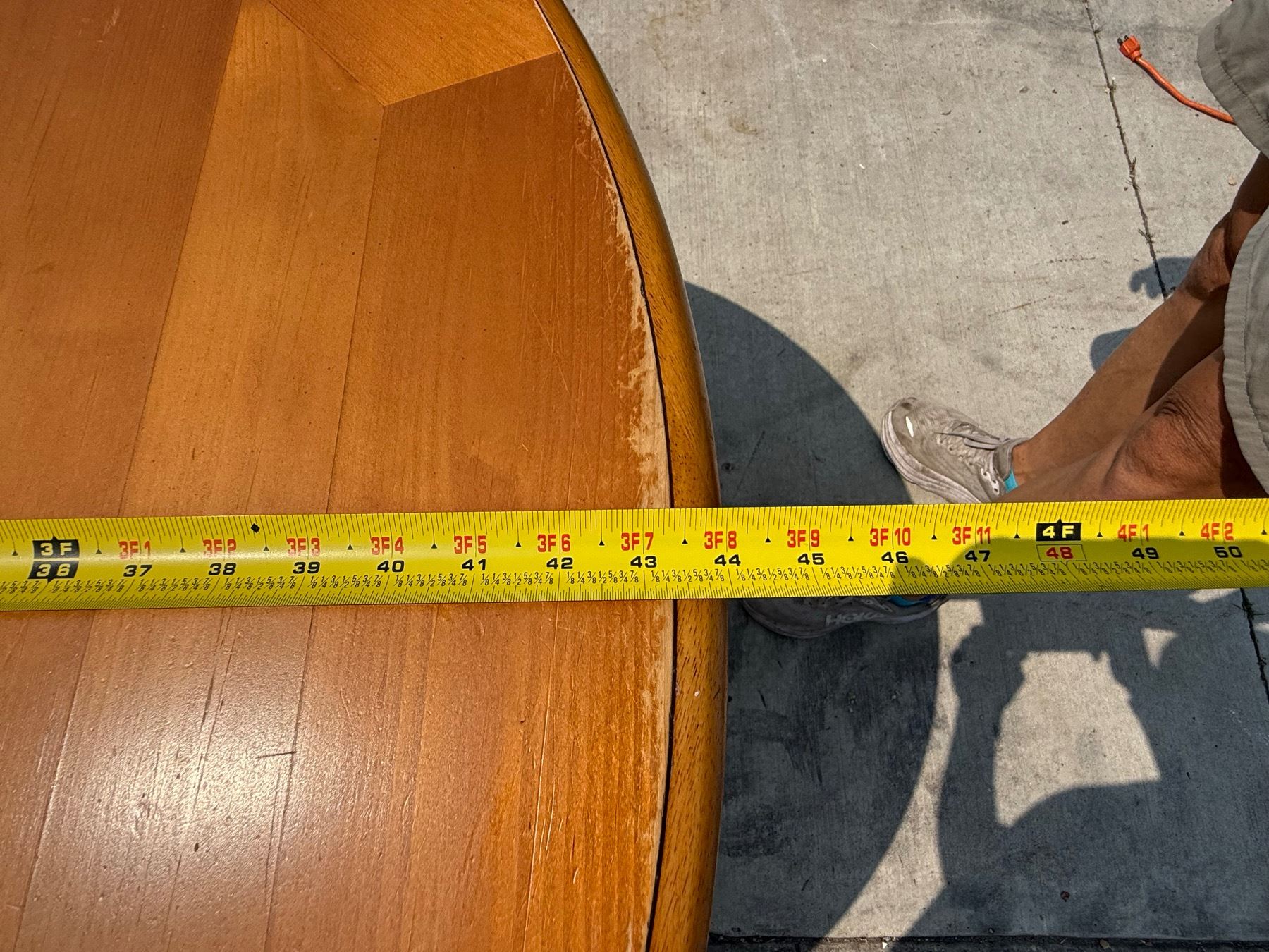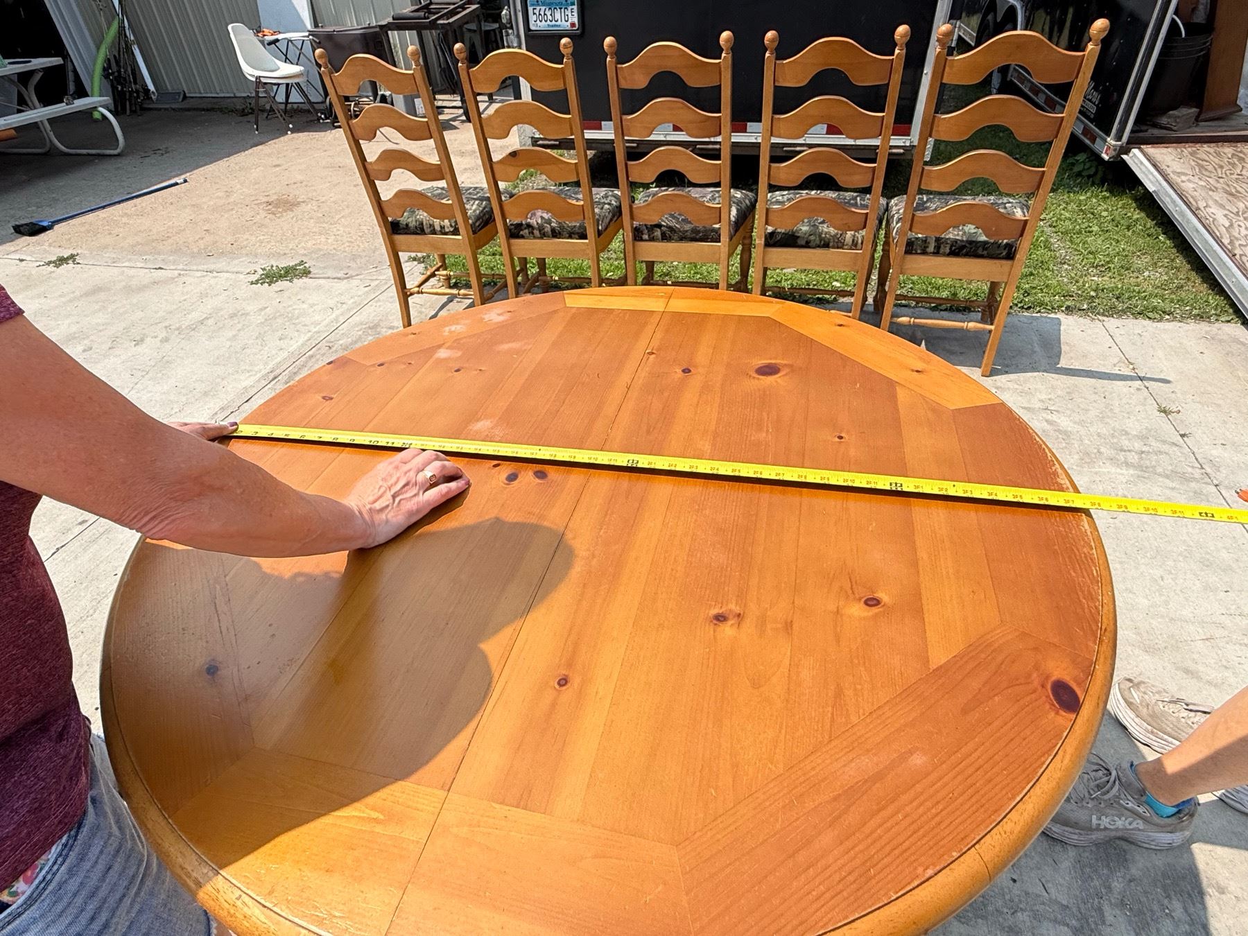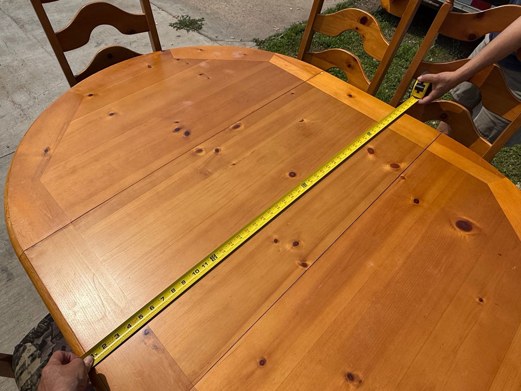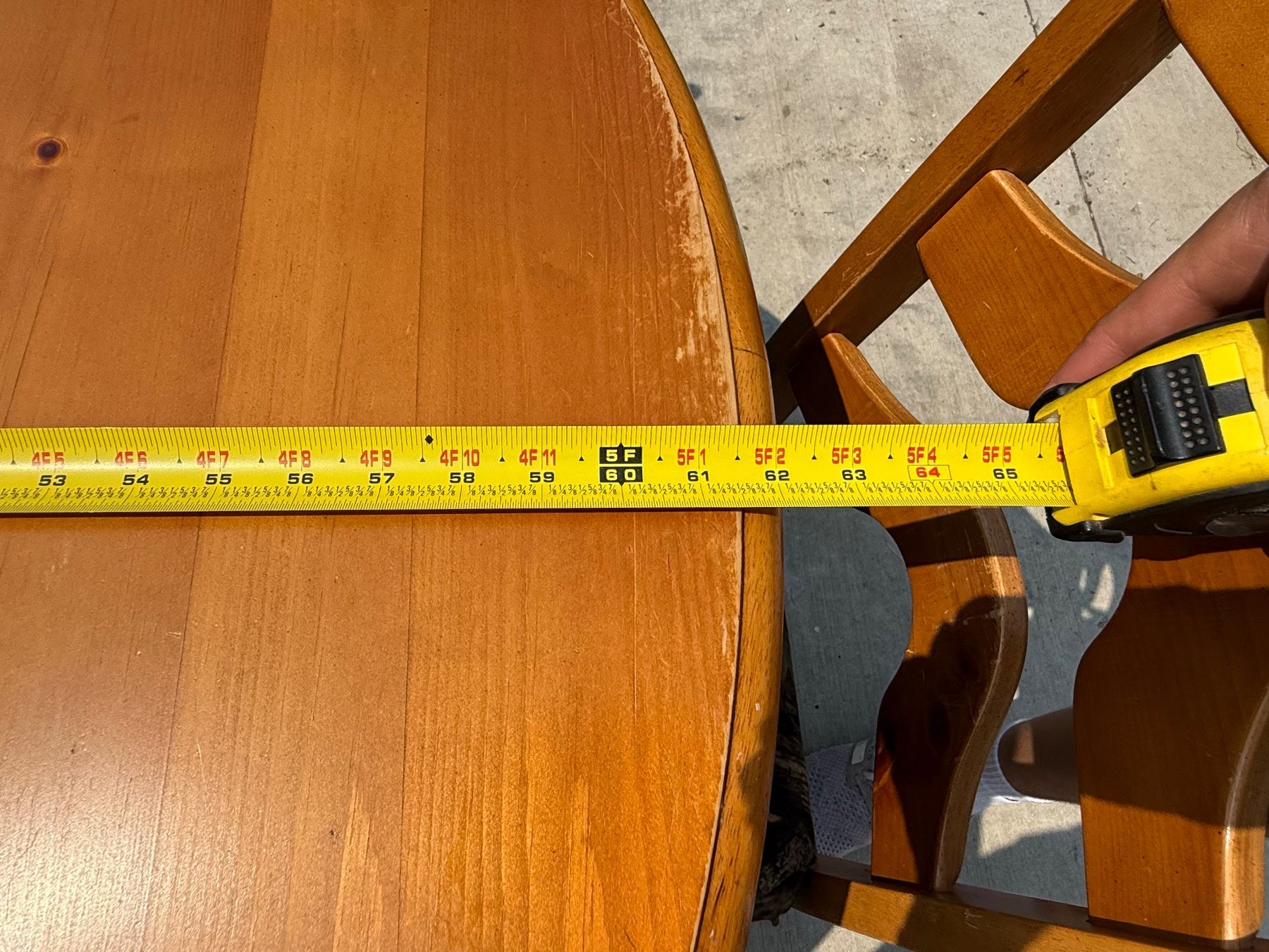 PINE, WITH A LOVELY DESIGN ON THE EDGES; LEAF (18-INCHES) EXTENDS ROUND TABLE TO OVAL; IN EXCELLENT CONDITION!