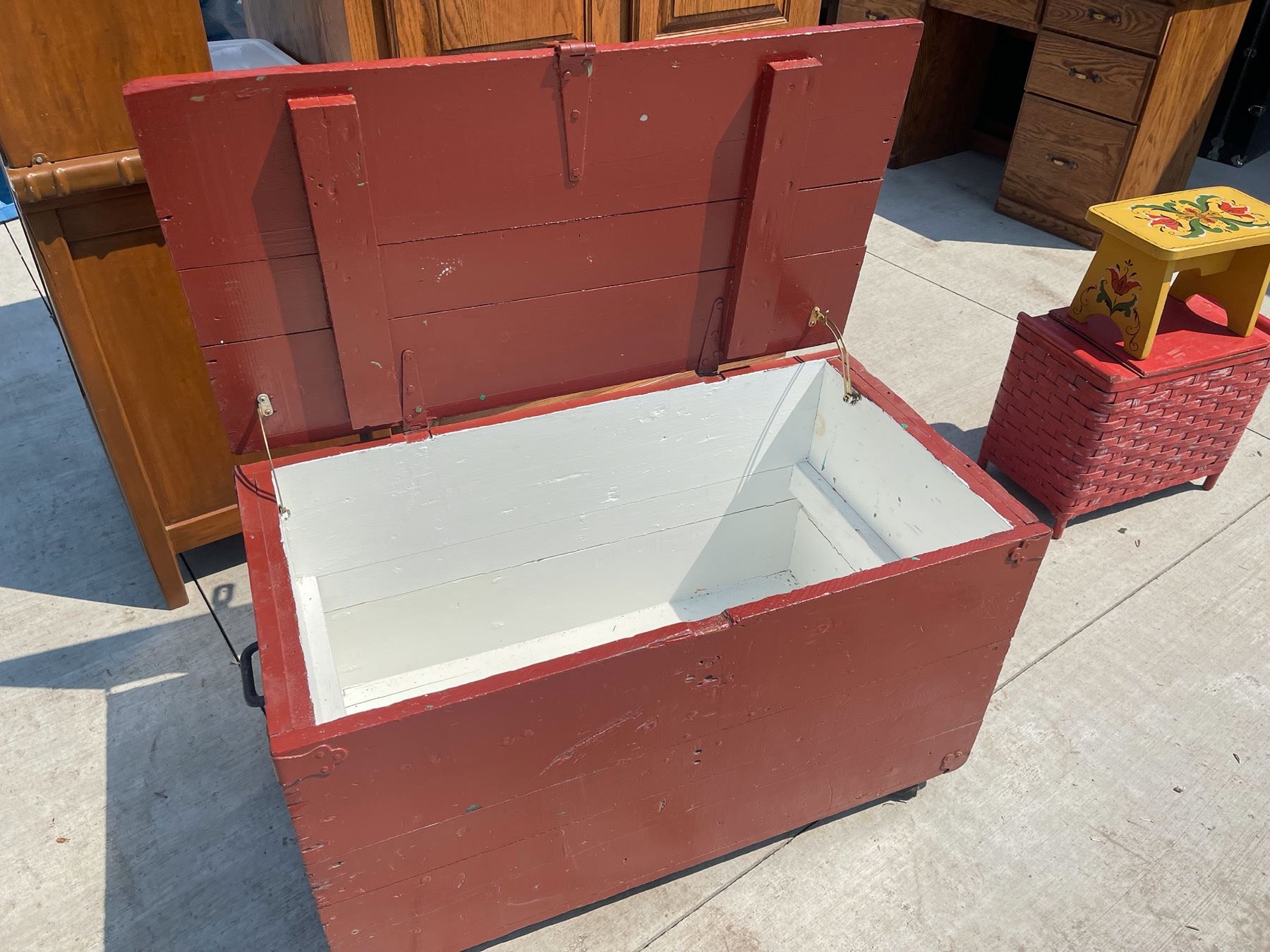 RED TRUNK, RED BASKET, AND YELLOW AND RED ROSEMALLED STEP STOOL