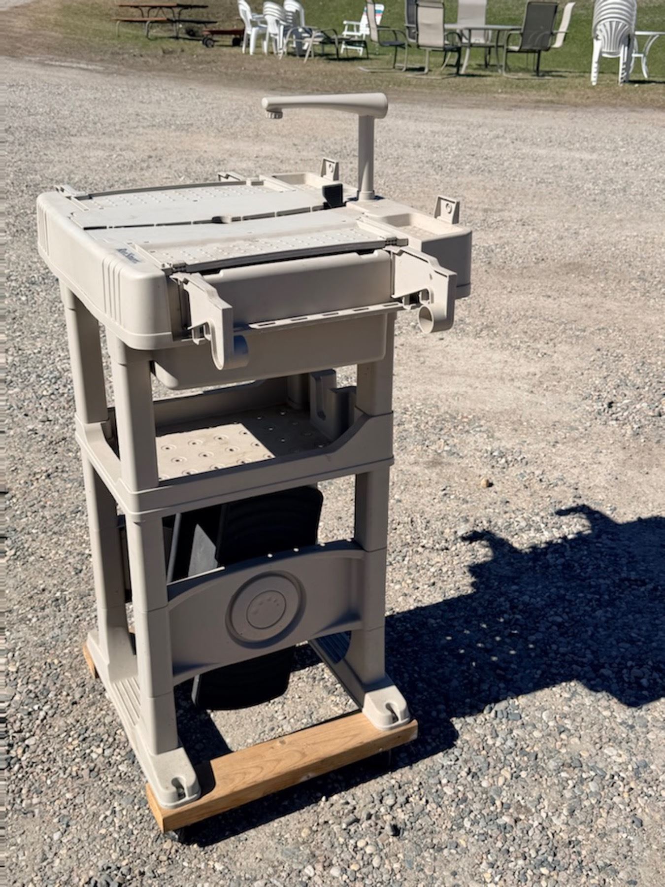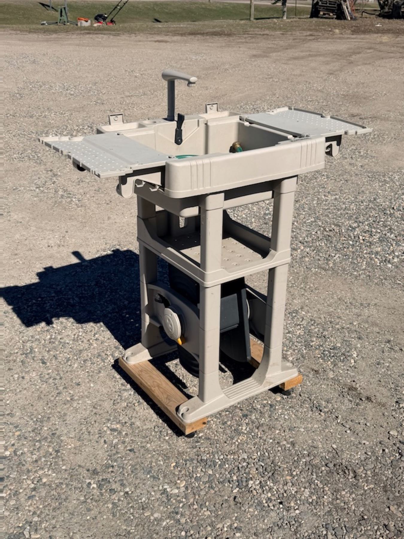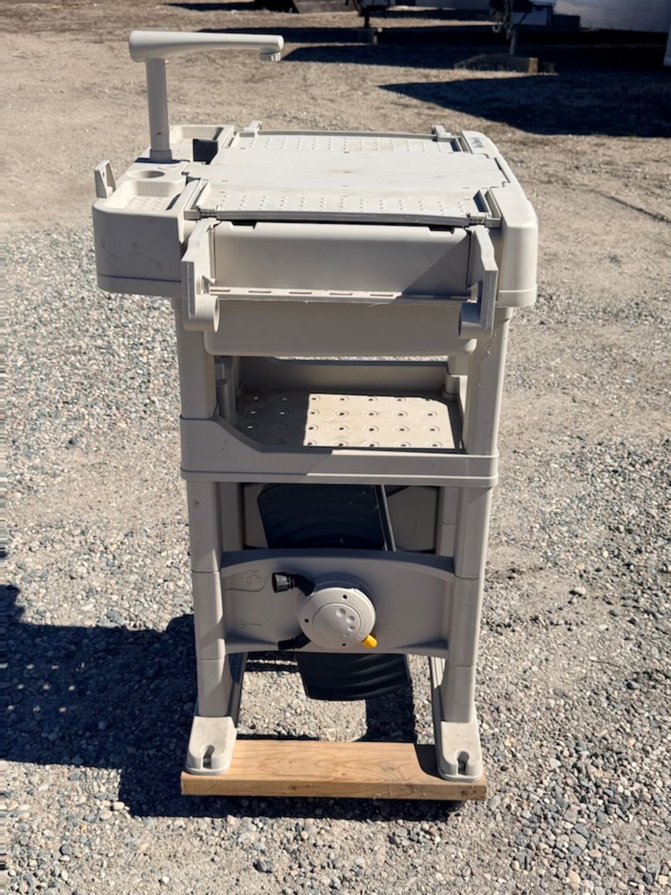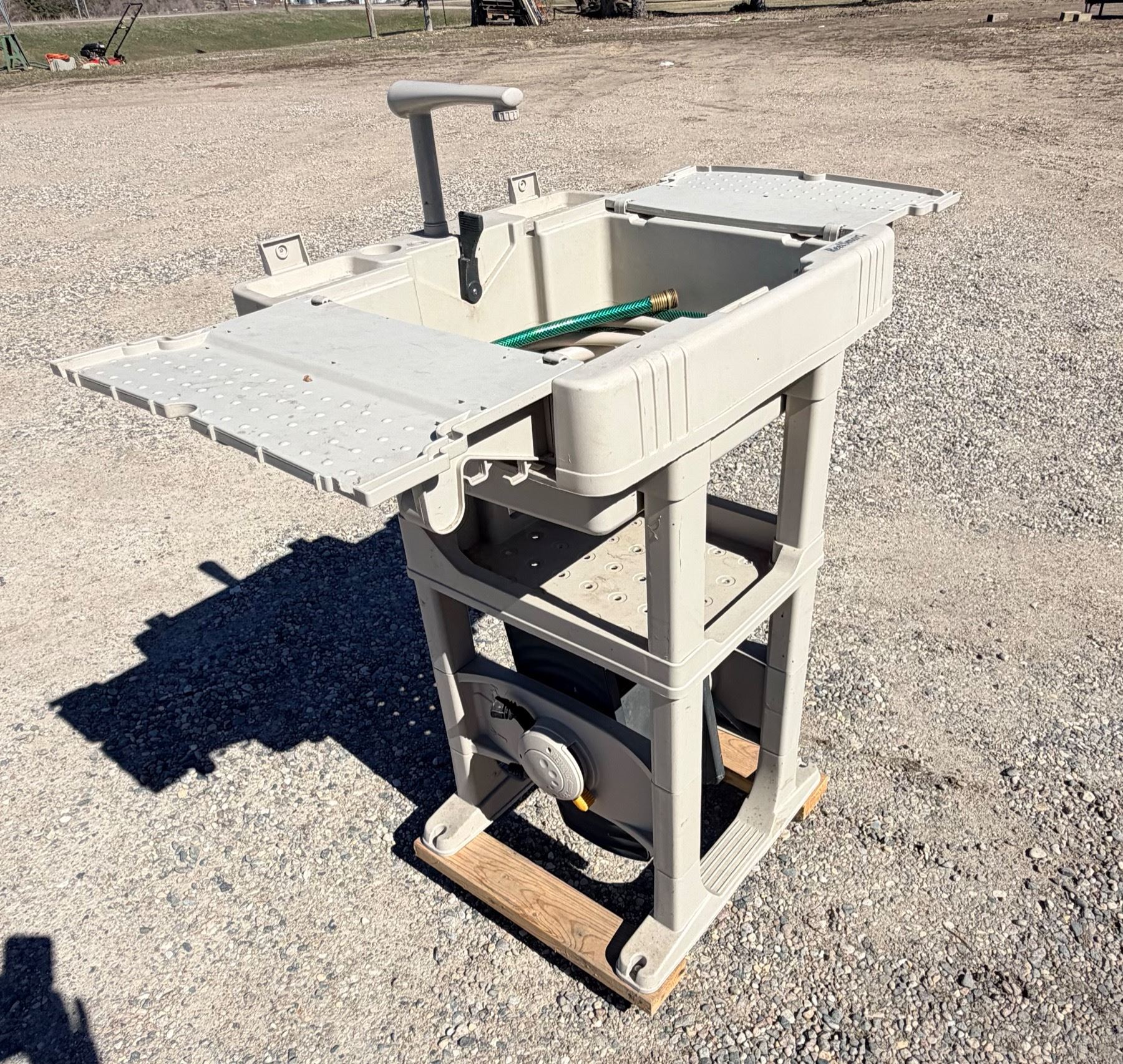 WITH A BUILT-IN HOSE REEL; INCLUDES A SINK BASIN AND AN OVERHEAD FAUCET; CONSTRUCTED FROM DURABLE, WEATHER-RESISTANT PLASTIC