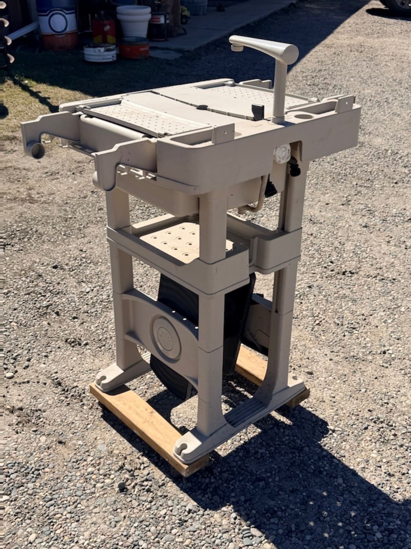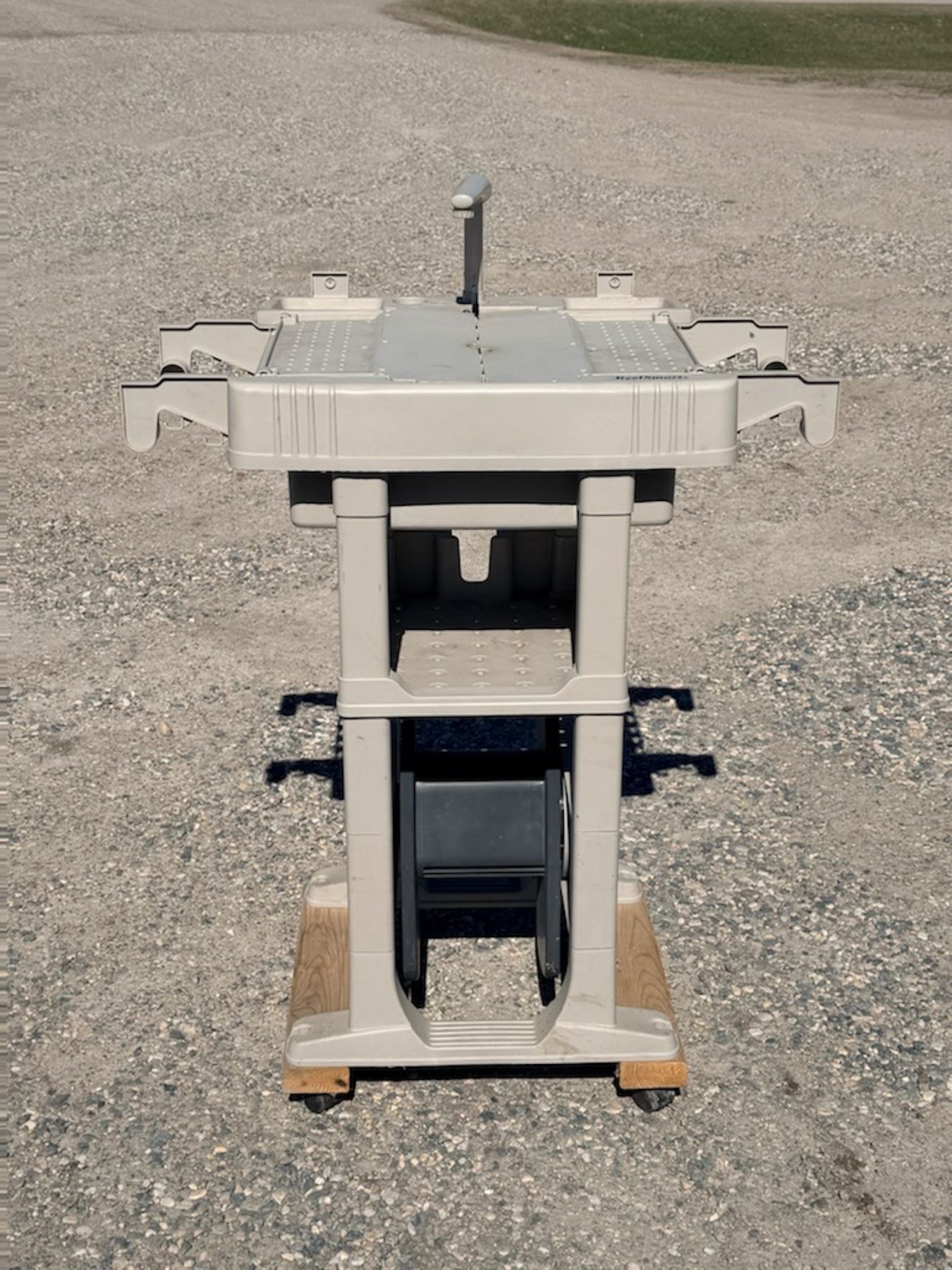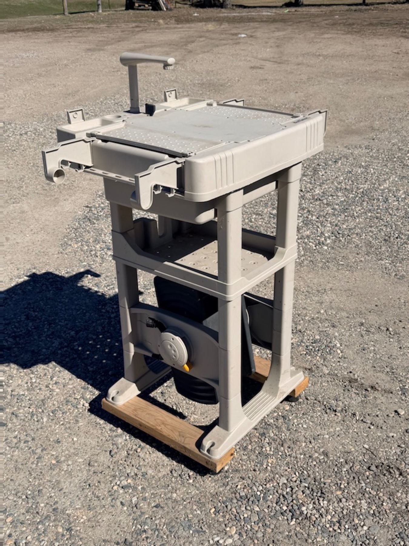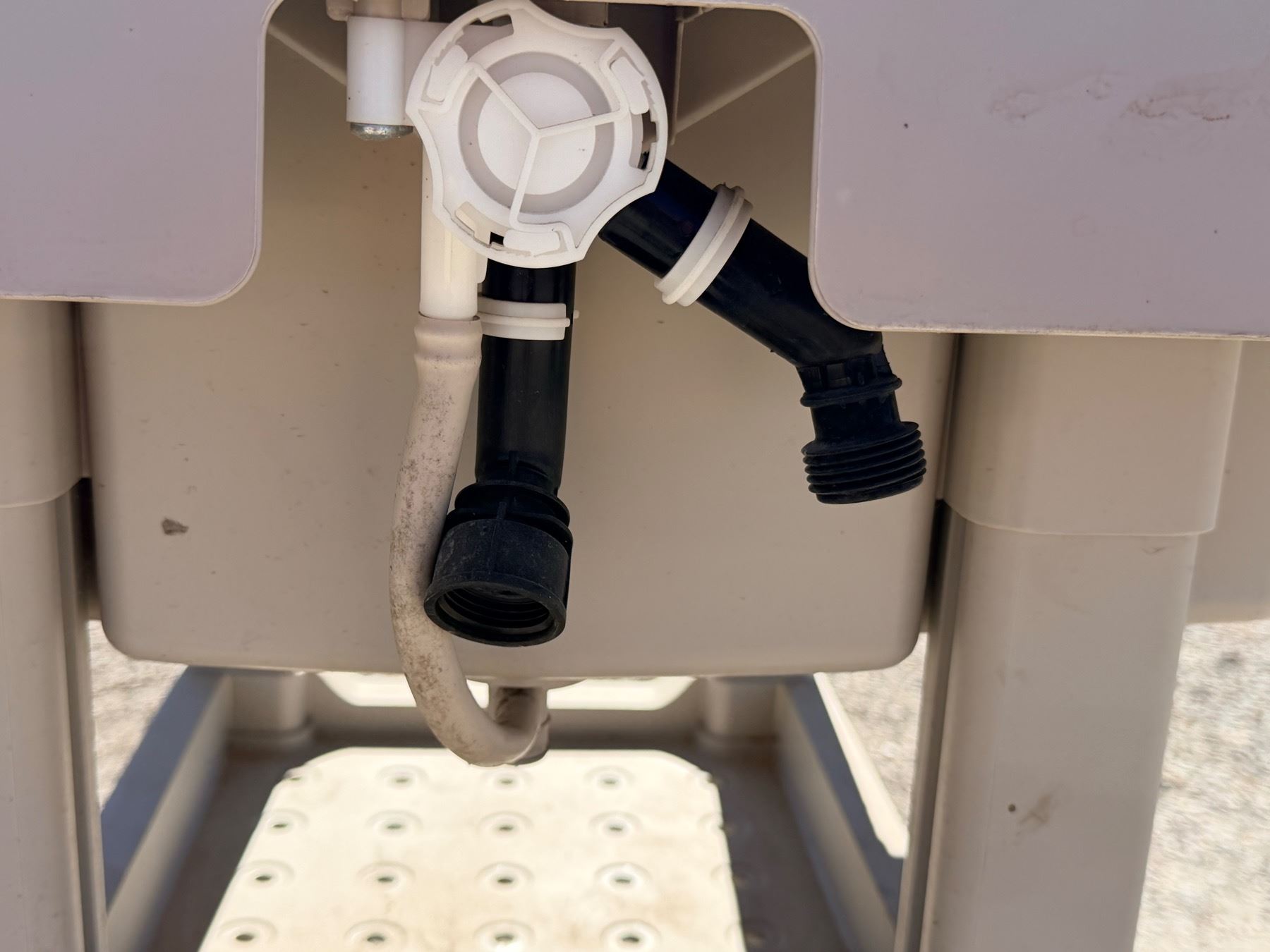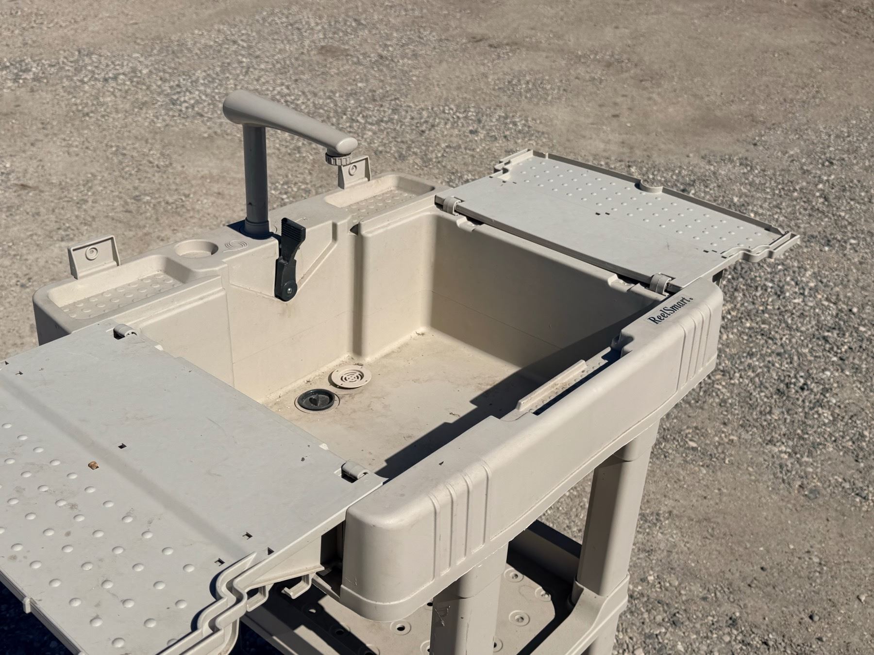 WITH A BUILT-IN HOSE REEL; INCLUDES A SINK BASIN AND AN OVERHEAD FAUCET; CONSTRUCTED FROM DURABLE, WEATHER-RESISTANT PLASTIC