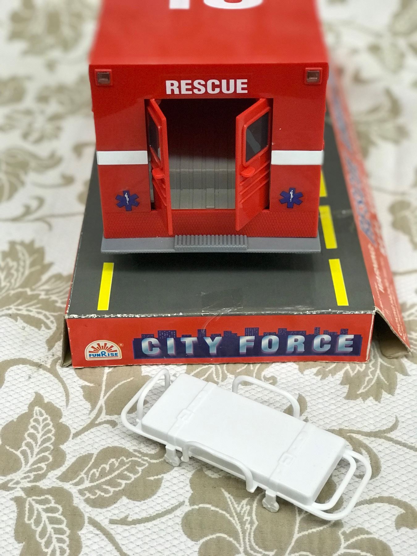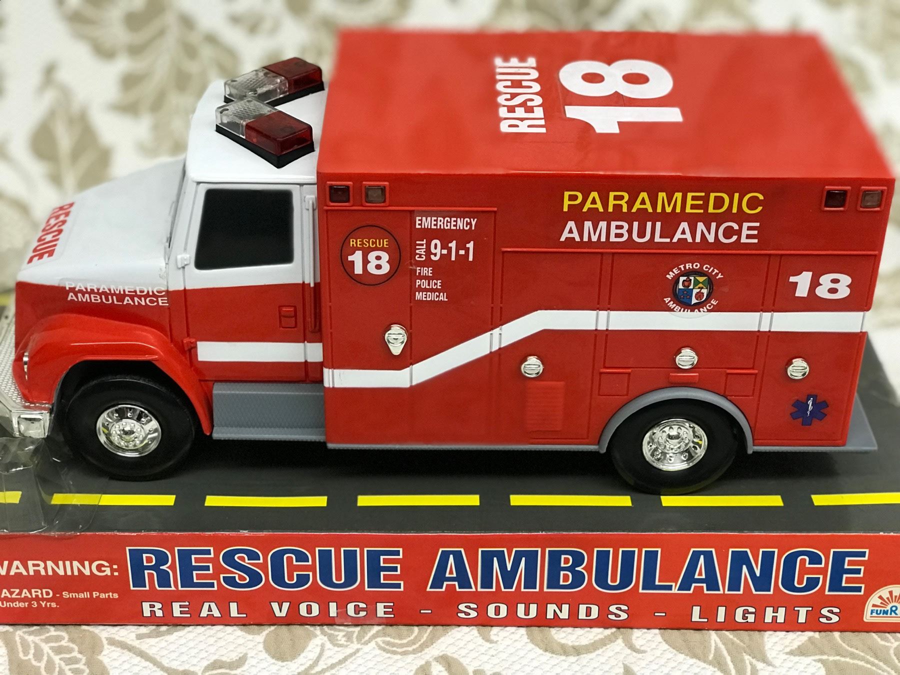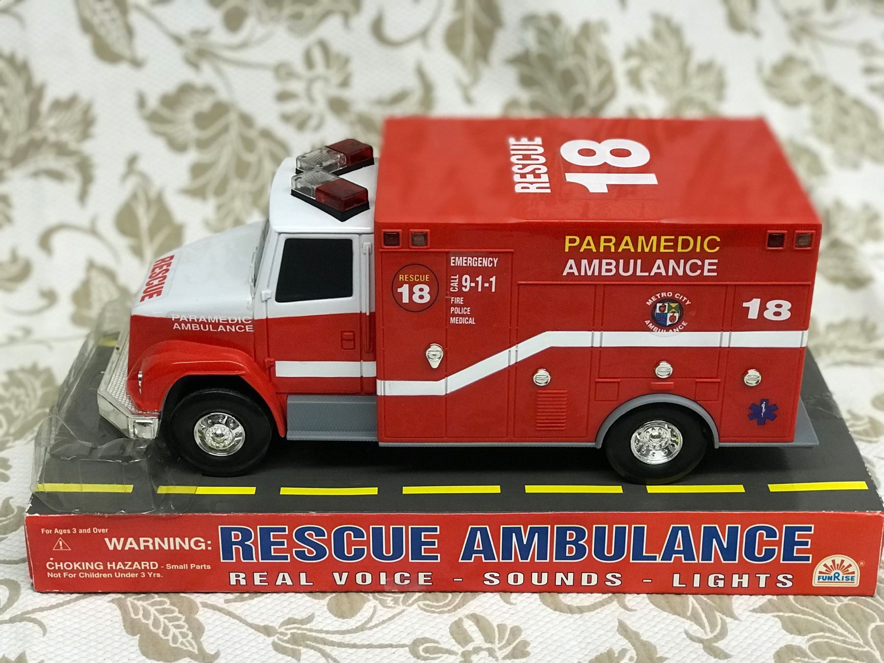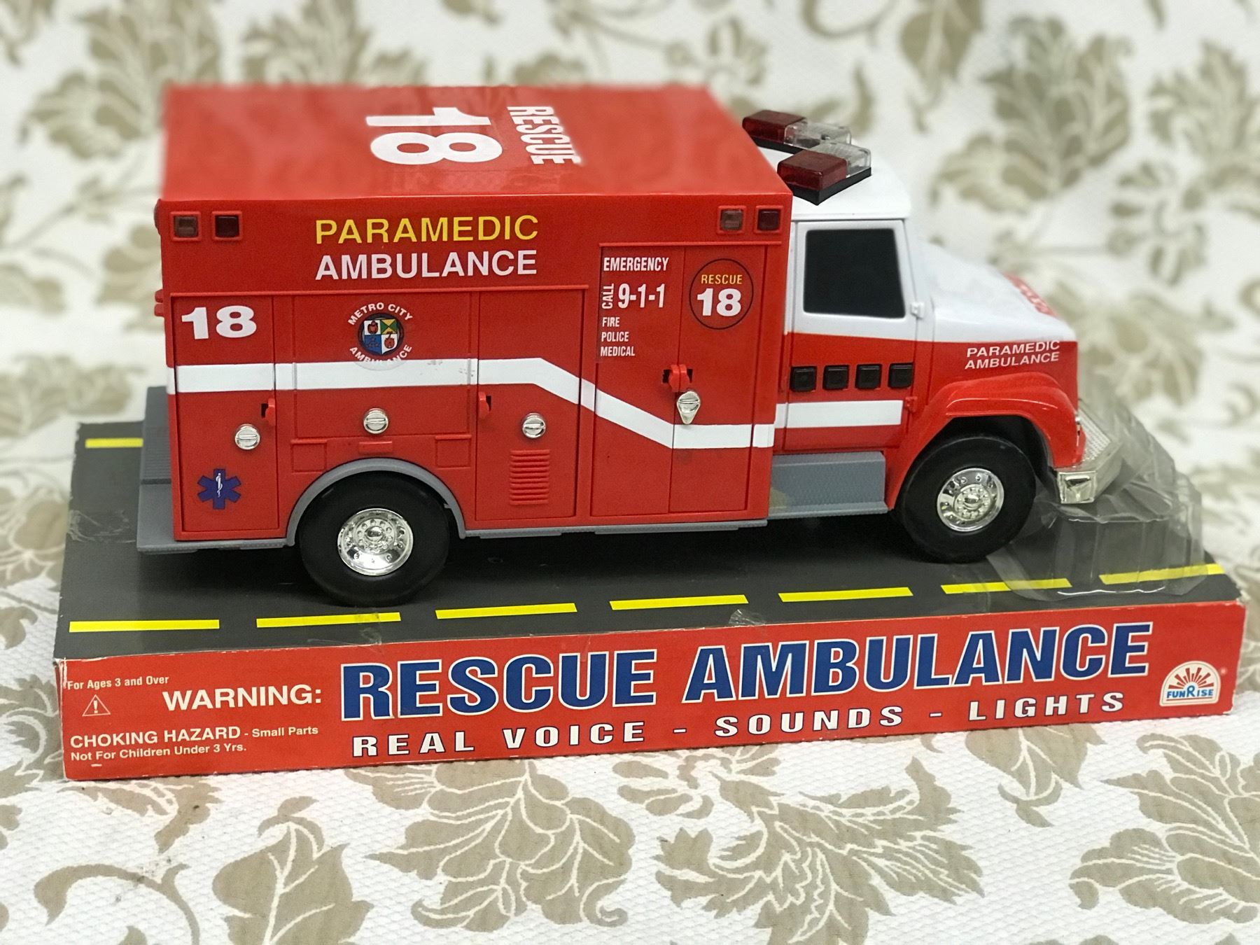 RESCUE AMBULANCE; NEW, IN BOX; REAL VOICE, SOUNDS, LIGHTS, AND TINY COT