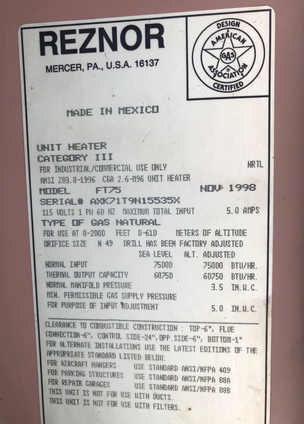 REZNOR INDUSTRIAL 60,750 BTU/HR HEATER - NATURAL GAS - CAN BE CONVERTED TO LP WITH LP CONVERSION KIT (NOT INCLUDED)