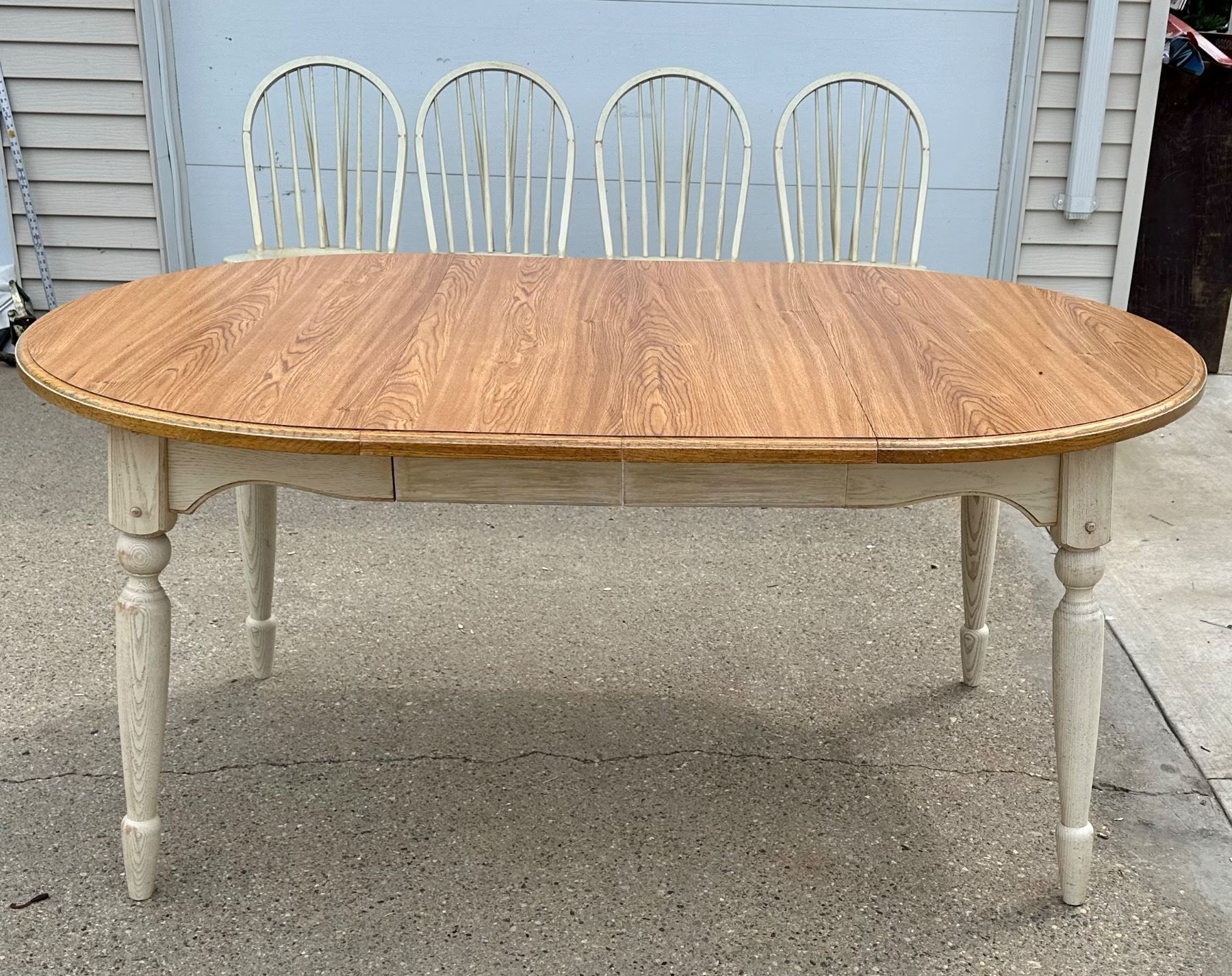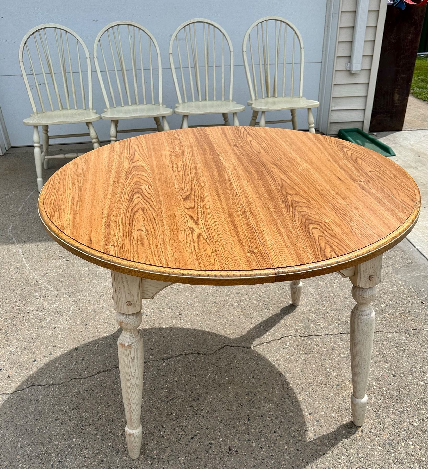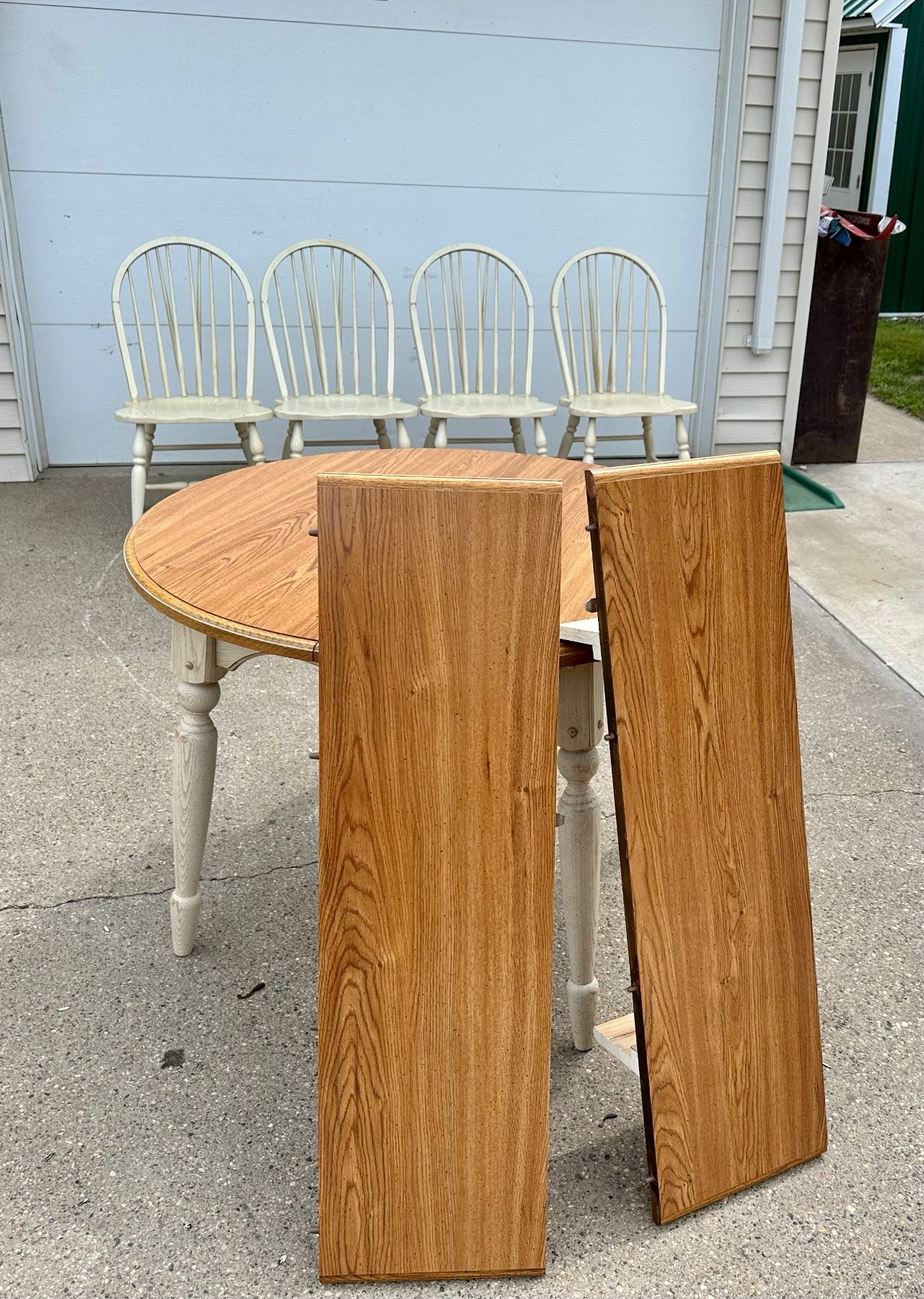 ROUND TABLE WITH TWO LEAVES AND FOUR CHAIRS - WOOD