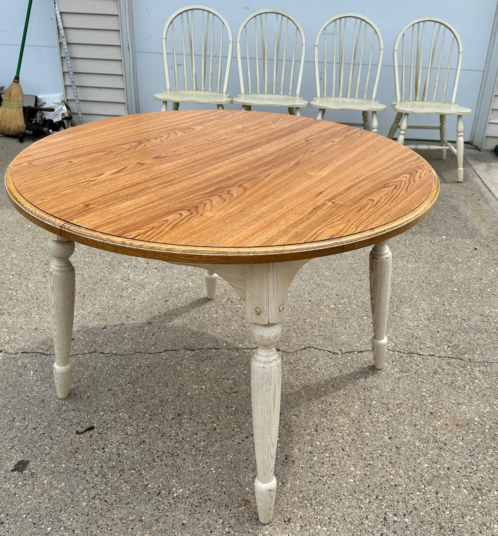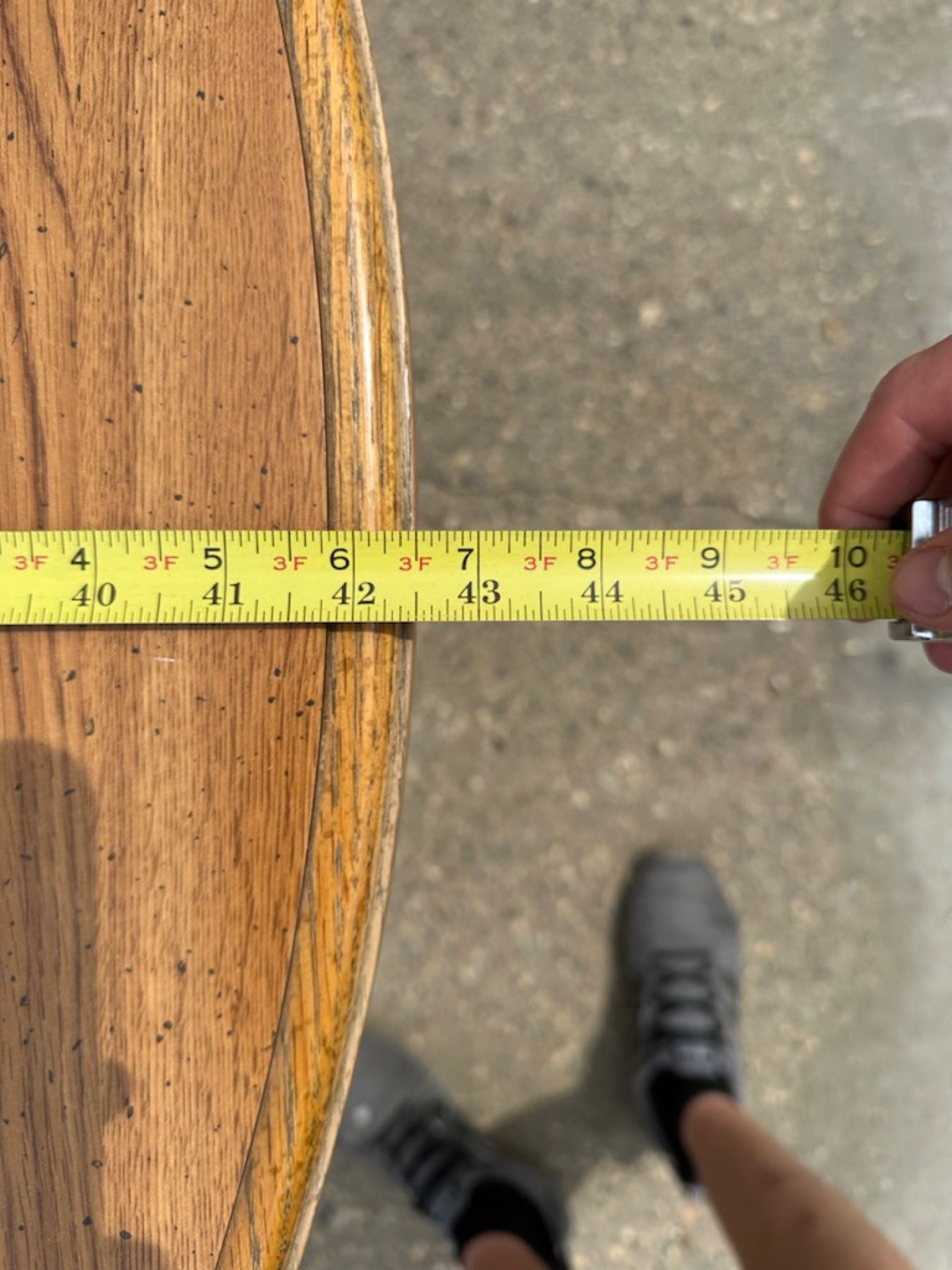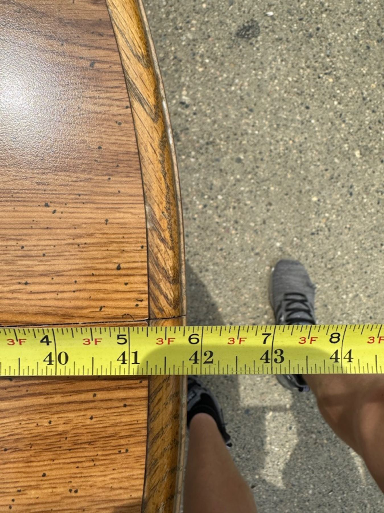 MEASURES APPROXIMATELY  3 FT 6 INCHES DIAMETER; 12-INCH LEAVES EXTEND TABLE TO 4.5 OR 5.5 FT TO FIT EVERYONE!