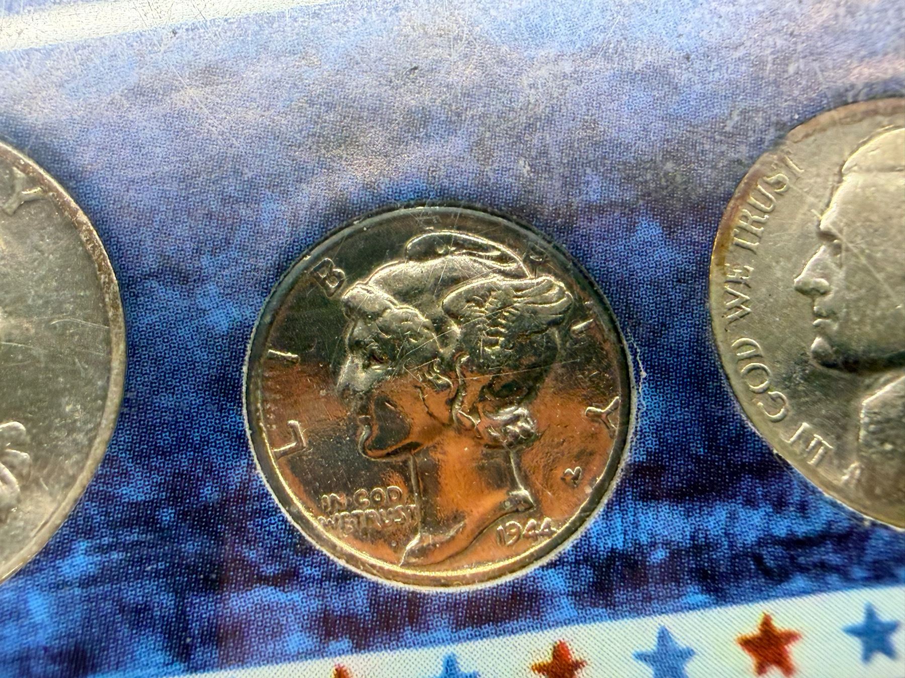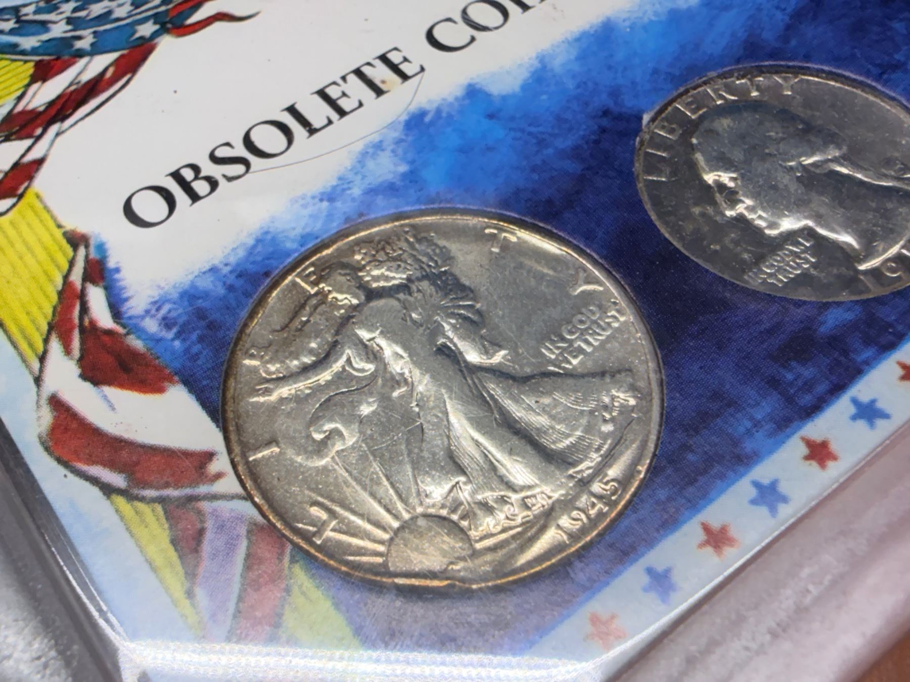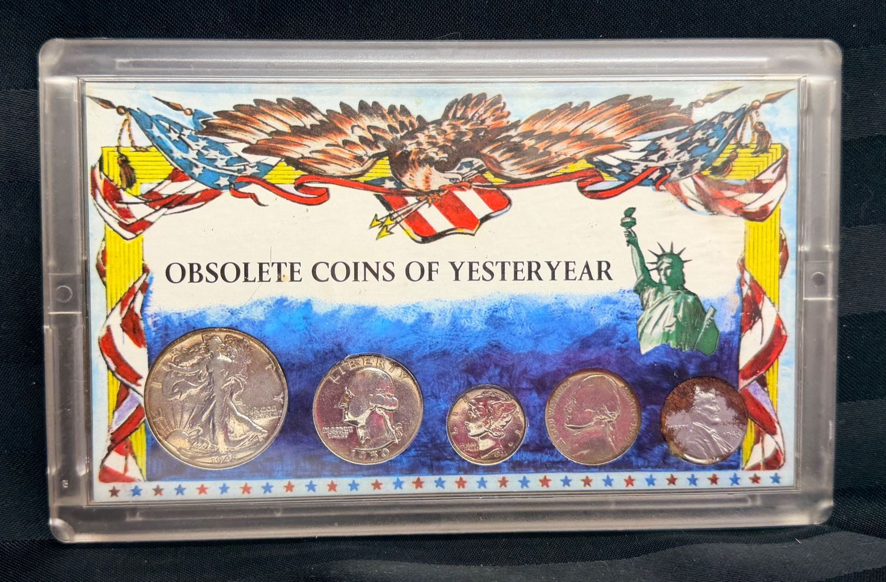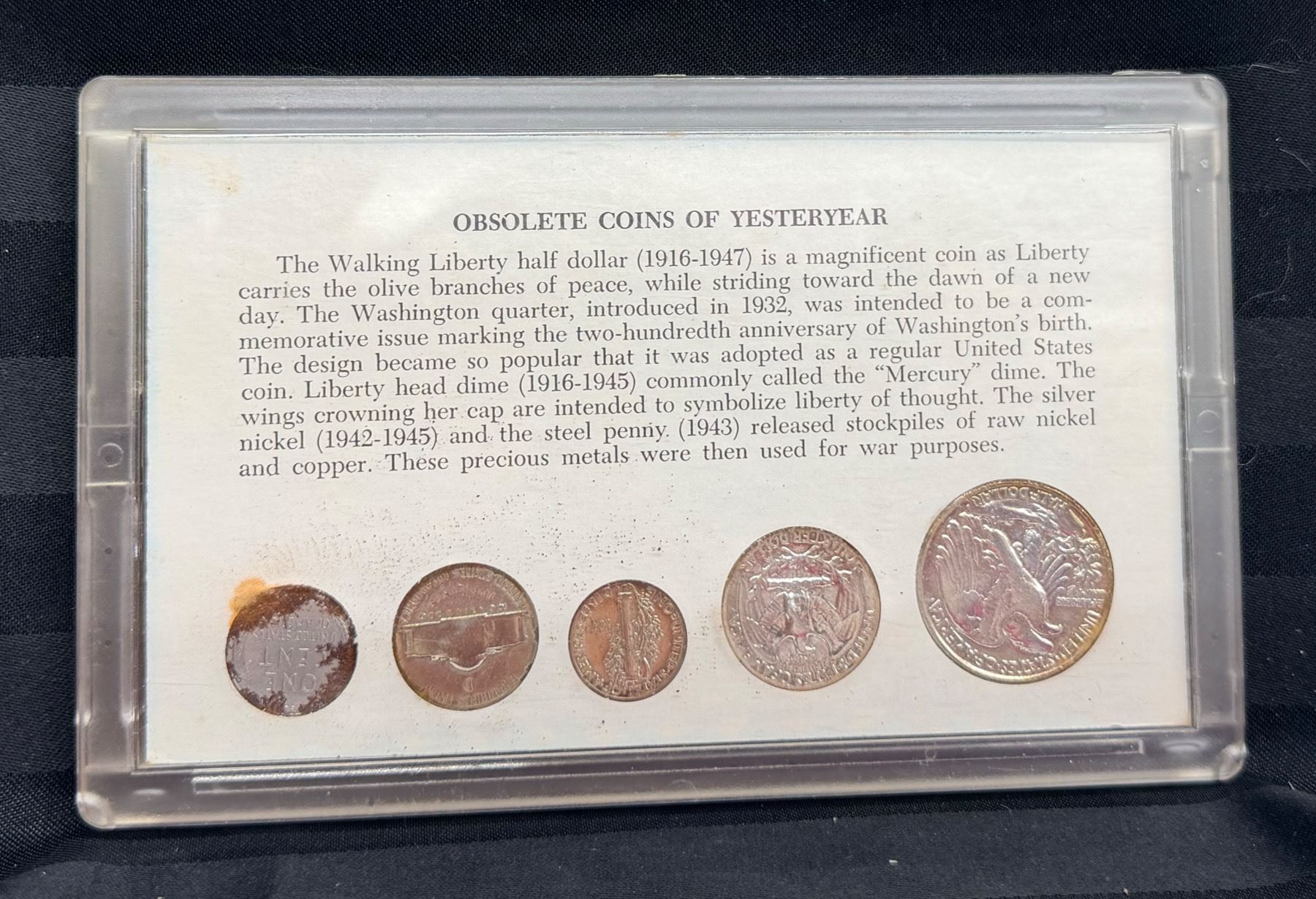 WALKING LIBERTY SILVER HALF DOLLAR - 1945, WASHINGTON SILVER QUARTER - 1950; MERCURY SILVER DIME - 1955; SILVER WAR NICKEL - 1944D; ZINC PENNY 1943