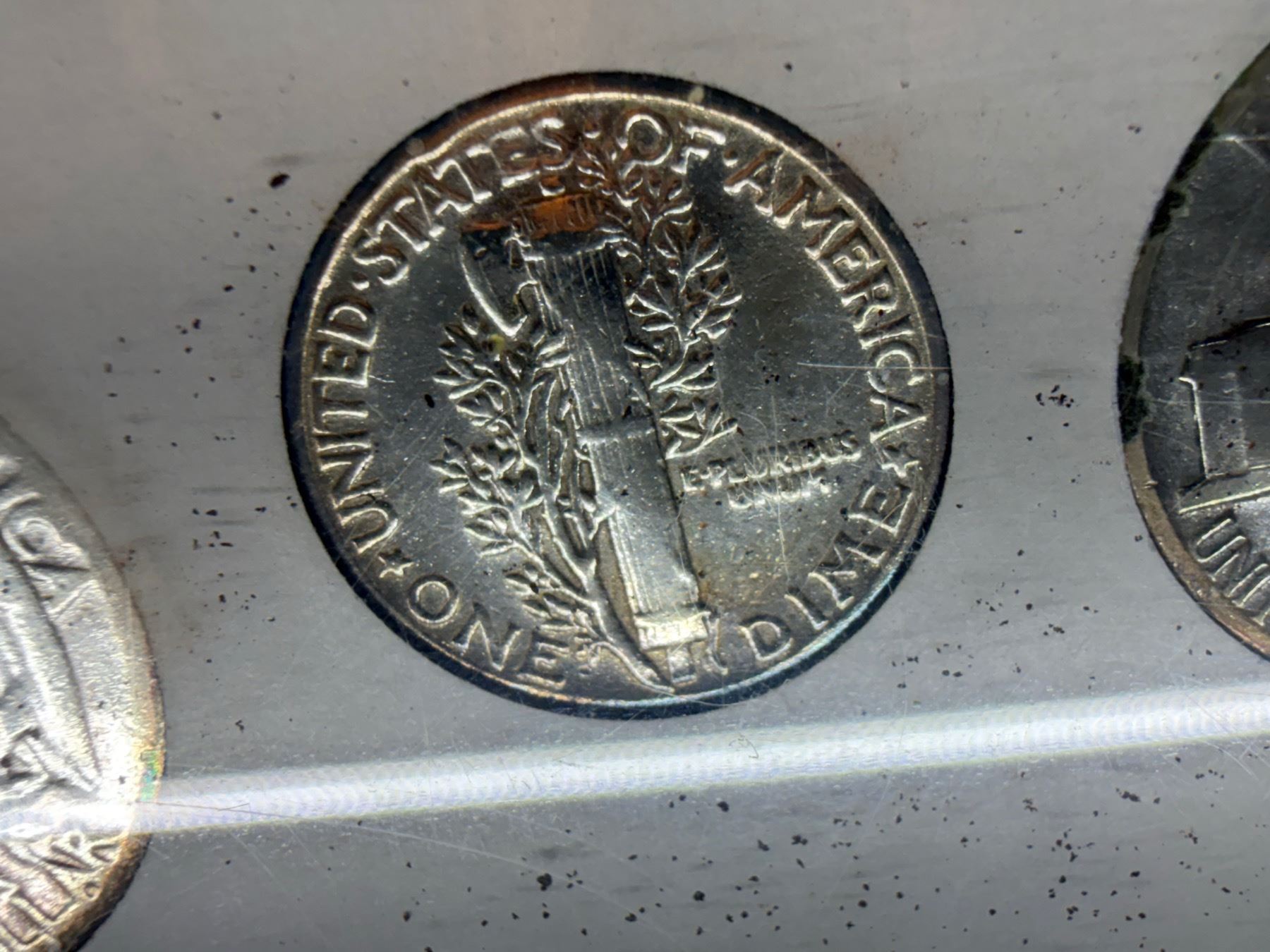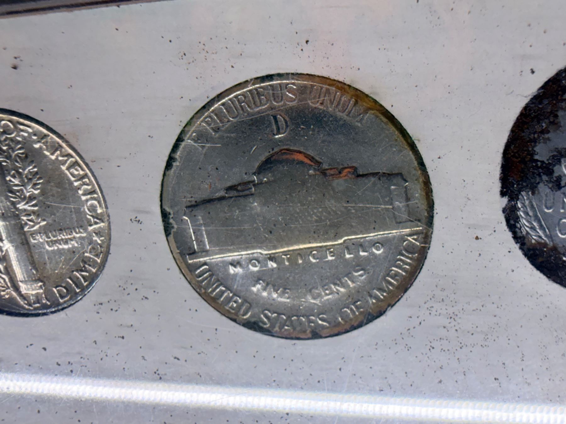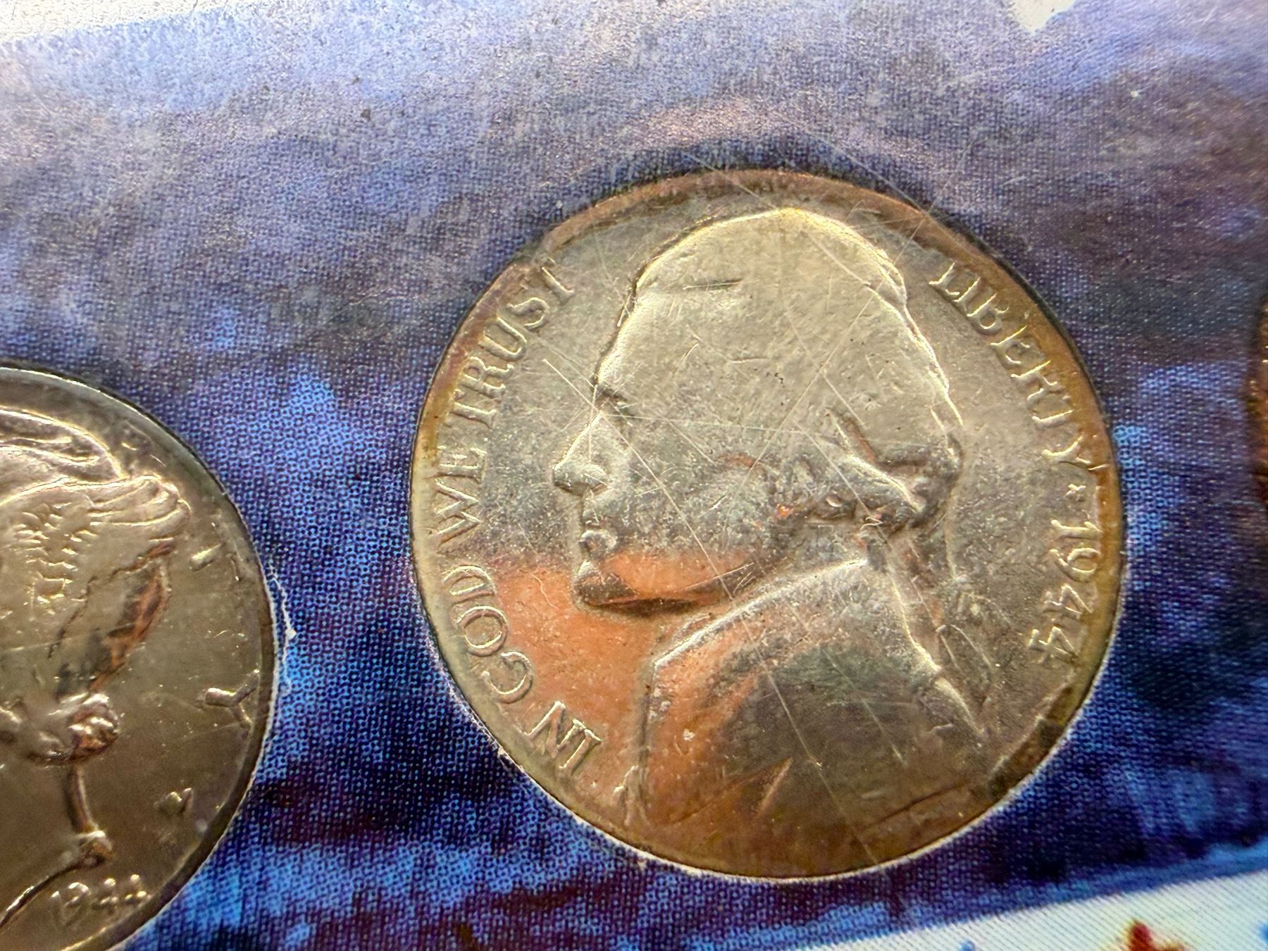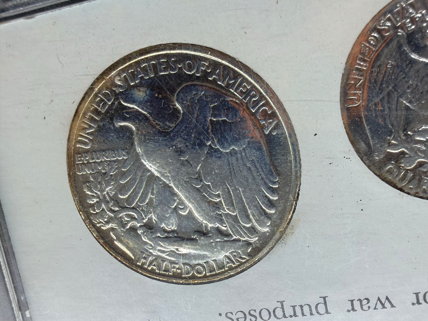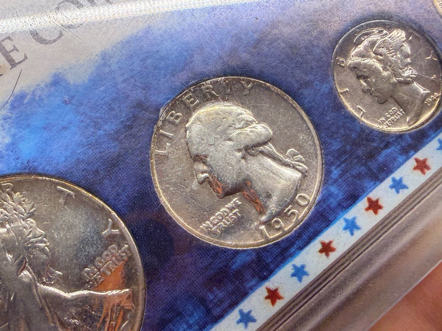 WALKING LIBERTY SILVER HALF DOLLAR - 1945, WASHINGTON SILVER QUARTER - 1950; MERCURY SILVER DIME - 1955; SILVER WAR NICKEL - 1944D; ZINC PENNY 1943