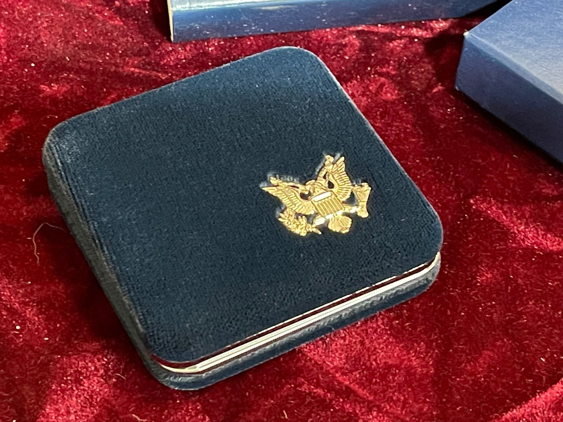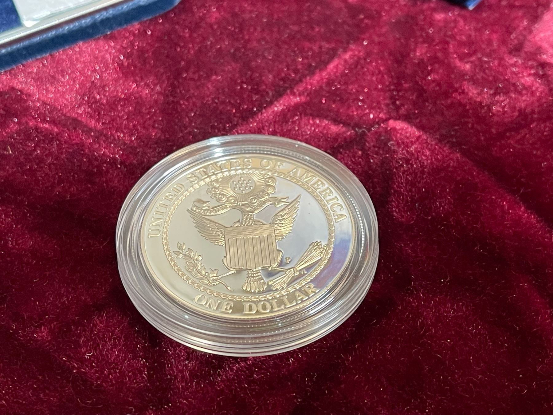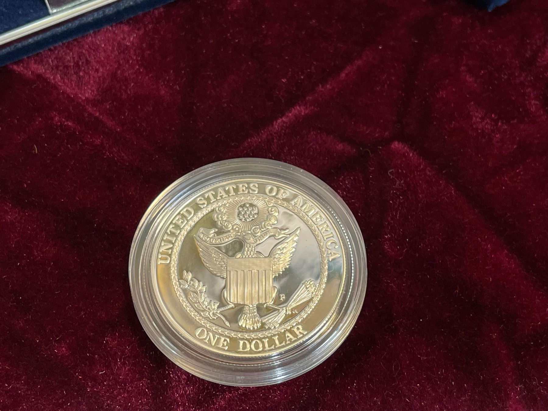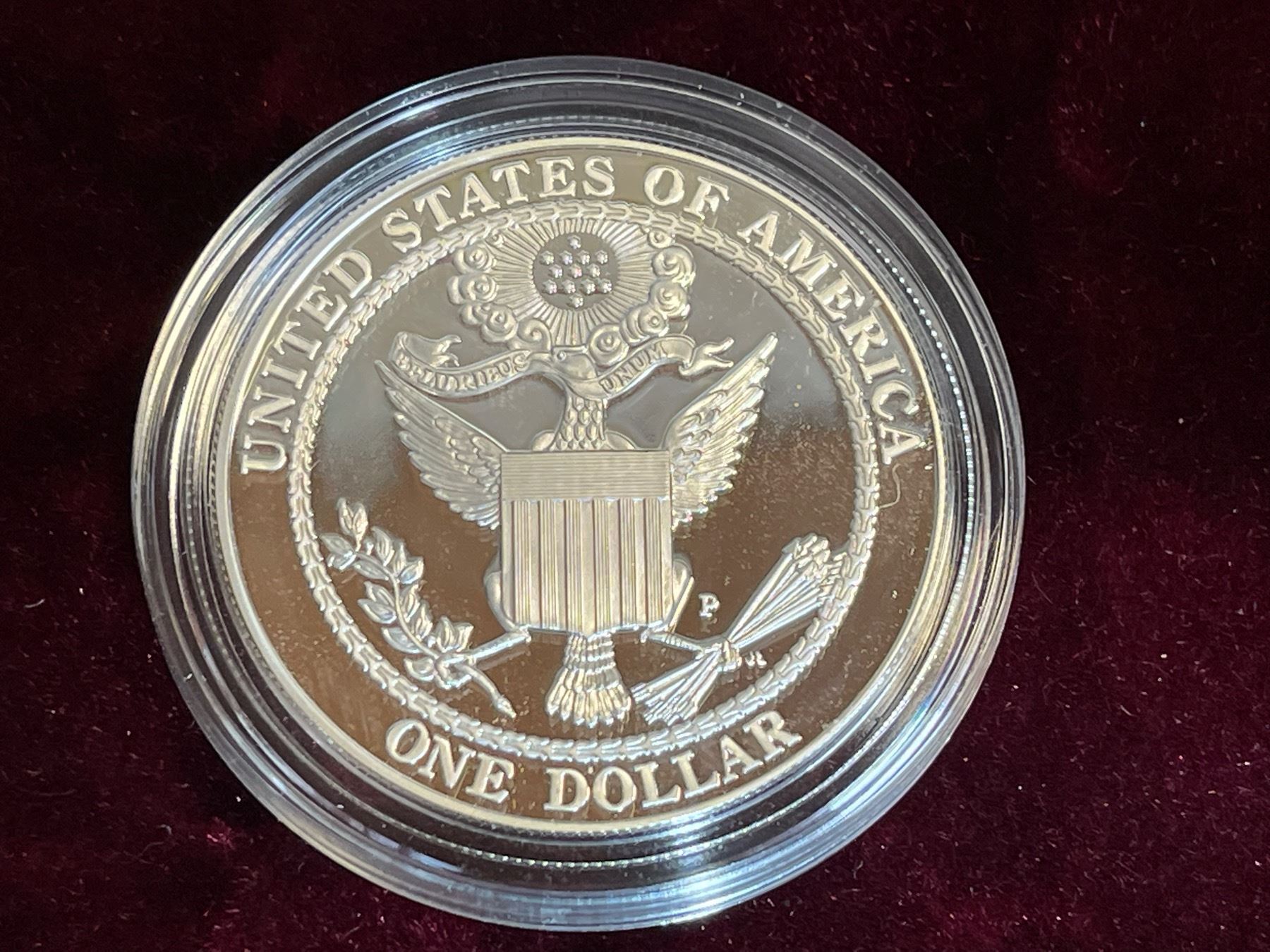 US SILVER DOLLAR PROOF; PHILADELPHIA MINT; 26.73 GRAMS; 90 PERCENT SILVER, 10 PERCENT COPPER; IN PLASTIC PROTECTIVE DISPLAY CASE, VELVET DISPLAY JEWEL BOX AND DECORATIVE STORAGE BOX