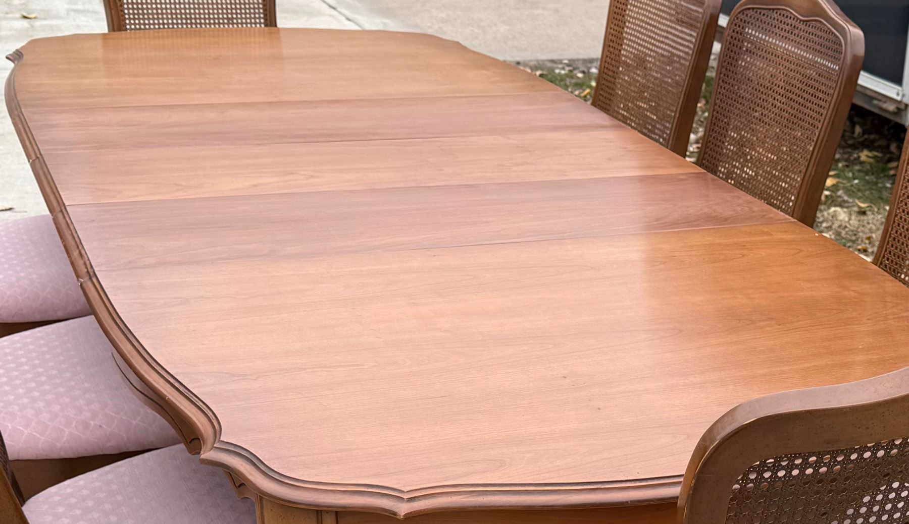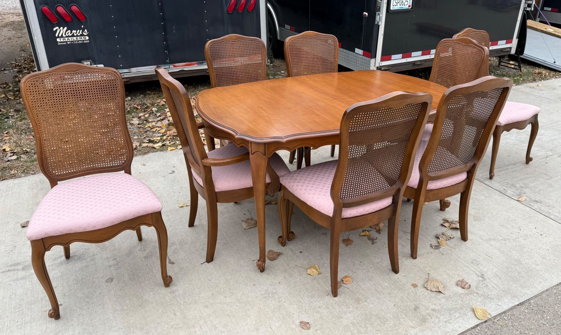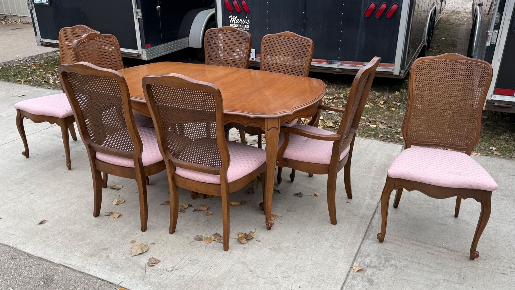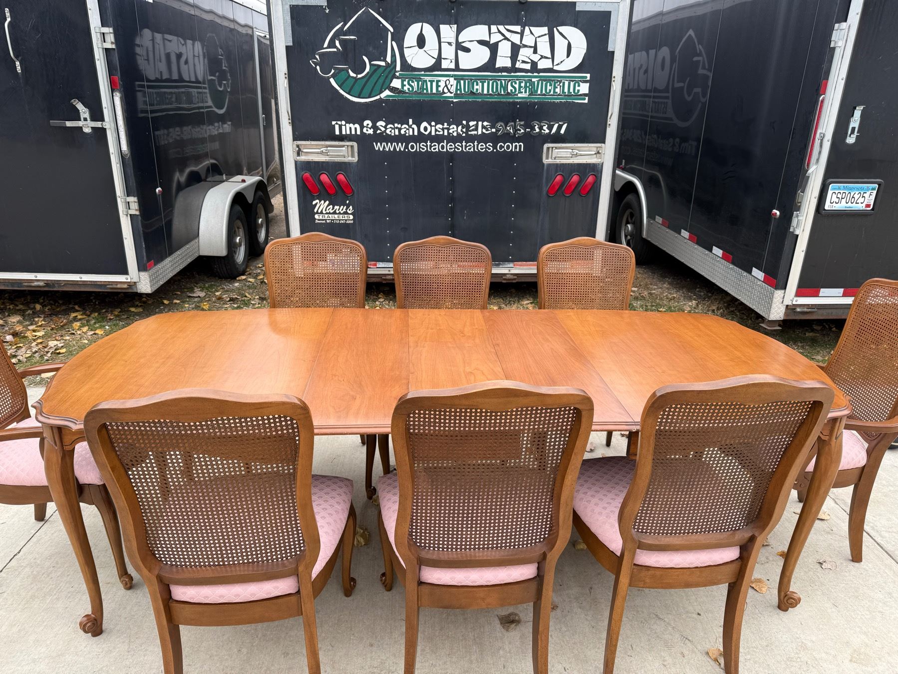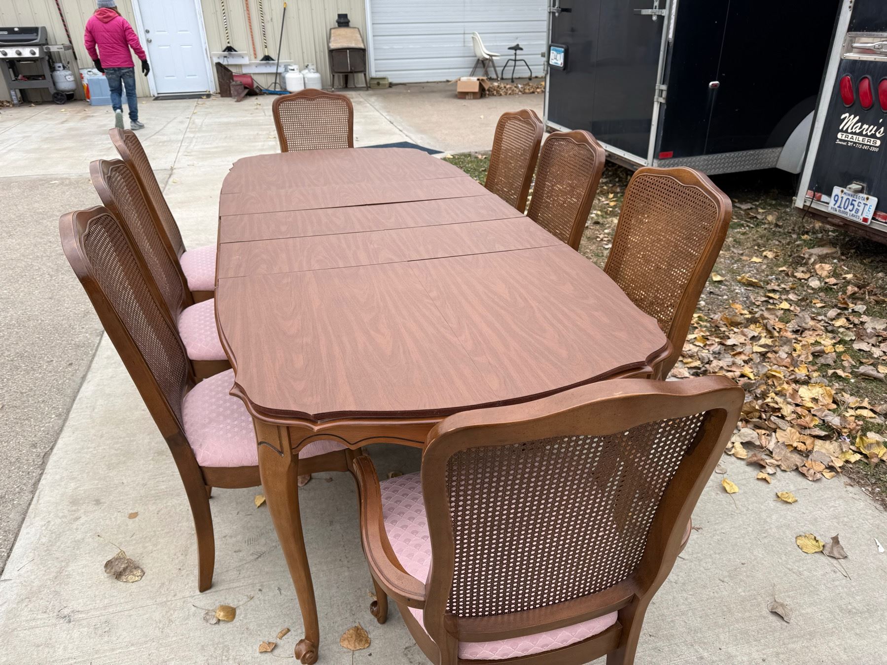 SOLID WOOD TABLE WITH EIGHT (8) CHAIRS AND THREE (3) LEAVES