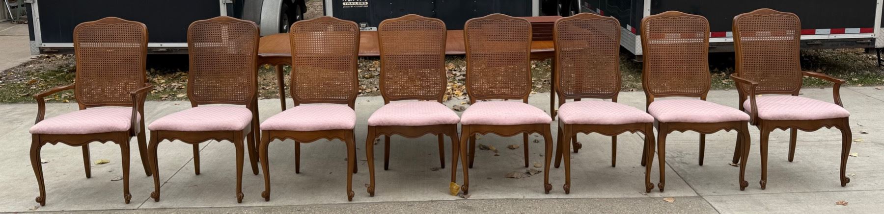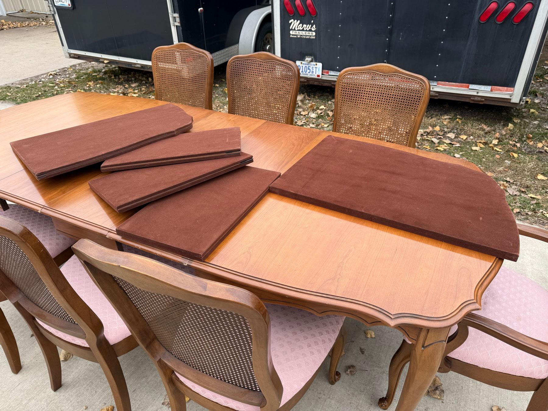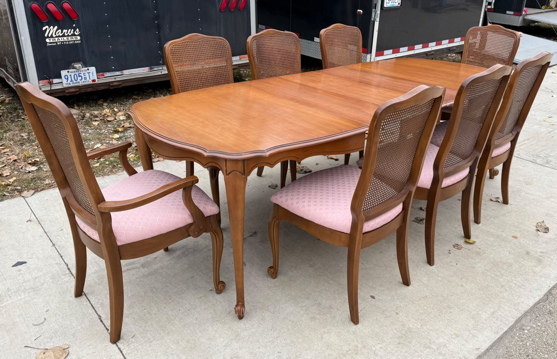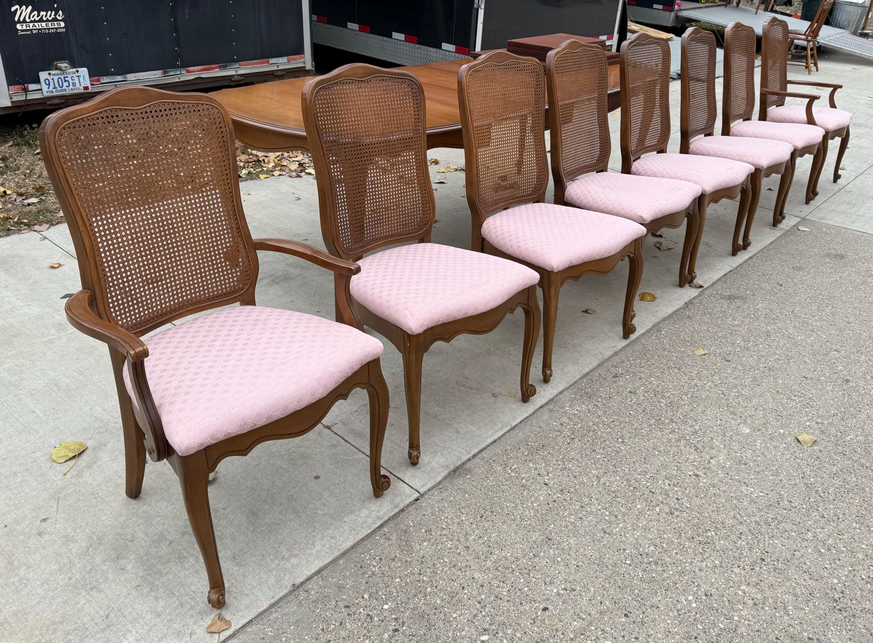 THIS GORGEOUS TABLE COMES WITH TWO CAPTAIN'S CHAIRS AND SIX STRAIGHT BACK CHAIRS; THE TABLE ALSO HAS TABLE PADS THAT ARE FITTED TO EXACT FORM AND SIZE OF THE TABLE; EACH LEAF ALSO HAS A PAD THAT FITS EACH LEAF