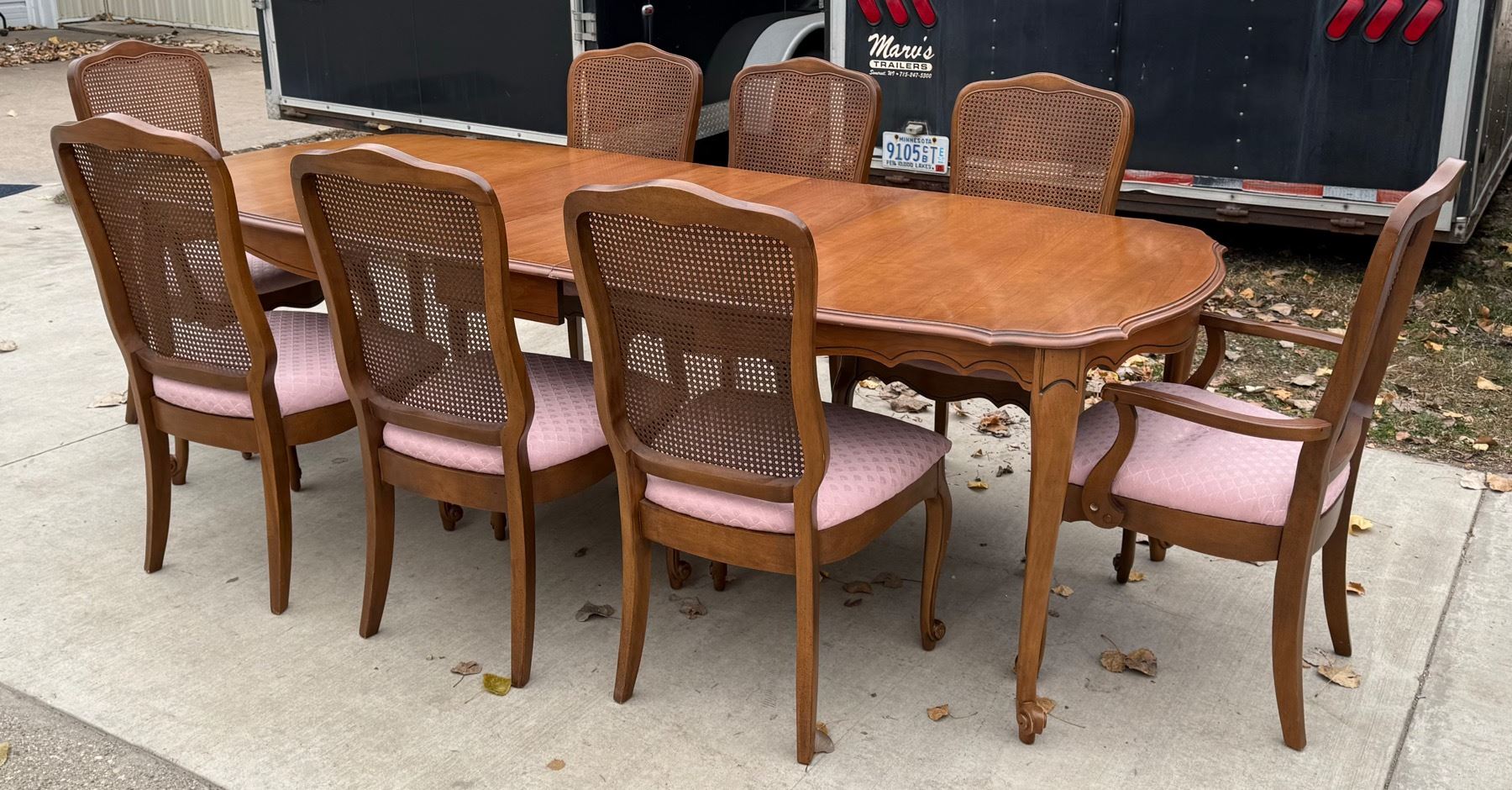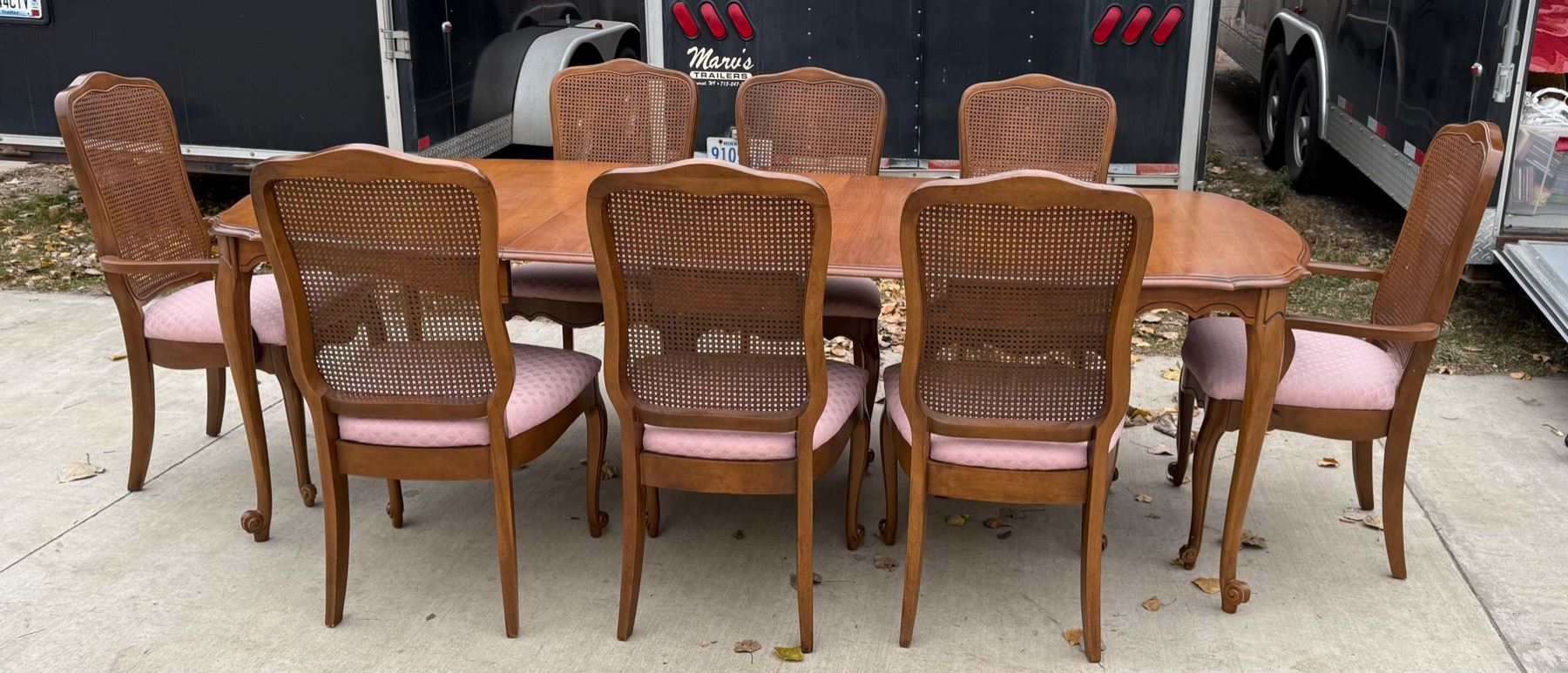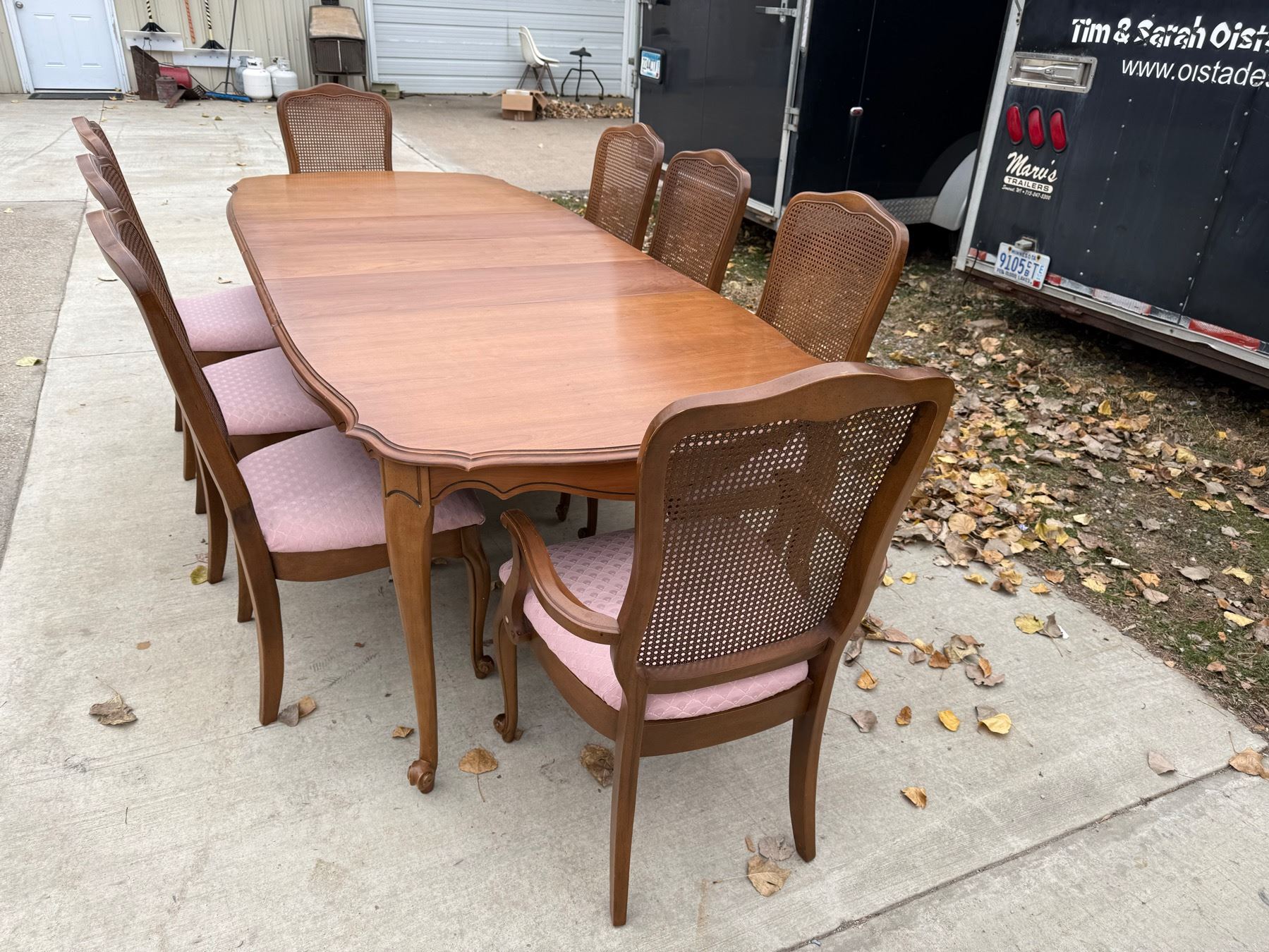 THIS GORGEOUS TABLE COMES WITH TWO CAPTAIN'S CHAIRS AND SIX STRAIGHT BACK CHAIRS; THE TABLE ALSO HAS TABLE PADS THAT ARE FITTED TO EXACT FORM AND SIZE OF THE TABLE; EACH LEAF ALSO HAS A PAD THAT FITS EACH LEAF