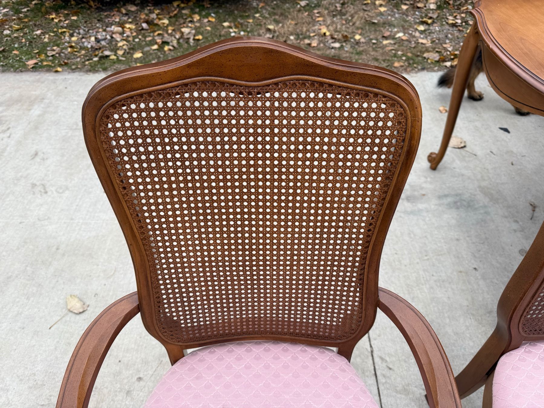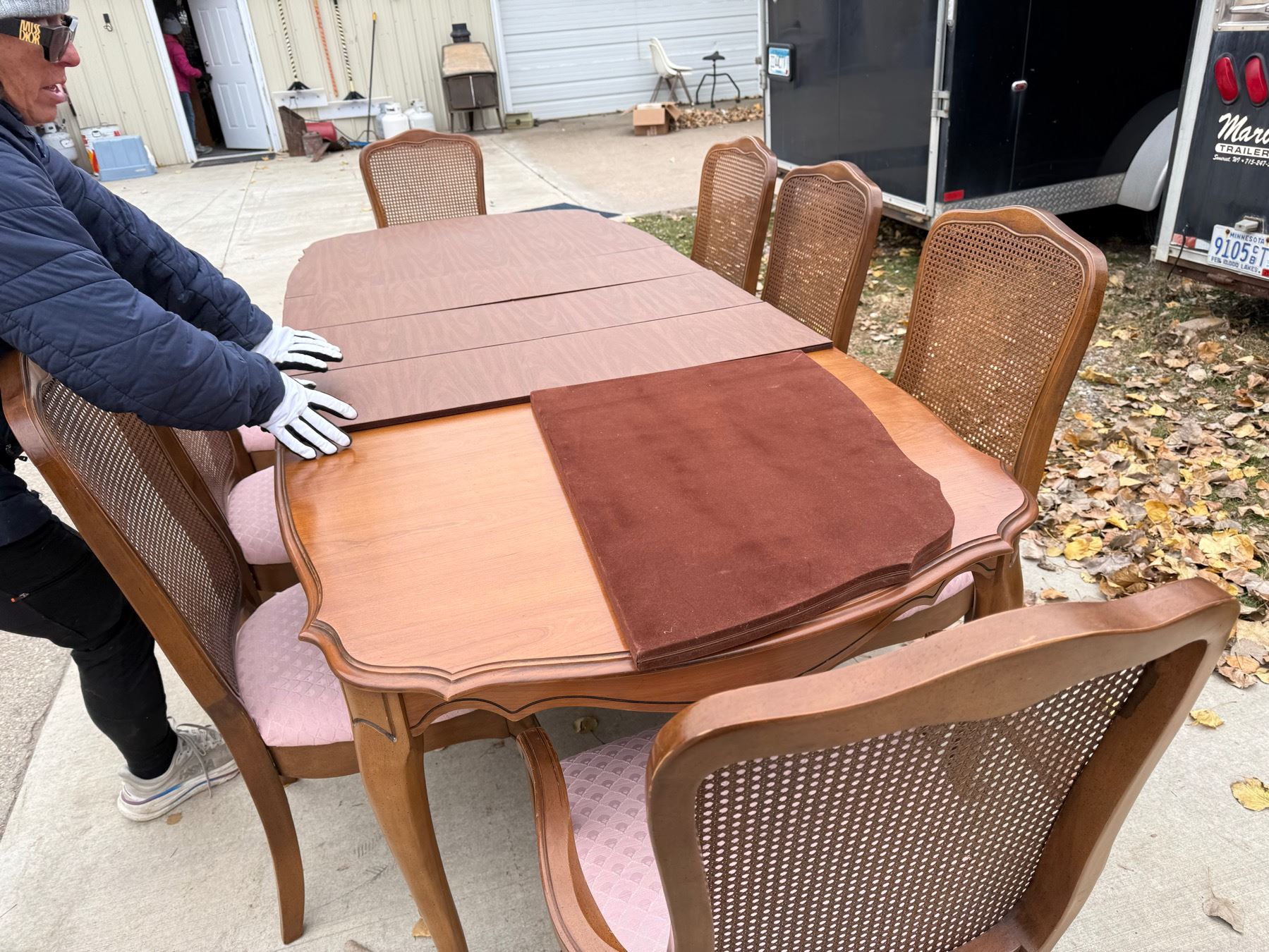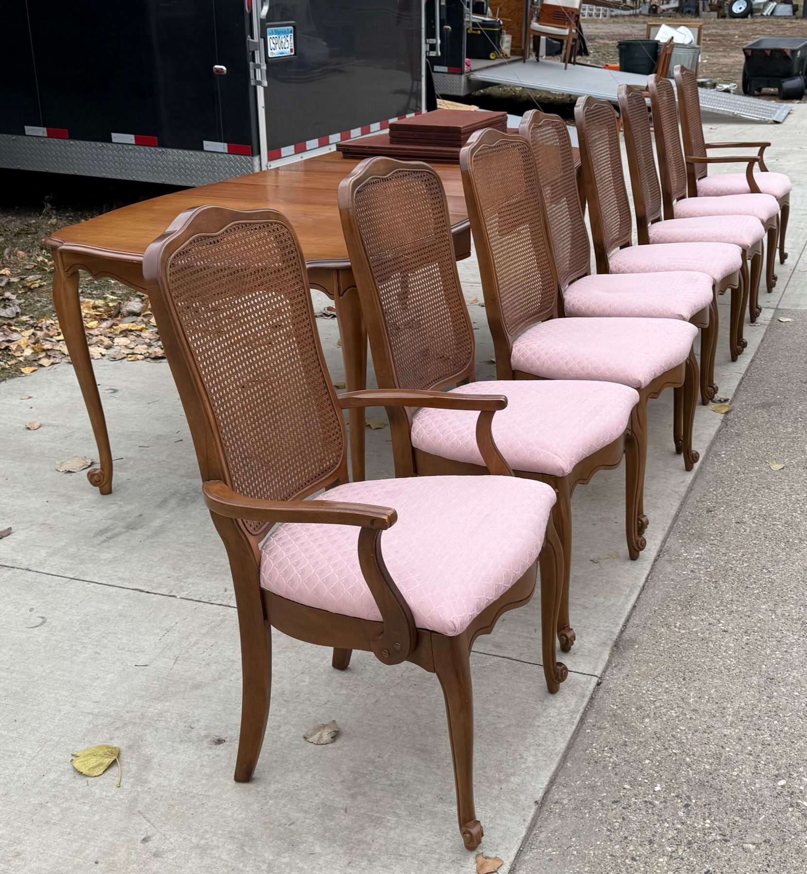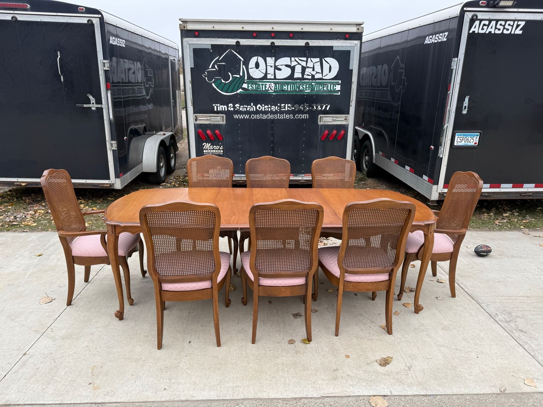THIS GORGEOUS TABLE COMES WITH TWO CAPTAIN'S CHAIRS AND SIX STRAIGHT BACK CHAIRS; THE TABLE ALSO HAS TABLE PADS THAT ARE FITTED TO EXACT FORM AND SIZE OF THE TABLE; EACH LEAF ALSO HAS A PAD THAT FITS EACH LEAF