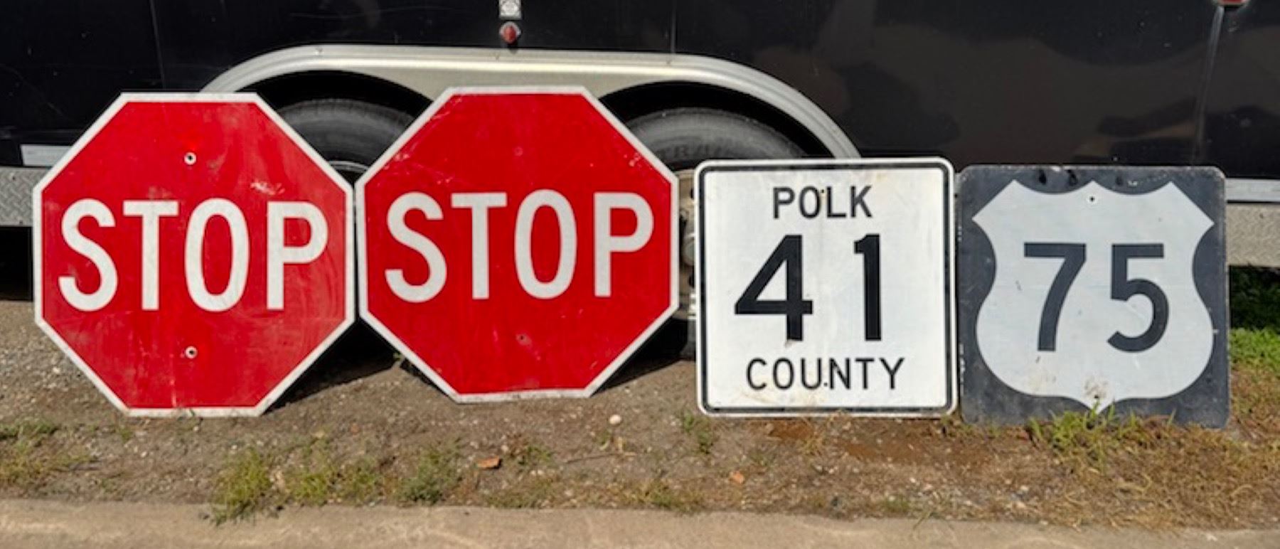 STOP SIGNS, COUNTY ROAD SIGN, US HIGHWAY SIGN; LOT OF 4 SIGNS