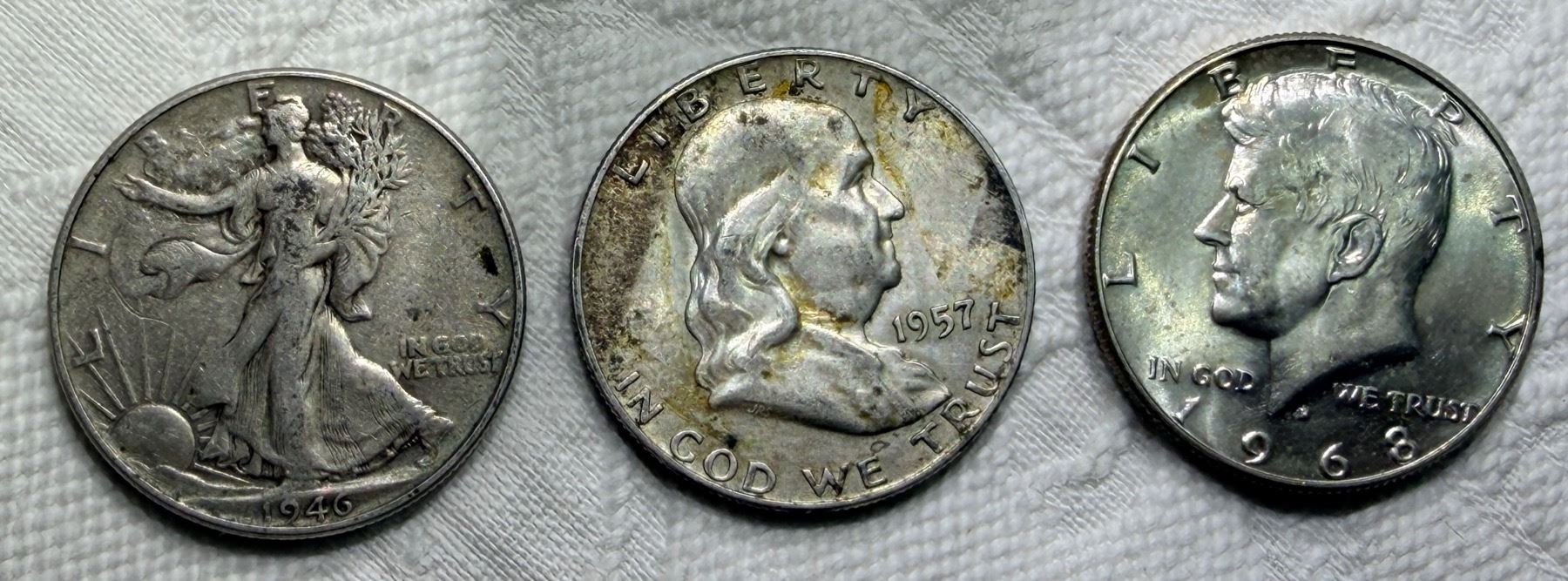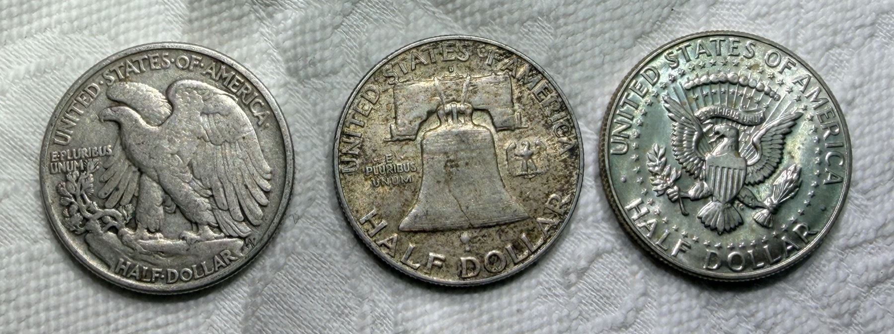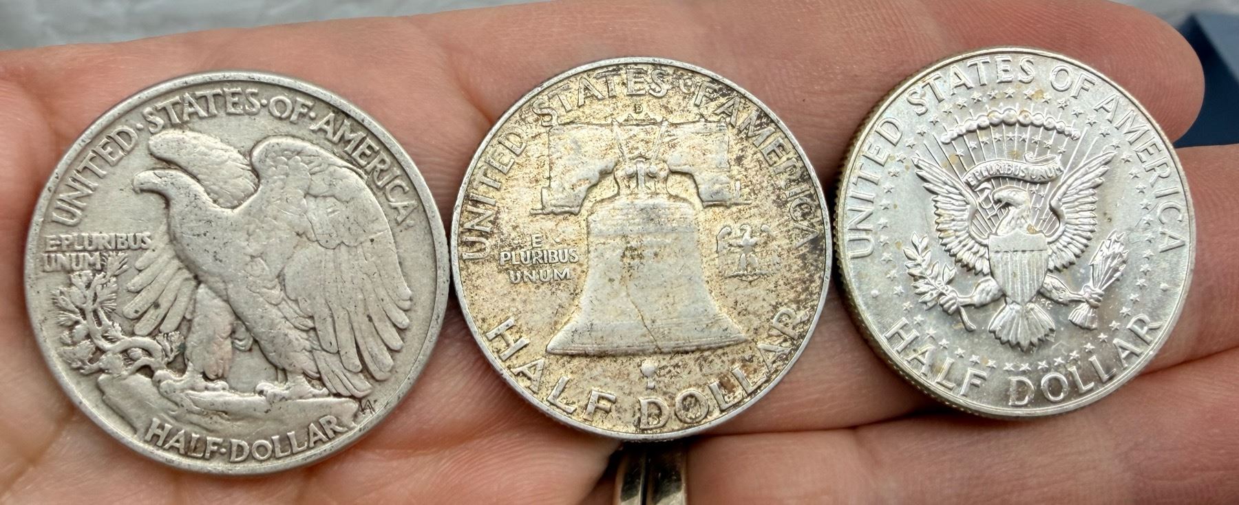THREE DESIGNS OF THE US HALF DOLLAR: WALKING LIBERTY SILVER HALF DOLLAR - 1946; BEN FRANKLIN SILVER HALF DOLLAR - 1957D; KENNEDY SILVER HALF DOLLAR - 1968D; DENVER AND PHILADELPHIA MINTS