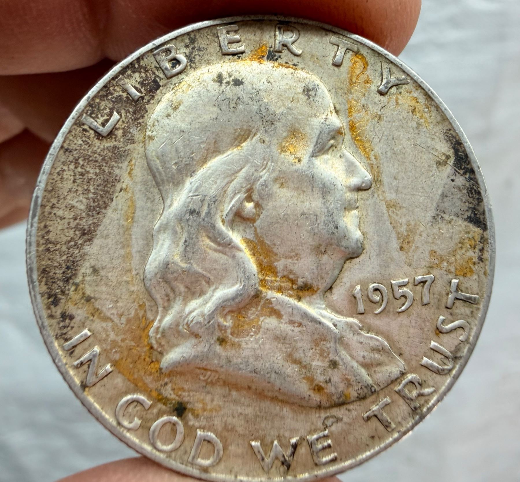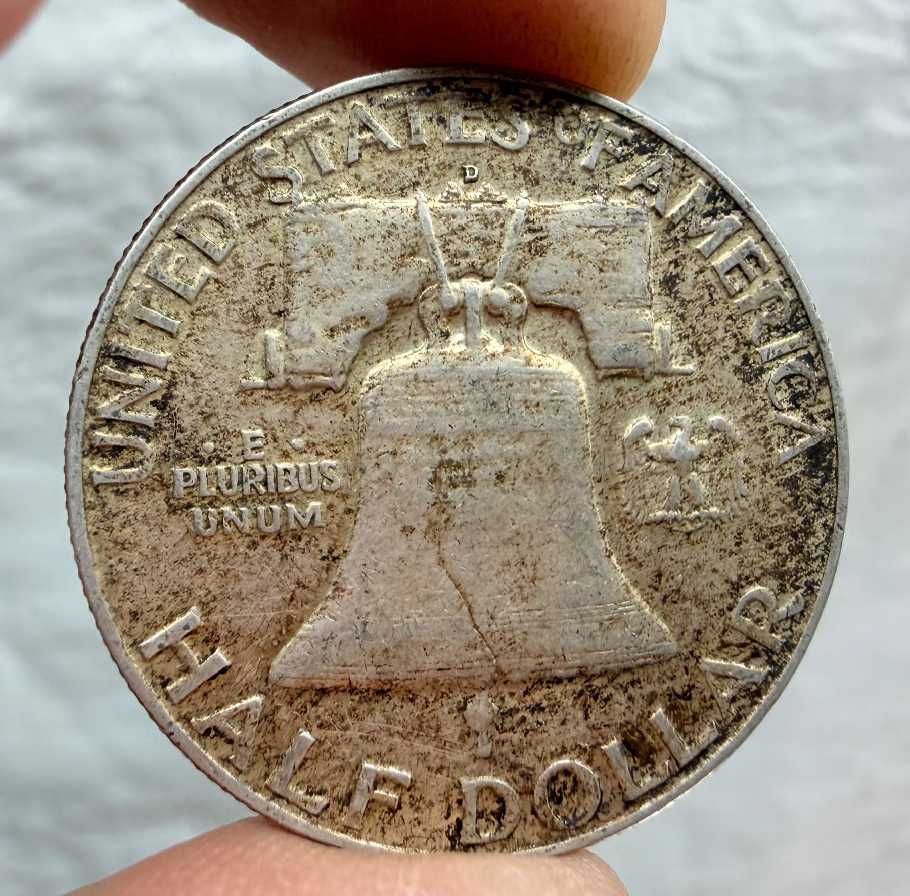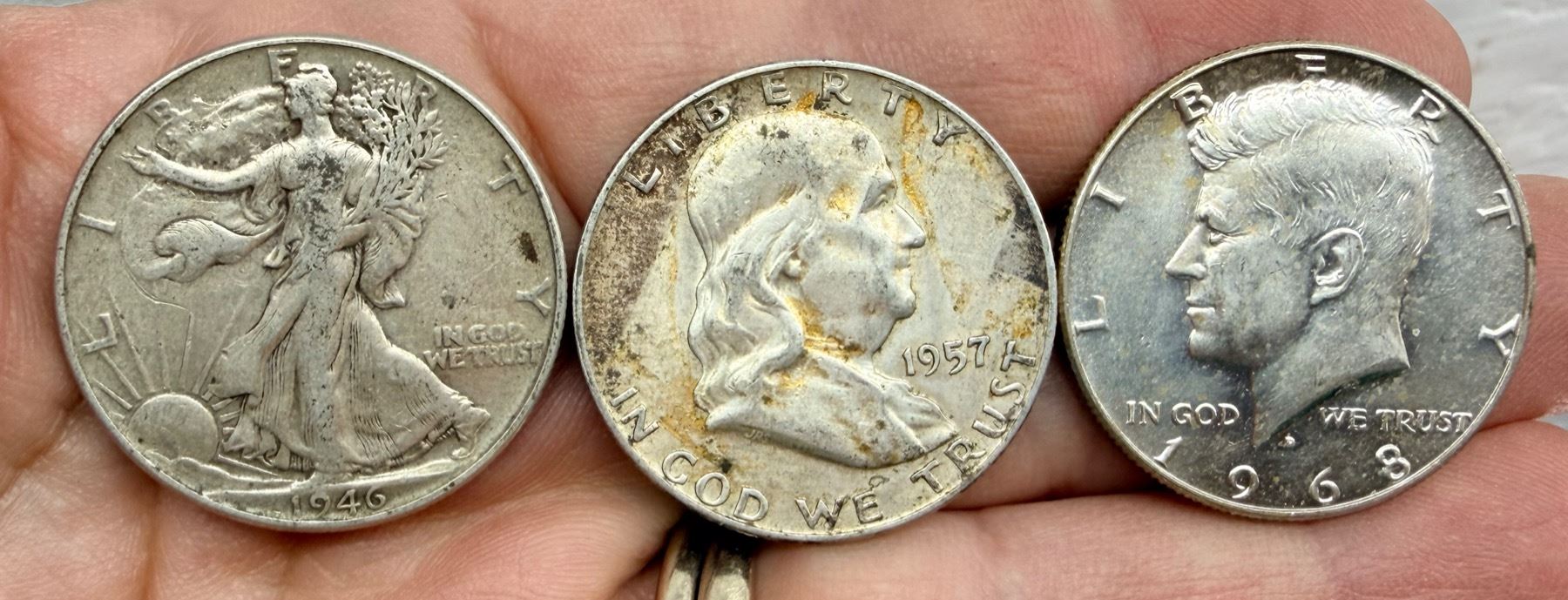 THREE DESIGNS OF THE US HALF DOLLAR: WALKING LIBERTY SILVER HALF DOLLAR - 1946; BEN FRANKLIN SILVER HALF DOLLAR - 1957D; KENNEDY SILVER HALF DOLLAR - 1968D; DENVER AND PHILADELPHIA MINTS