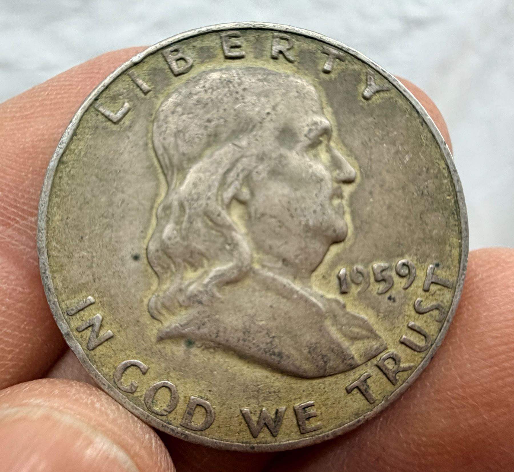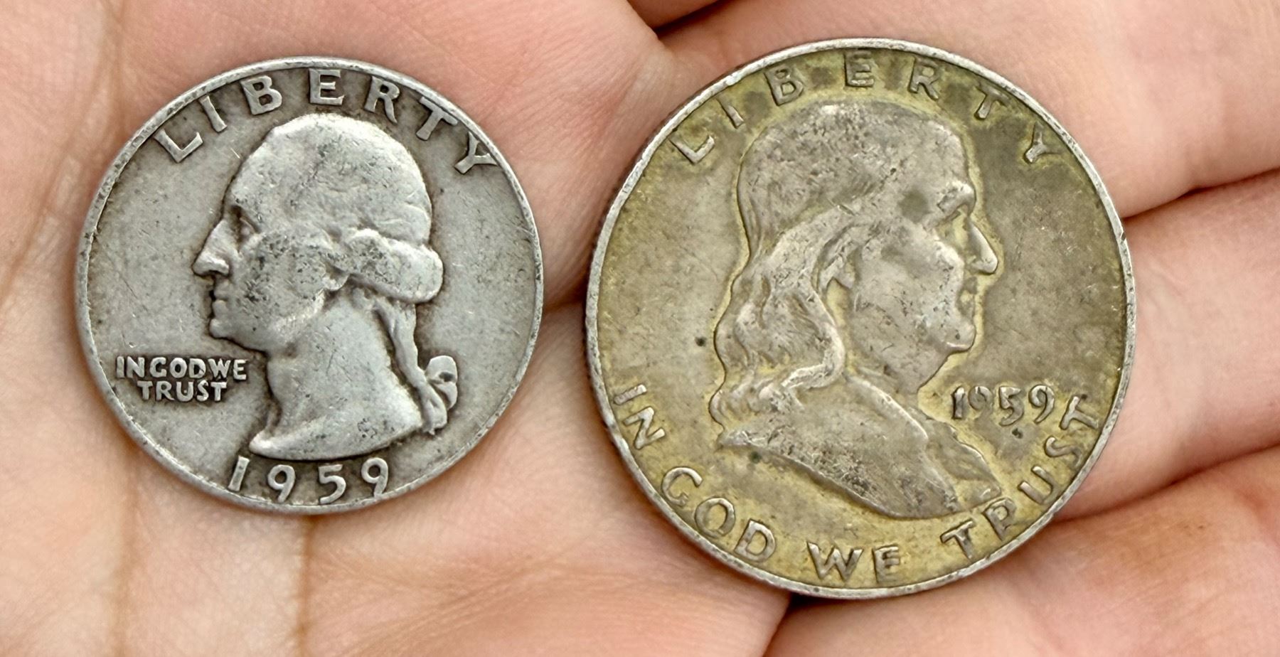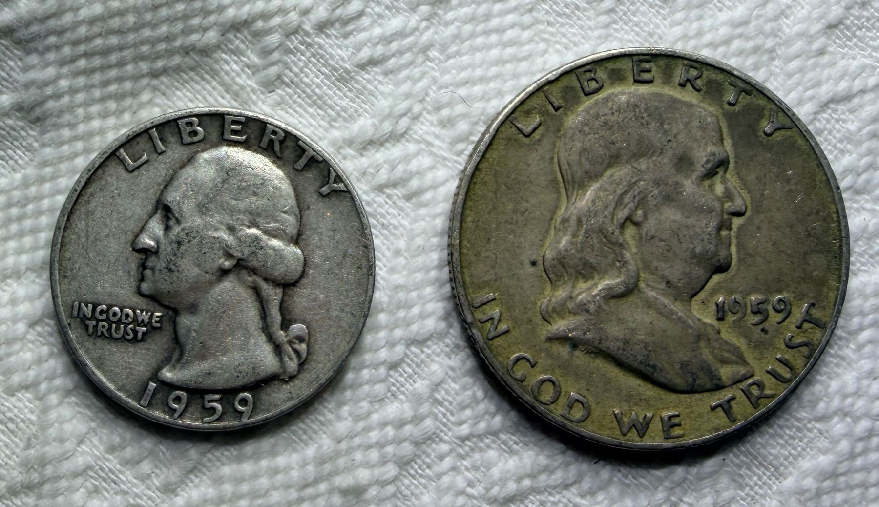 TWO TYPES OF COINS FROM THE SAME YEAR: BEN FRANKLIN SILVER HALF DOLLAR - 1959D; WASHINGTON SILVER QUARTER 1959D; DENVER MINT