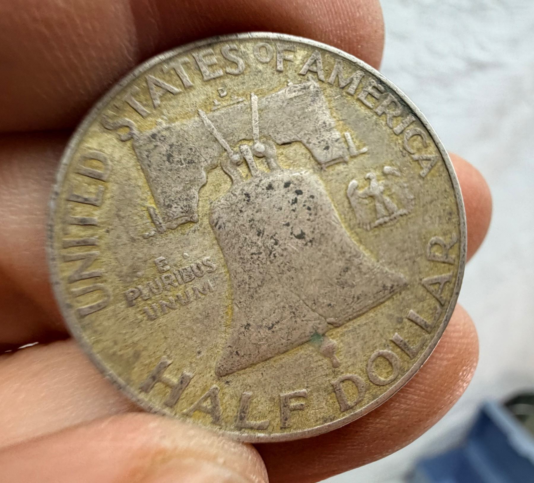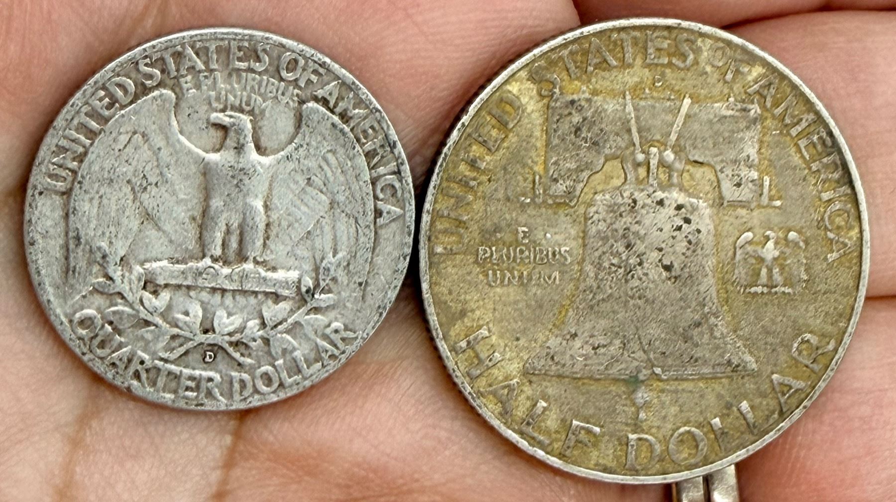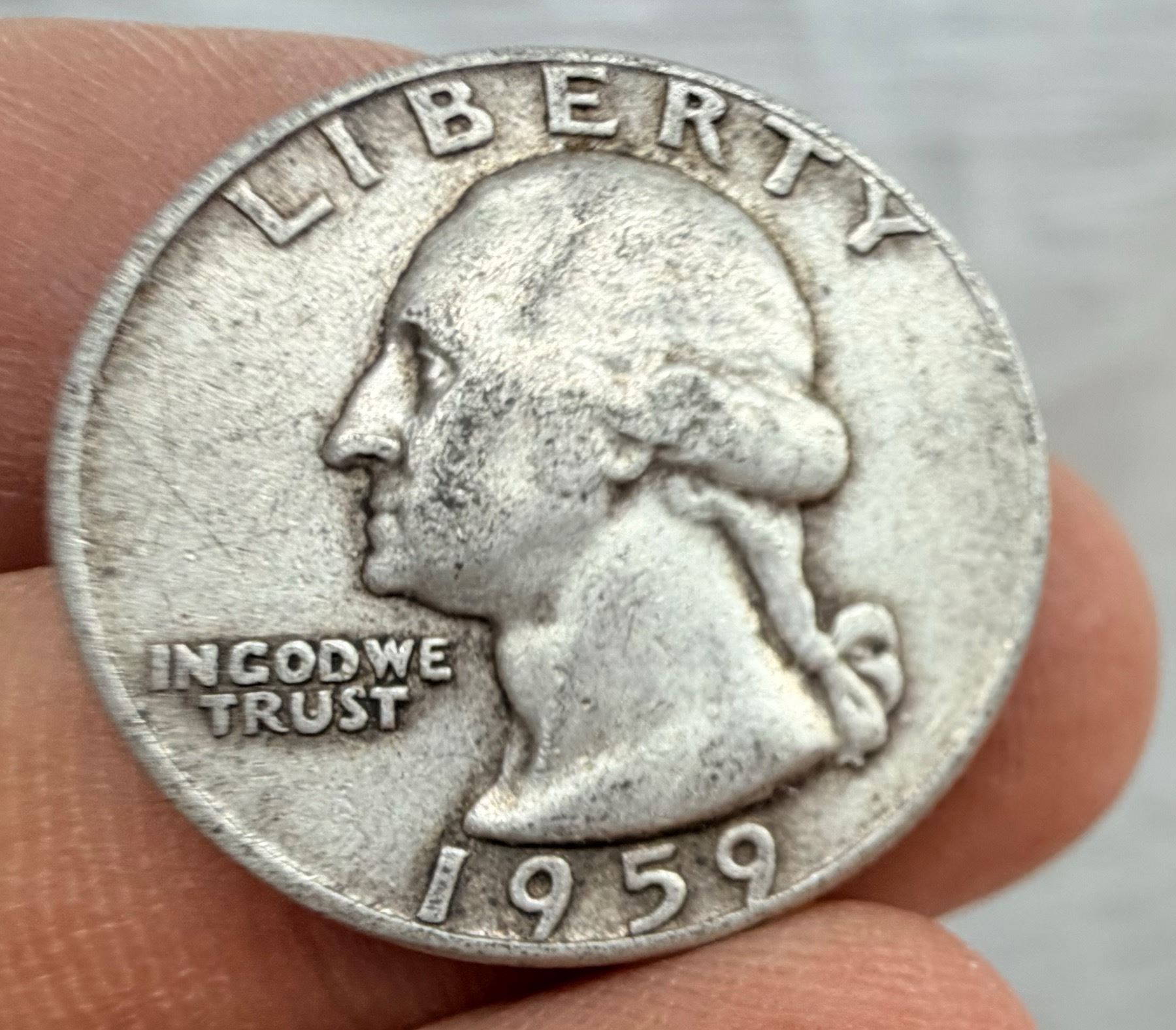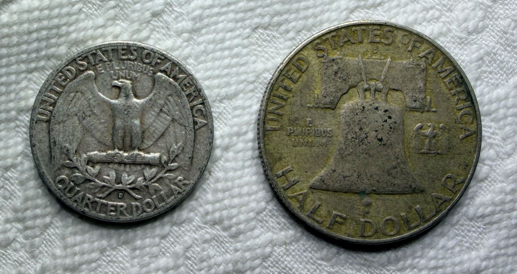 TWO TYPES OF COINS FROM THE SAME YEAR: BEN FRANKLIN SILVER HALF DOLLAR - 1959D; WASHINGTON SILVER QUARTER 1959D; DENVER MINT