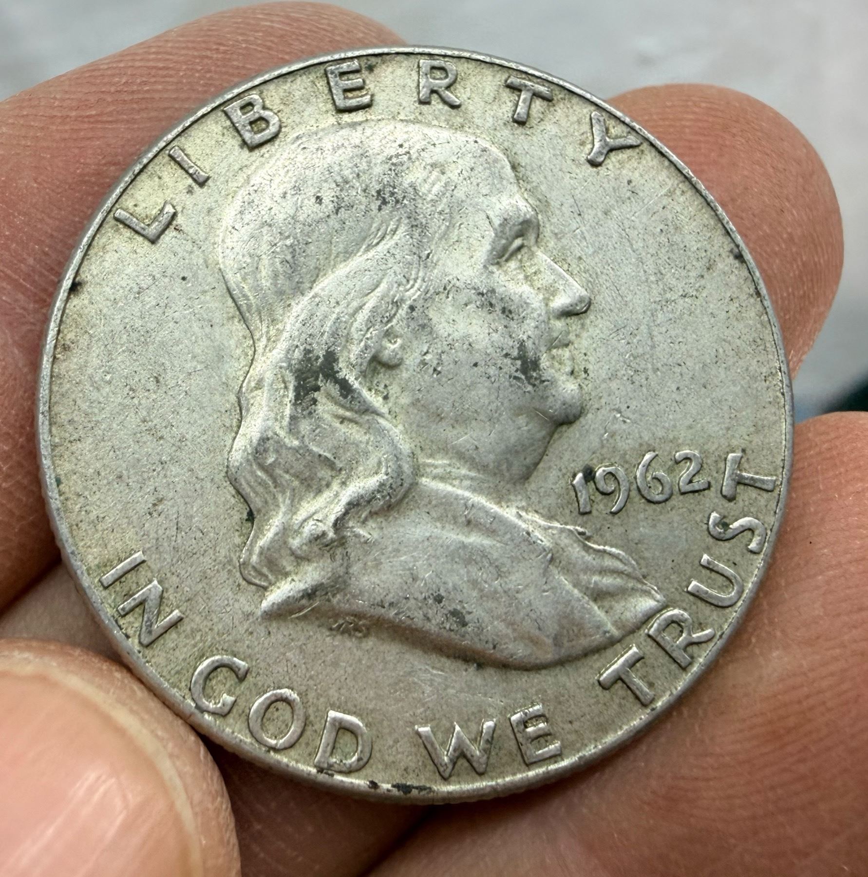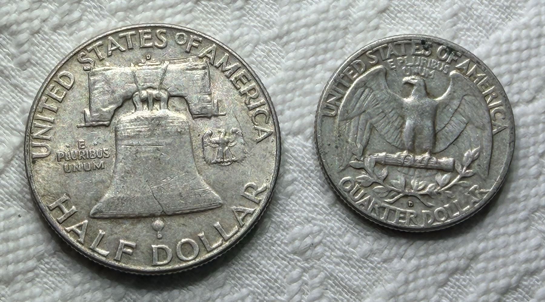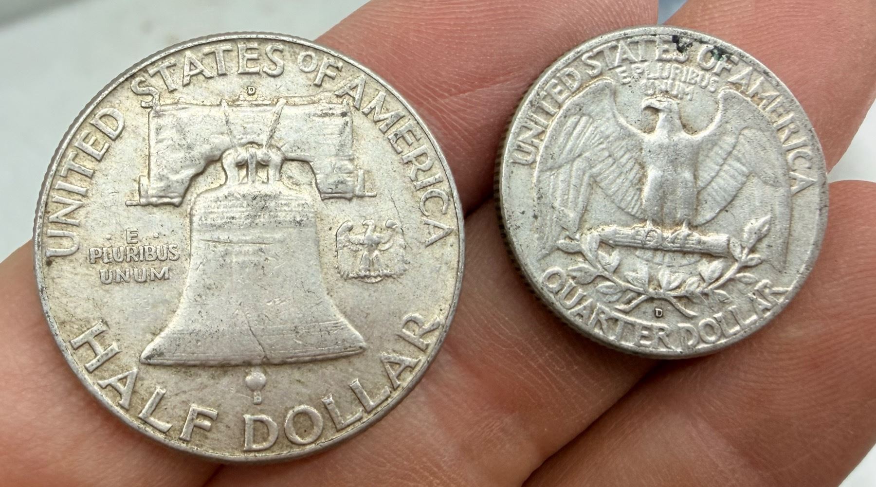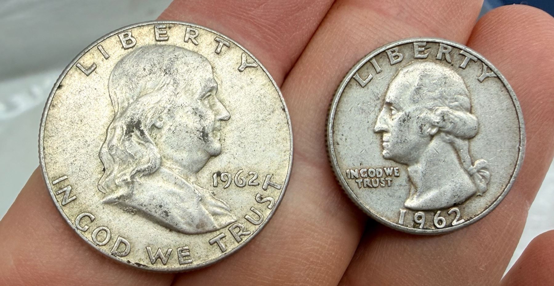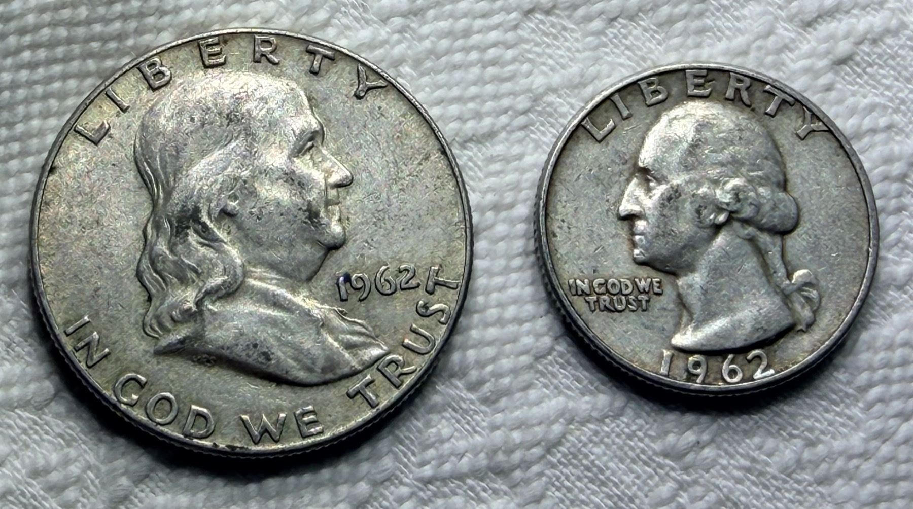 TWO TYPES OF COINS FROM THE SAME YEAR: BEN FRANKLIN SILVER HALF DOLLAR - 1962D; WASHINGTON SILVER QUARTER 1962D; DENVER MINT