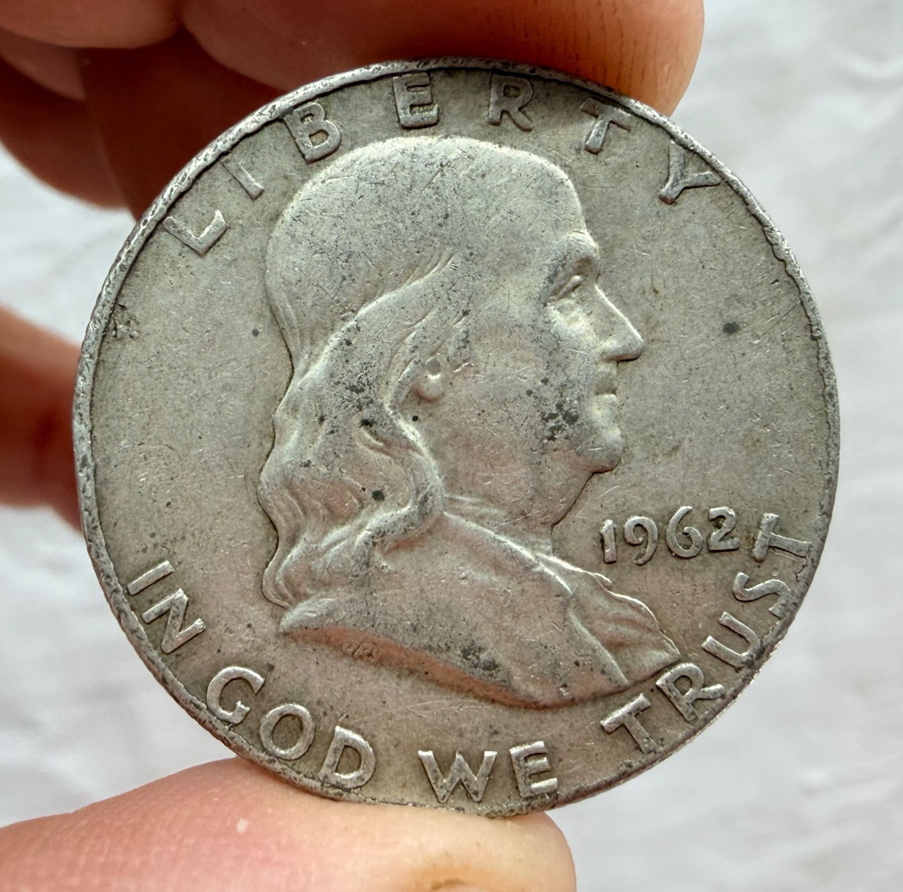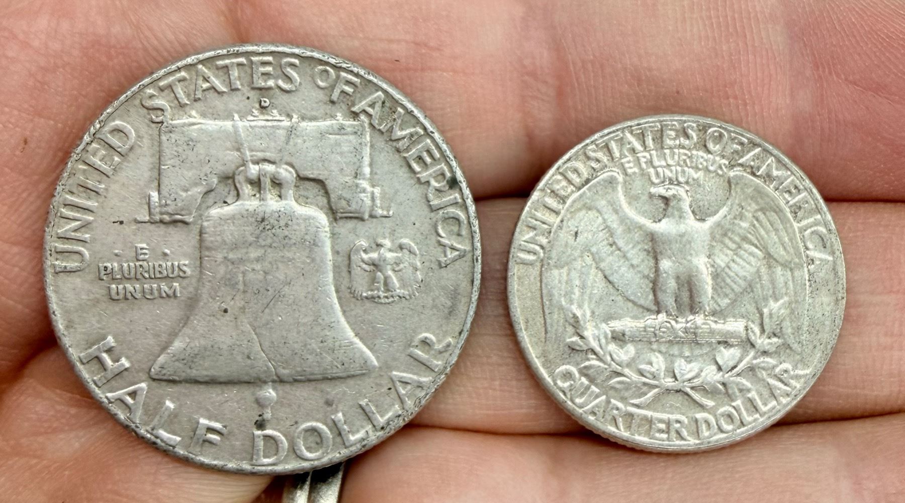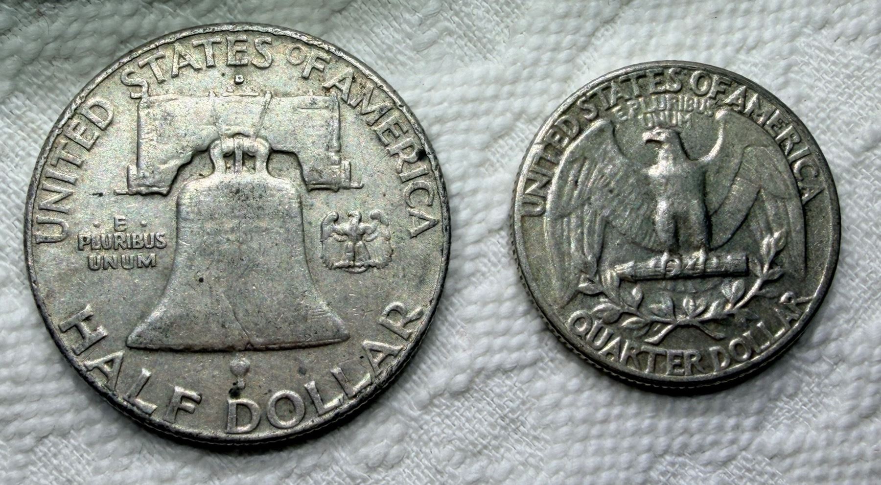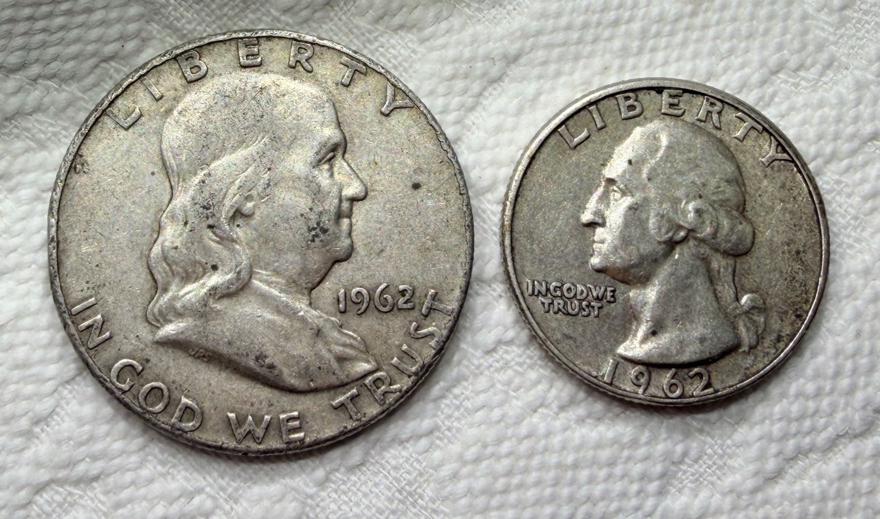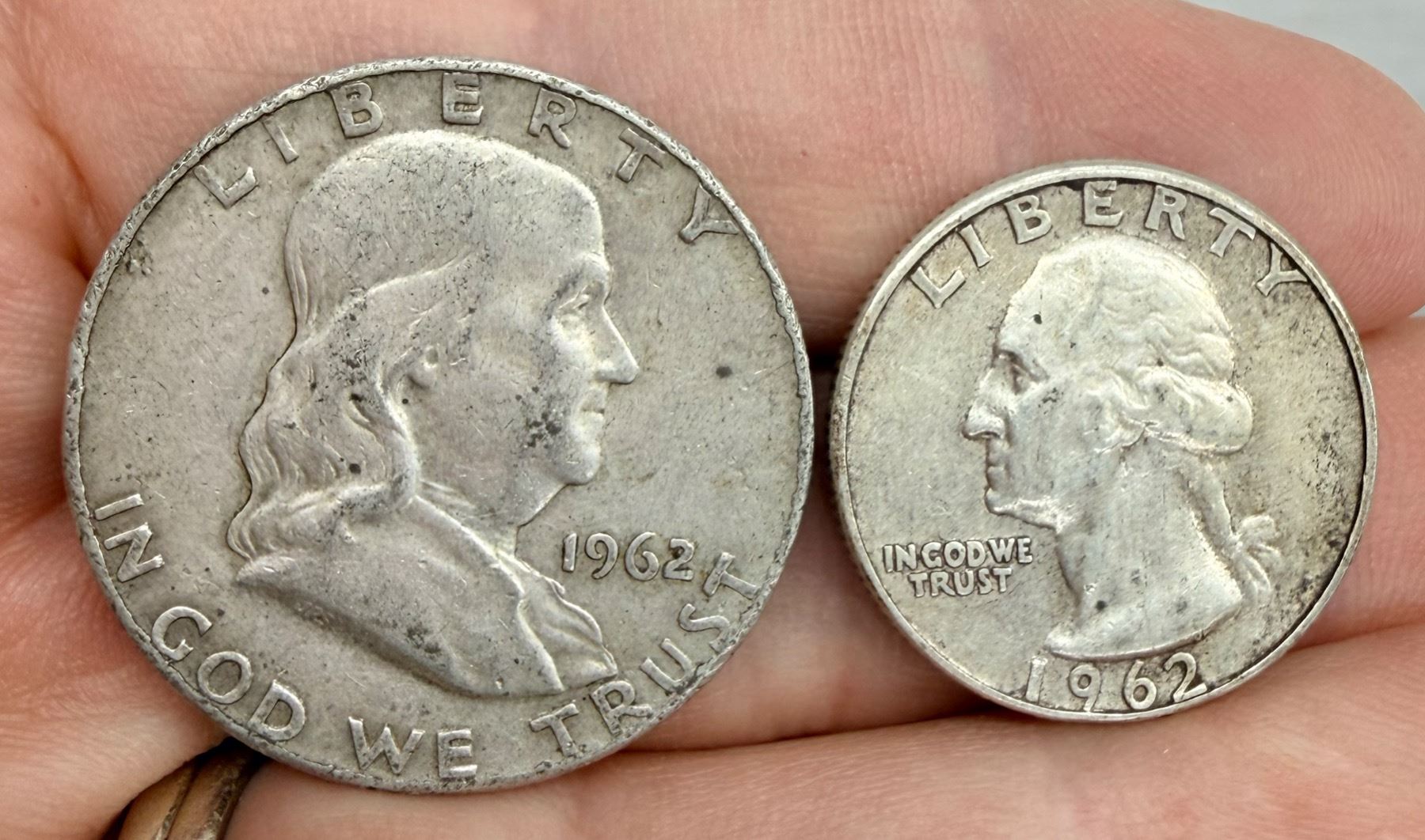 TWO TYPES OF COINS FROM THE SAME YEAR: BEN FRANKLIN SILVER HALF DOLLAR - 1962D; WASHINGTON SILVER QUARTER 1962; DENVER AND PHILADELPHIA MINT