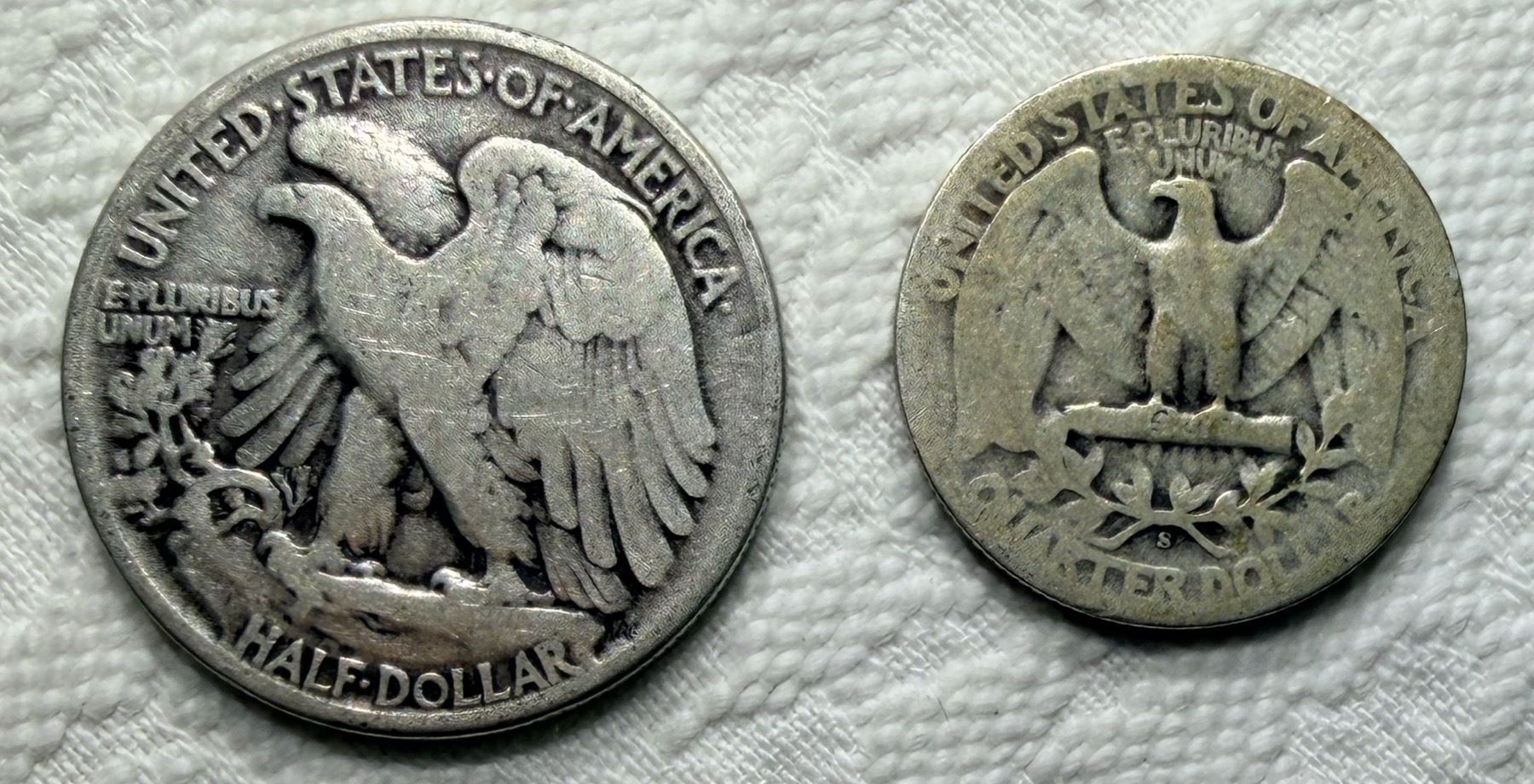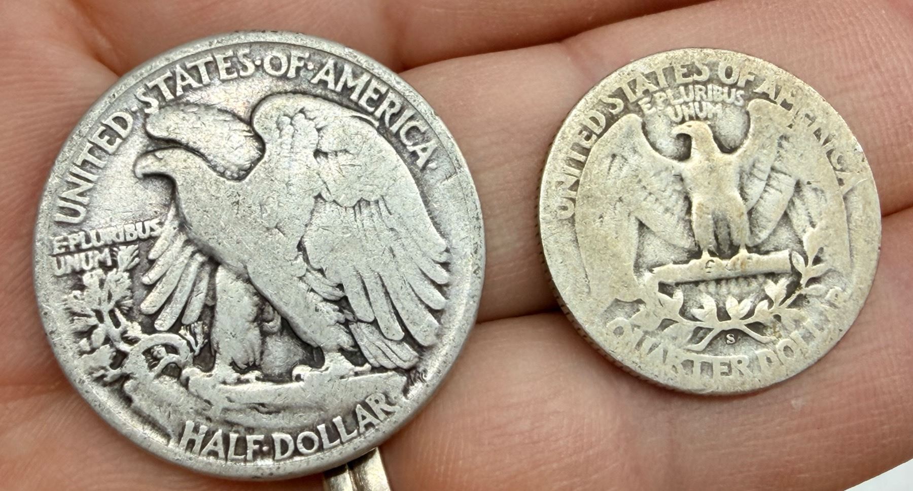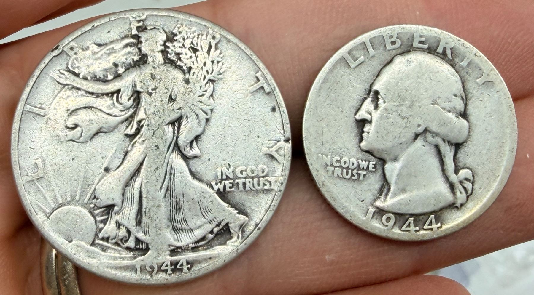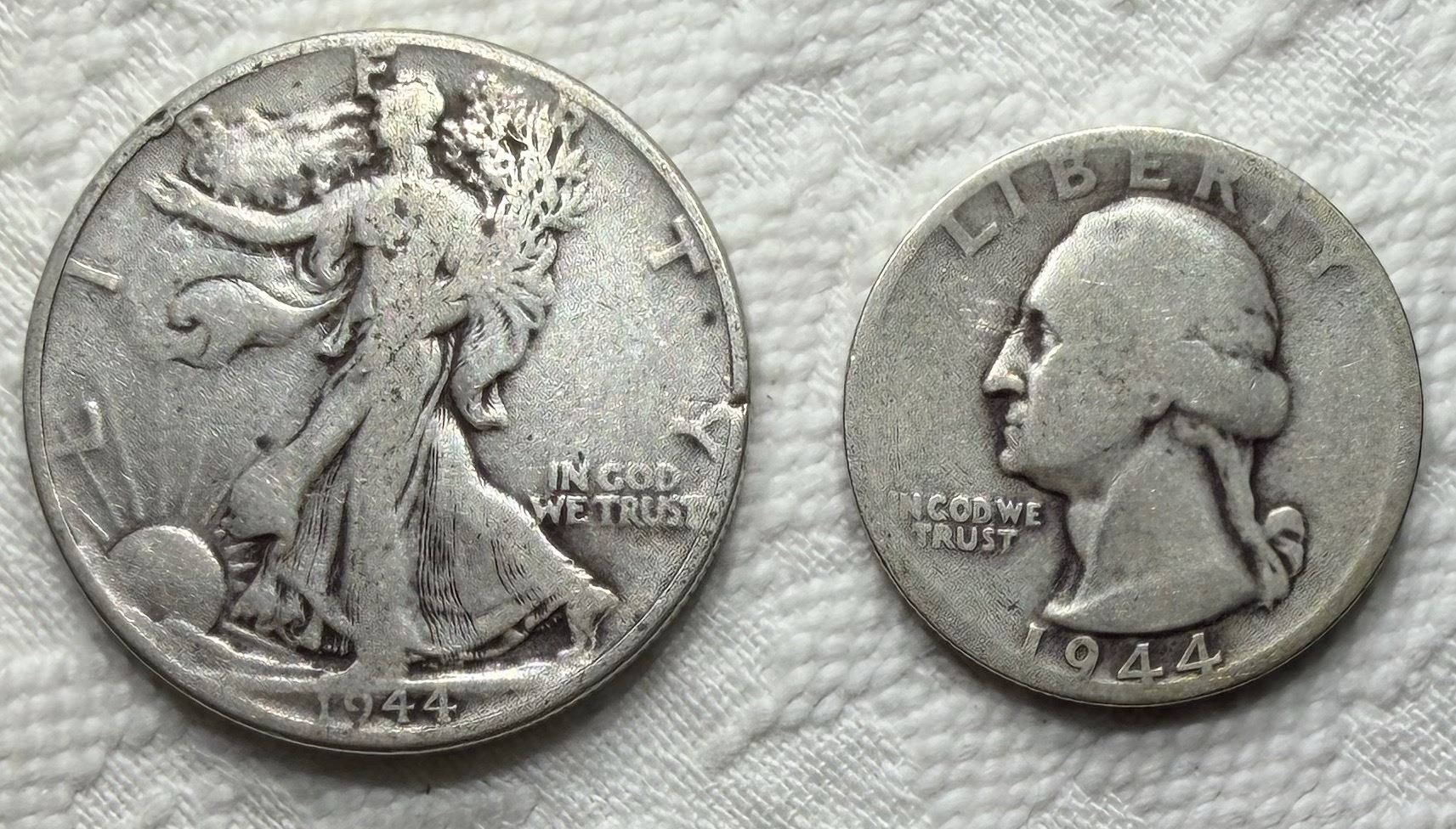 TWO TYPES OF COINS FROM THE SAME YEAR: WALKING LIBERTY SILVER HALF DOLLAR - 1944; WASHINGTON SILVER QUARTER 1944S; PHILADELPHIA AND SAN FRANCISCO MINTS