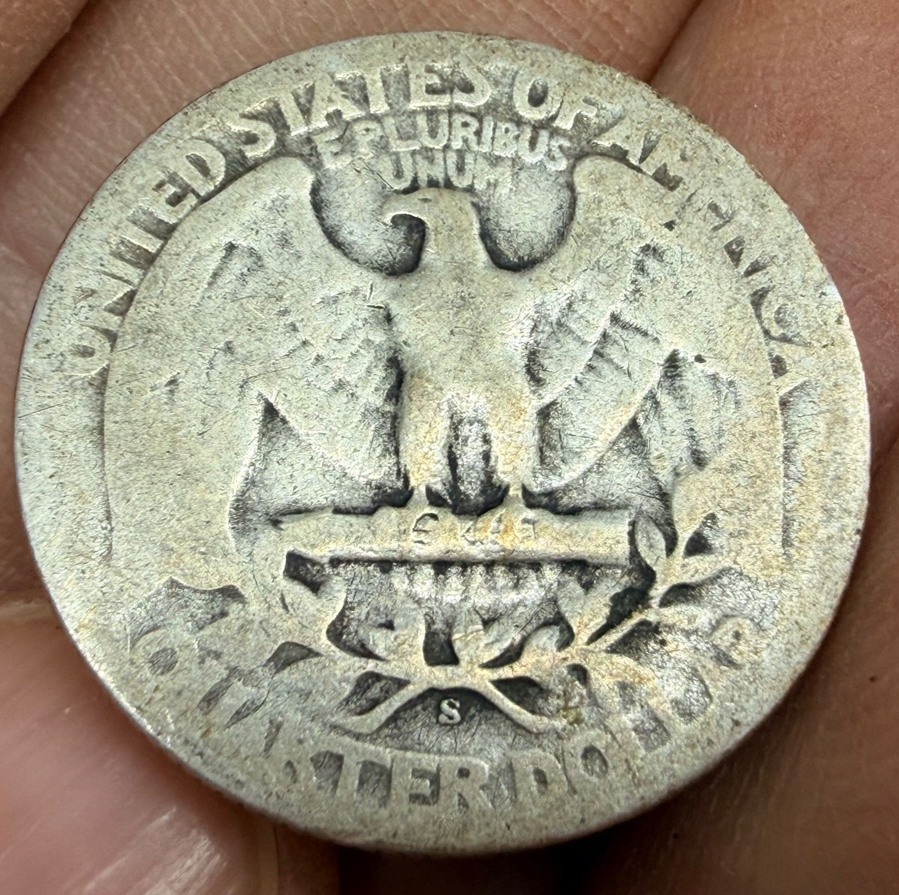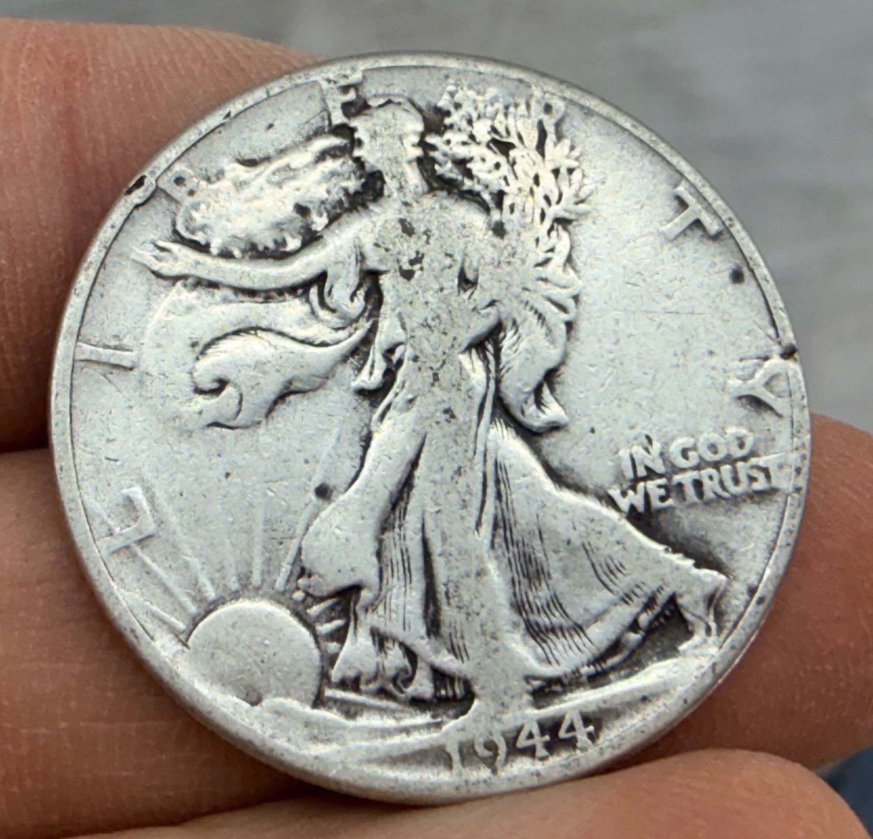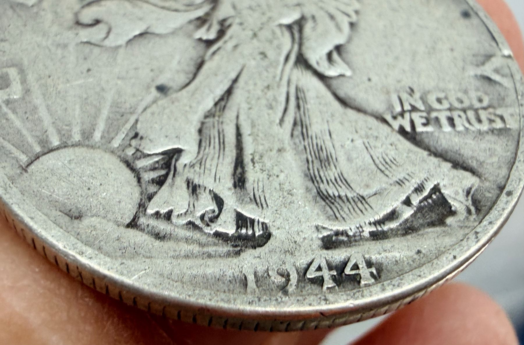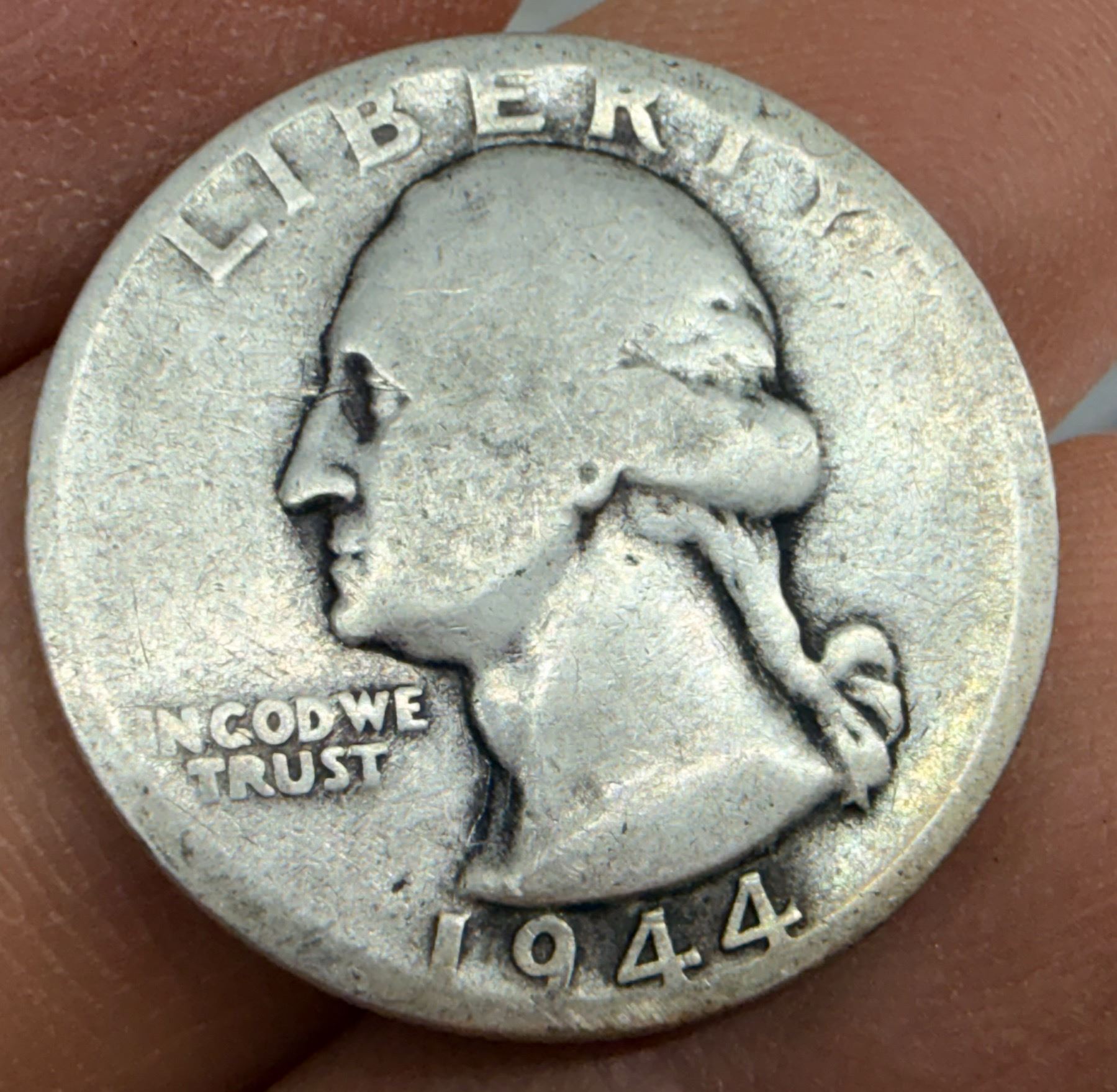 TWO TYPES OF COINS FROM THE SAME YEAR: WALKING LIBERTY SILVER HALF DOLLAR - 1944; WASHINGTON SILVER QUARTER 1944S; PHILADELPHIA AND SAN FRANCISCO MINTS