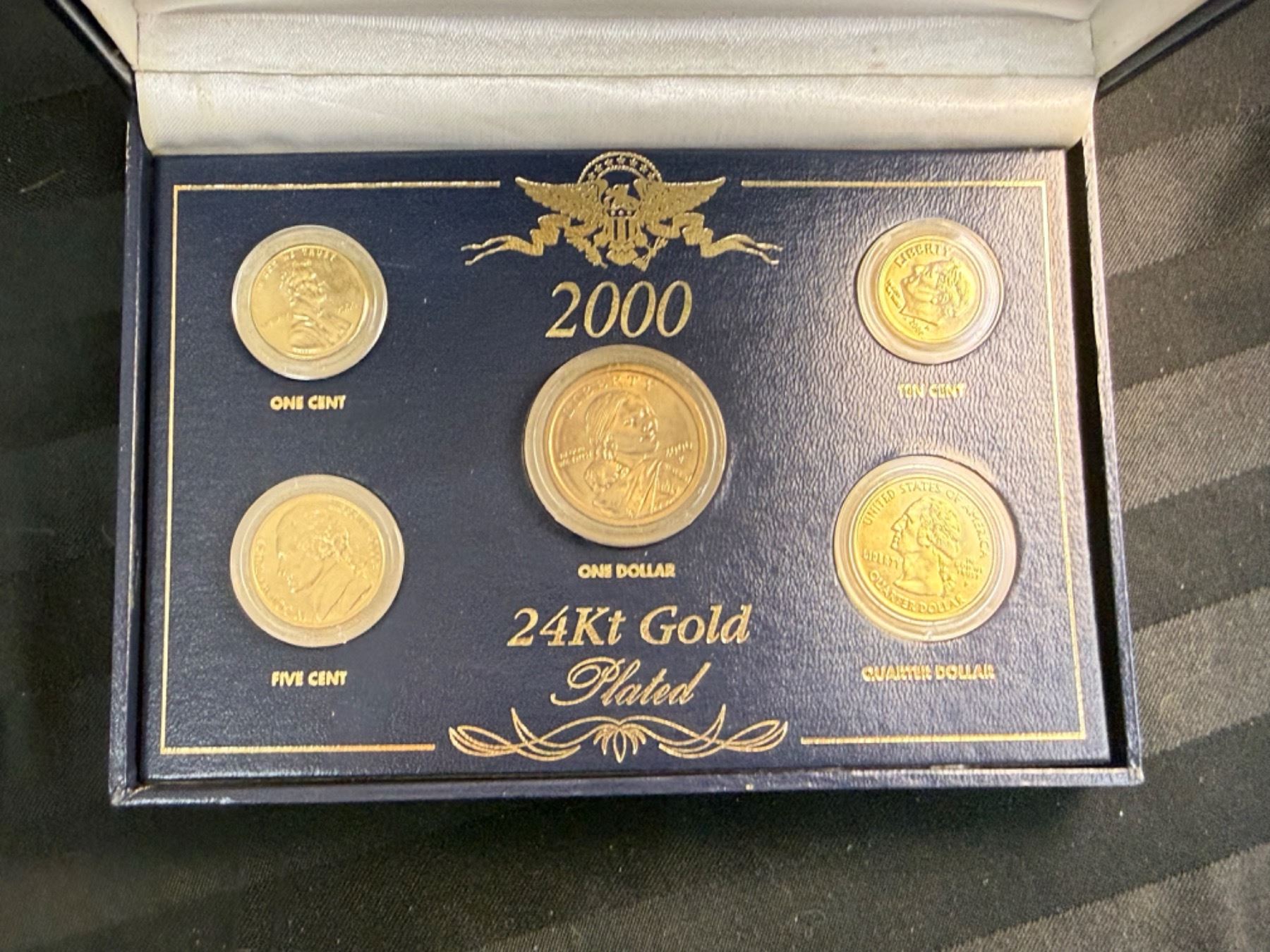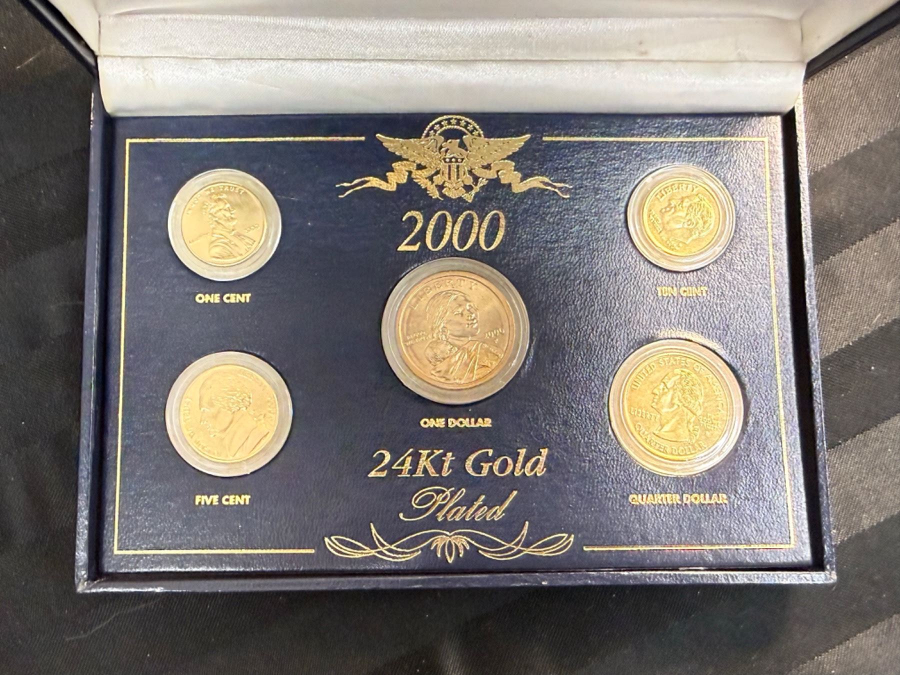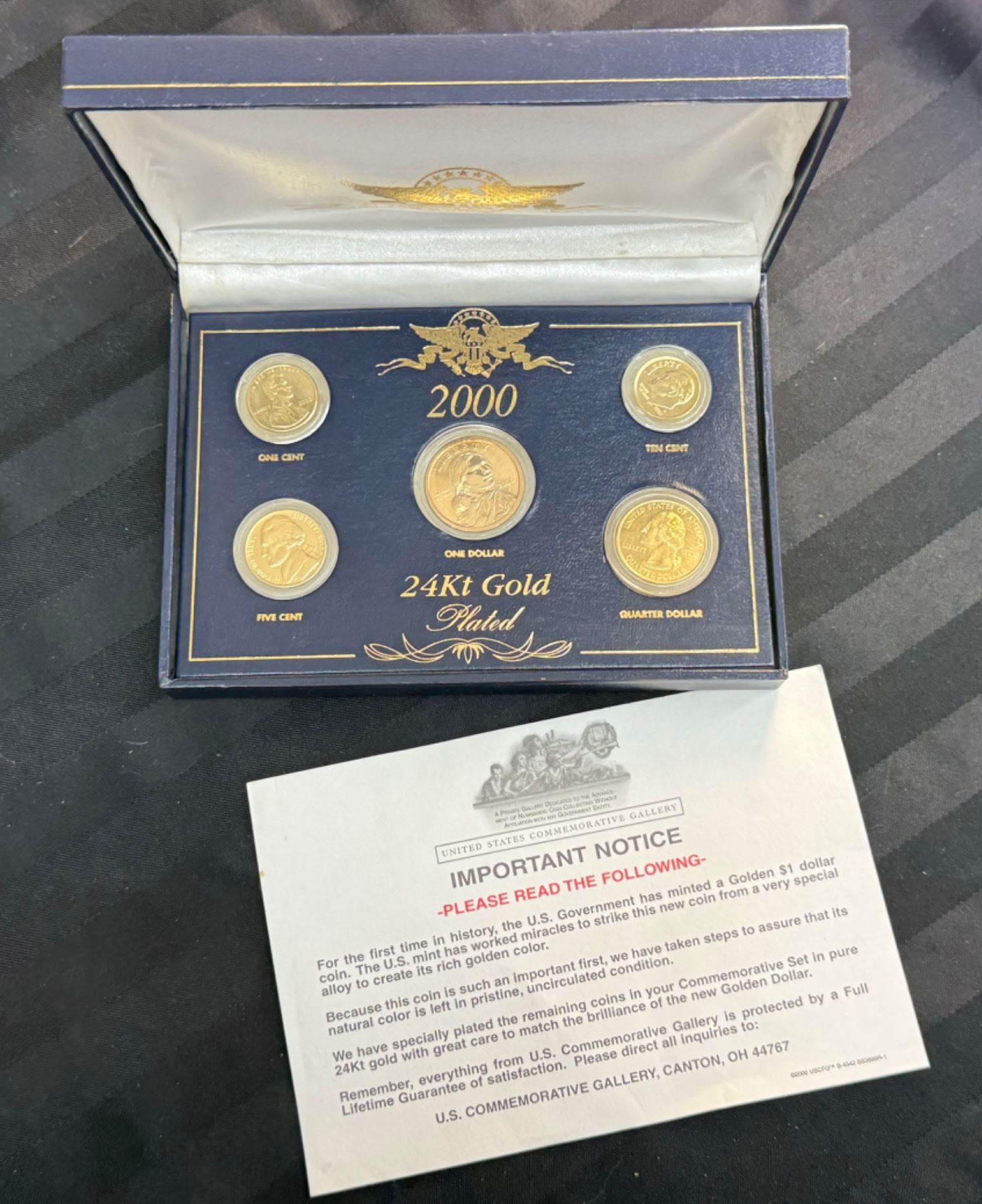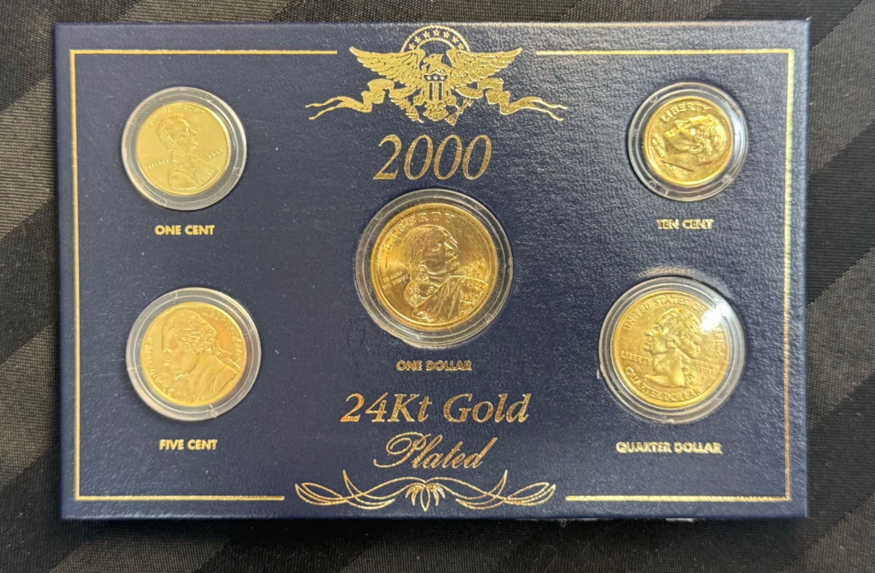 IN 2000, FOR THE FIRST TIME IN HISTORY, THE U.S. GOVERNMENT MINTED A GOLDEN $1 DOLLAR COIN; THE U.S. MINT WORKED MIRACLES TO STRIKE THIS NEW COIN FROM A VERY SPECIAL ALLOY TO CREATE ITS RICH GOLDEN COLOR; THE OTHER COINS IN THIS COMMEMORATIVE SET ARE SPECIALLY PLATED IN PURE 24KT GOLD WITH GREAT CARE TO MATCH THE BRILLIANCE OF THE NEW GOLDEN DOLLAR