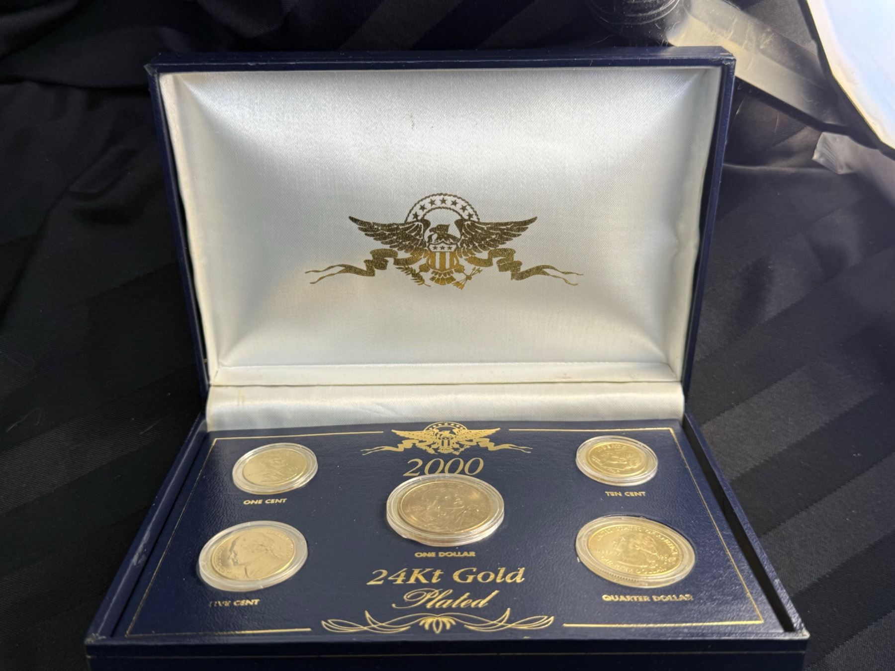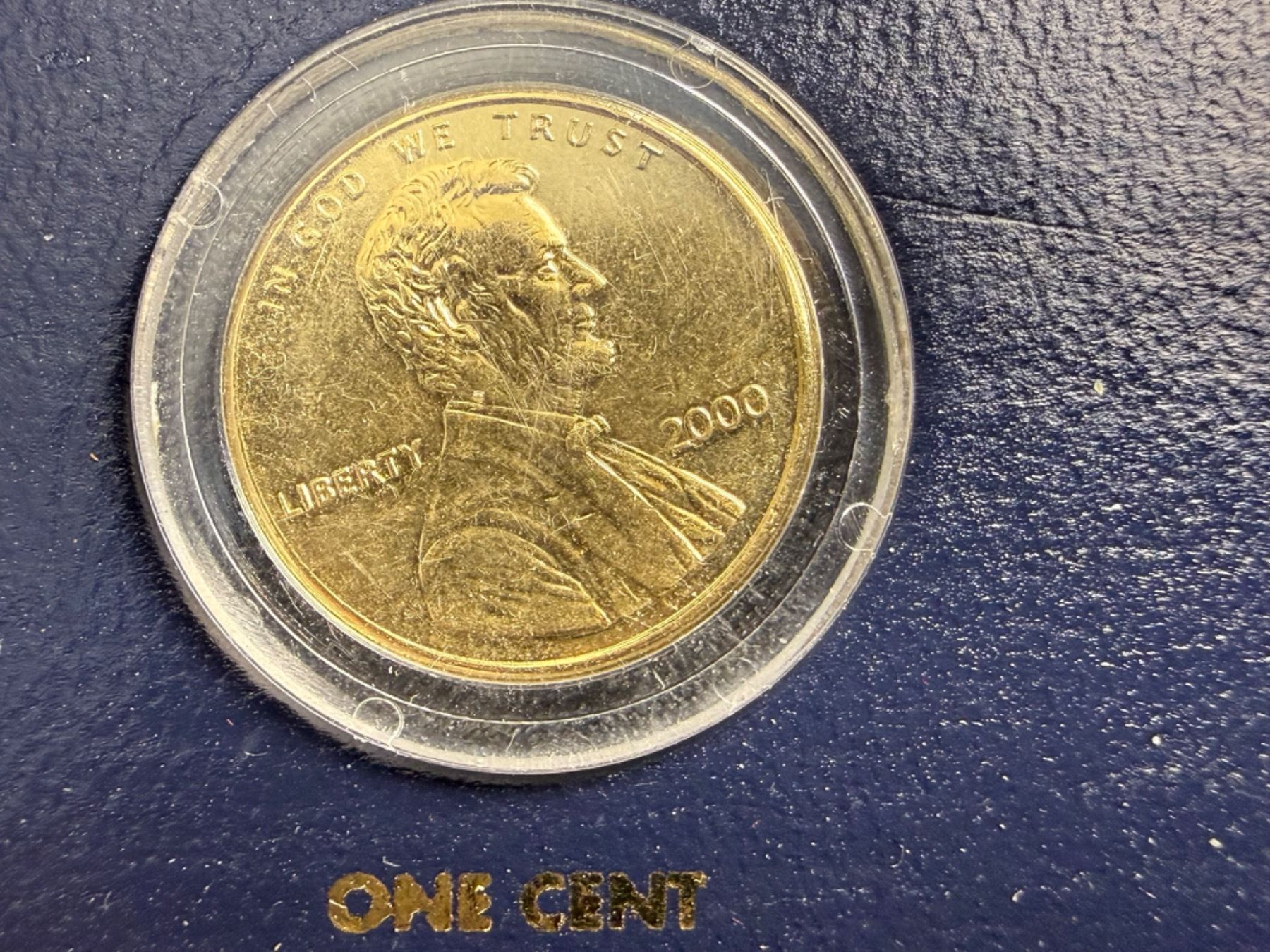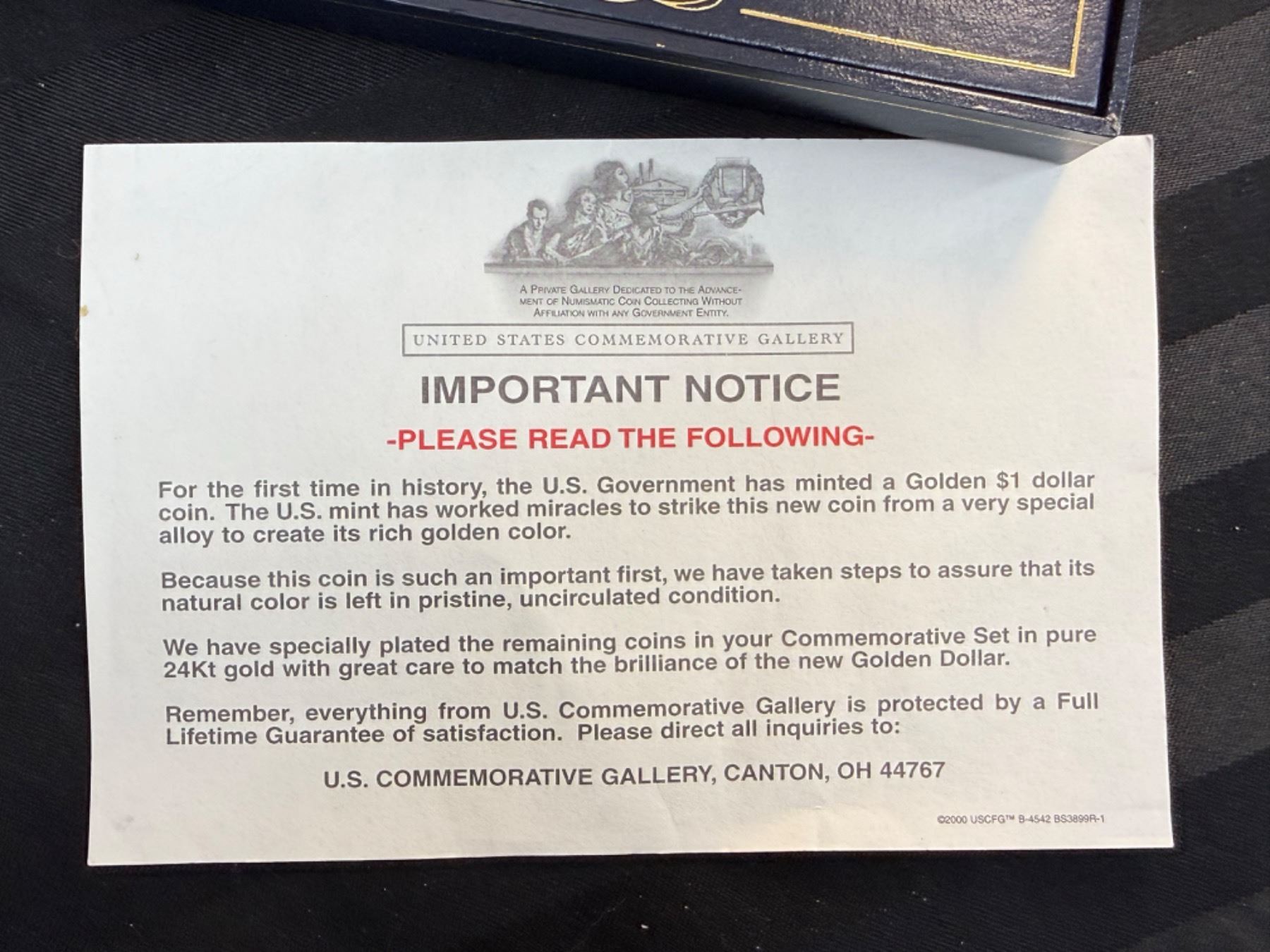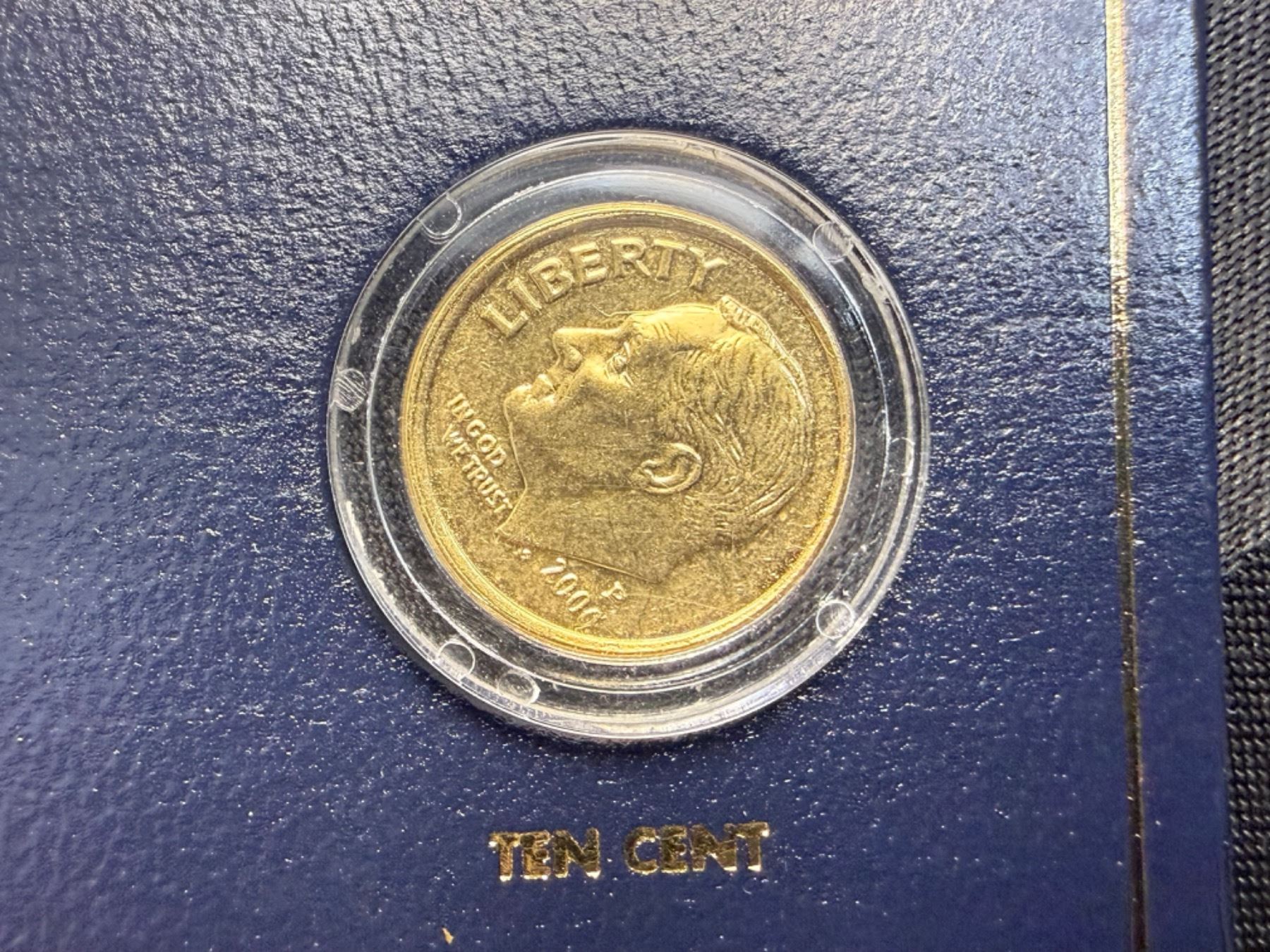 IN 2000, FOR THE FIRST TIME IN HISTORY, THE U.S. GOVERNMENT MINTED A GOLDEN $1 DOLLAR COIN; THE U.S. MINT WORKED MIRACLES TO STRIKE THIS NEW COIN FROM A VERY SPECIAL ALLOY TO CREATE ITS RICH GOLDEN COLOR; THE OTHER COINS IN THIS COMMEMORATIVE SET ARE SPECIALLY PLATED IN PURE 24KT GOLD WITH GREAT CARE TO MATCH THE BRILLIANCE OF THE NEW GOLDEN DOLLAR