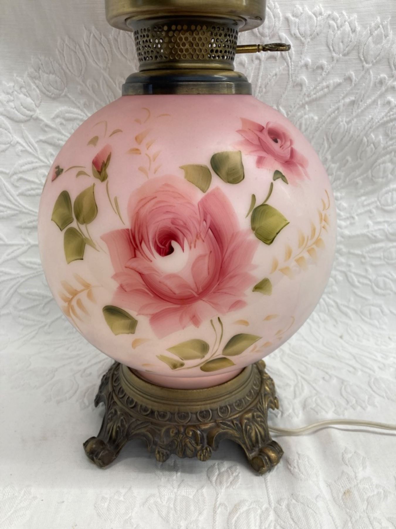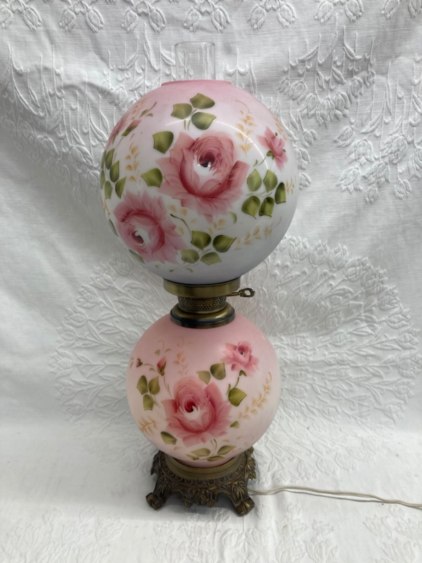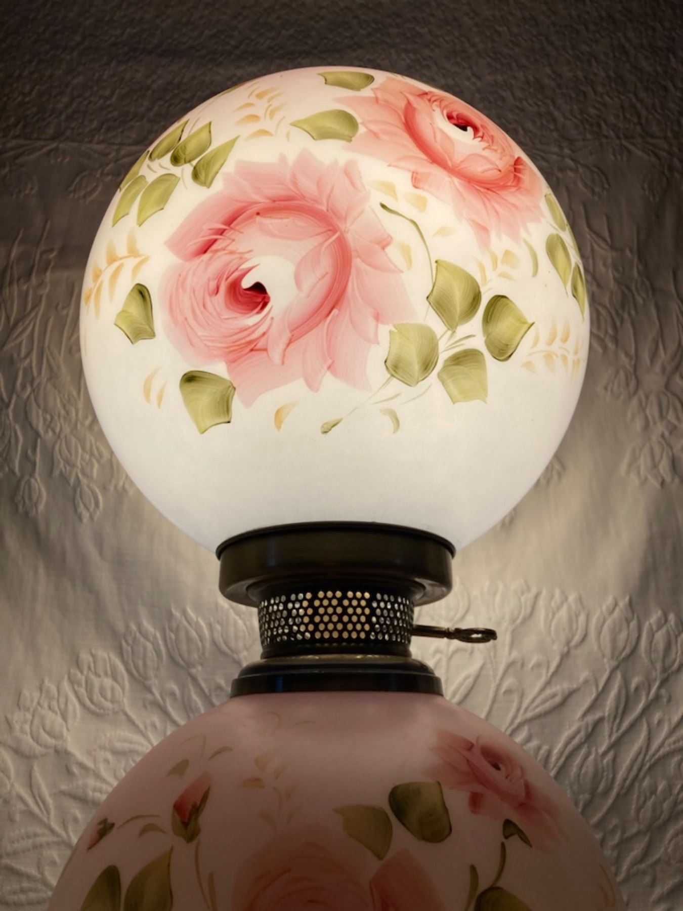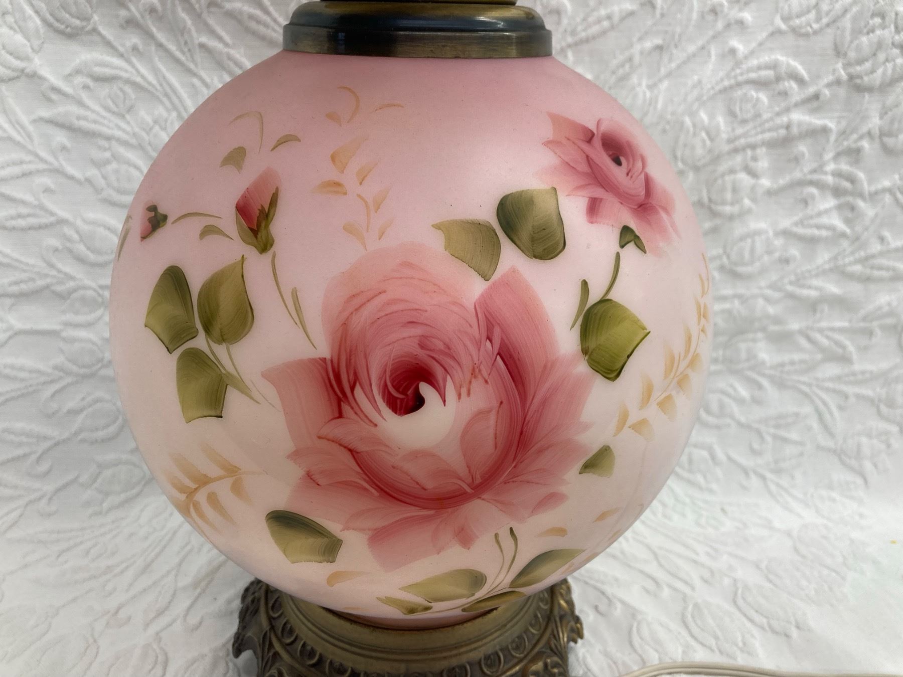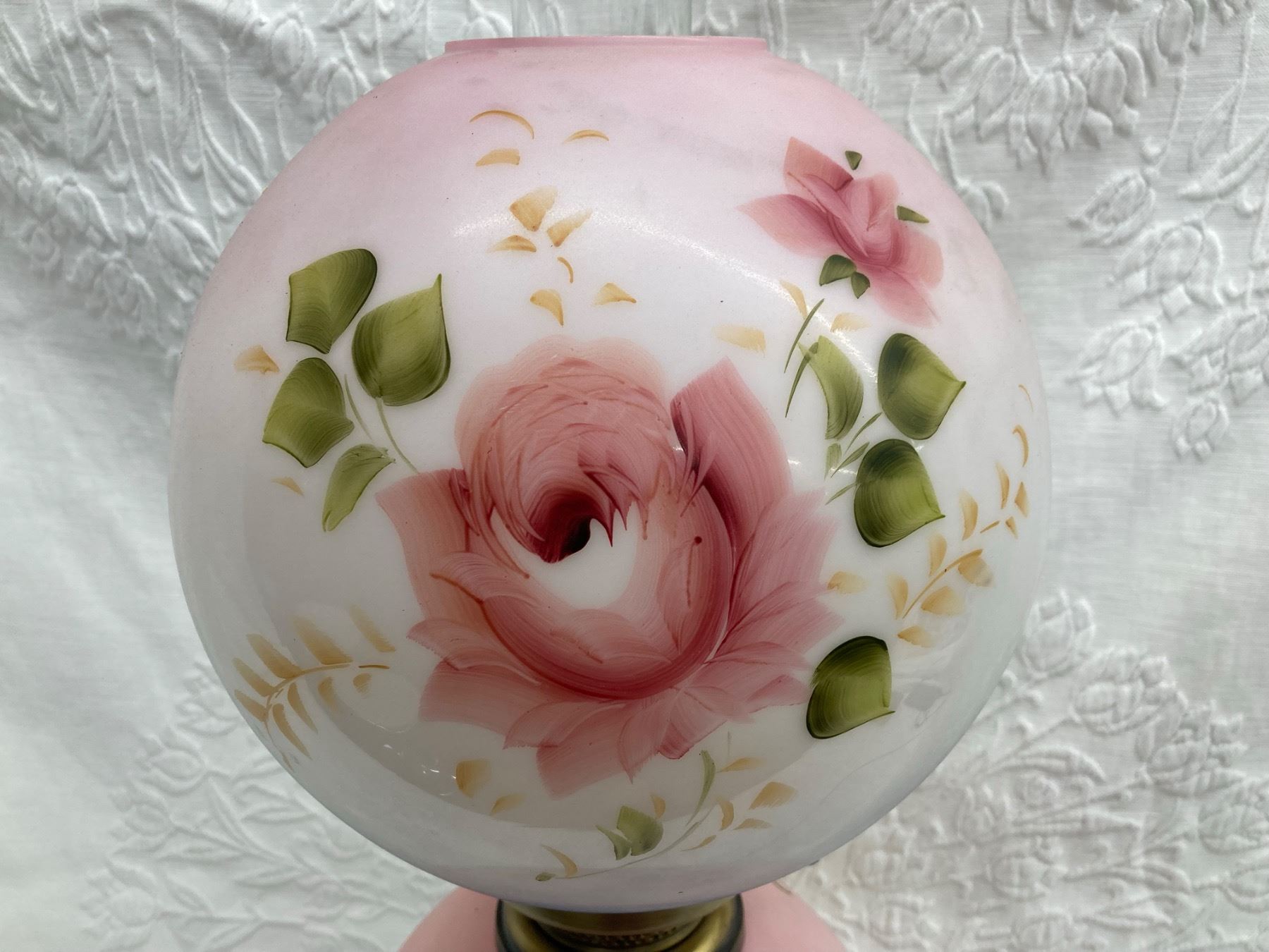 FEATURES HAND-PAINTED FLORAL DESIGN WITH PINK ROSES ON MILK GLASS GLOBES