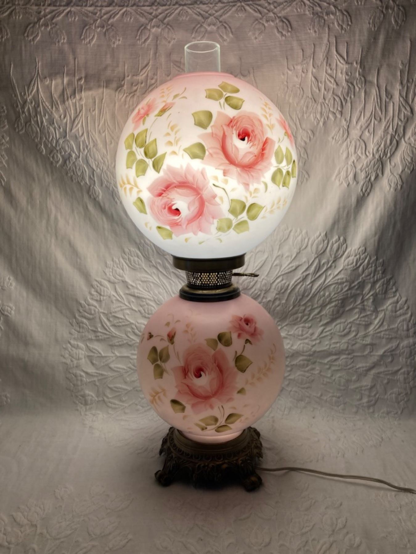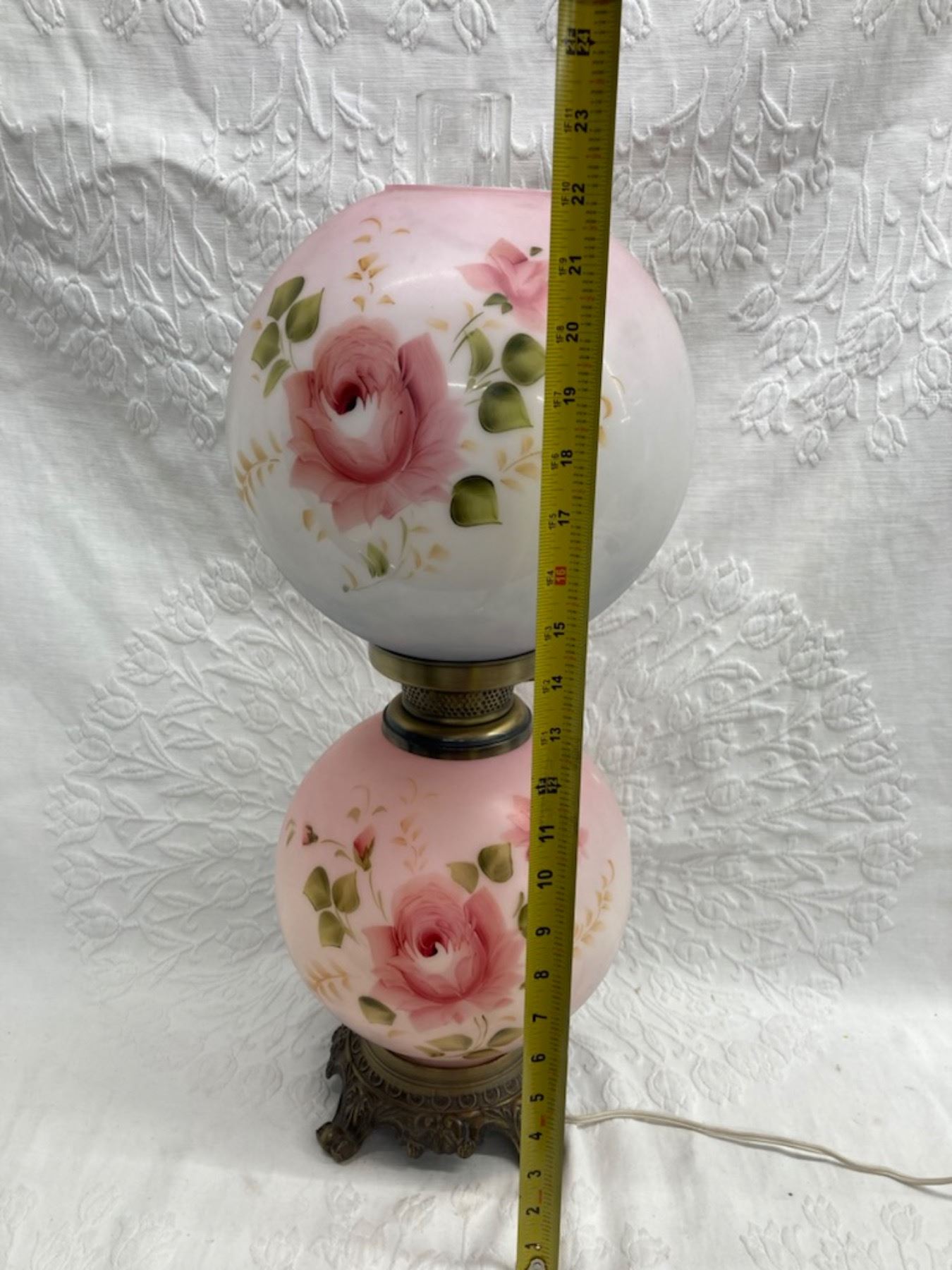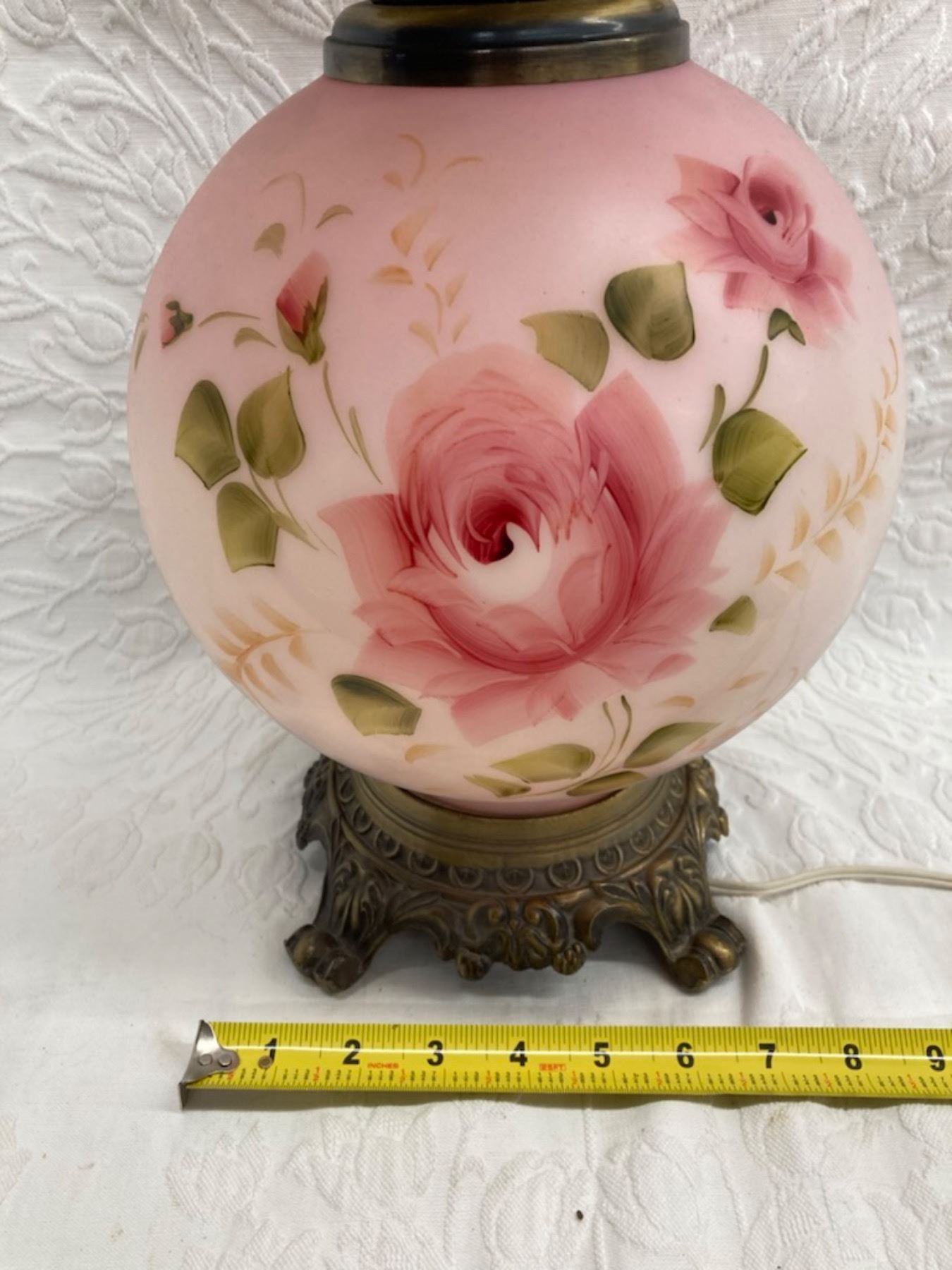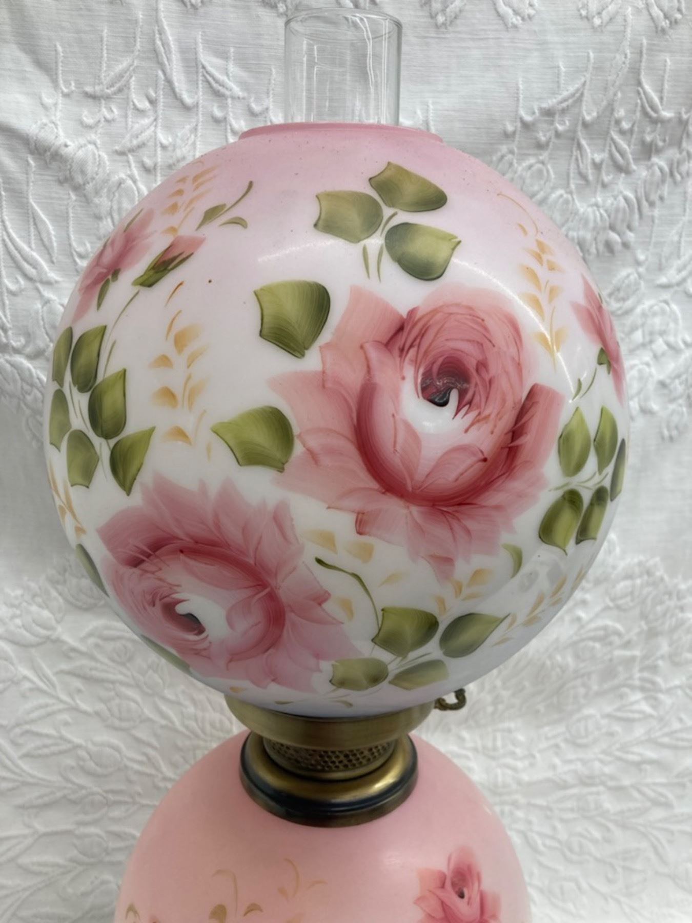 FEATURES HAND-PAINTED FLORAL DESIGN WITH PINK ROSES ON MILK GLASS GLOBES