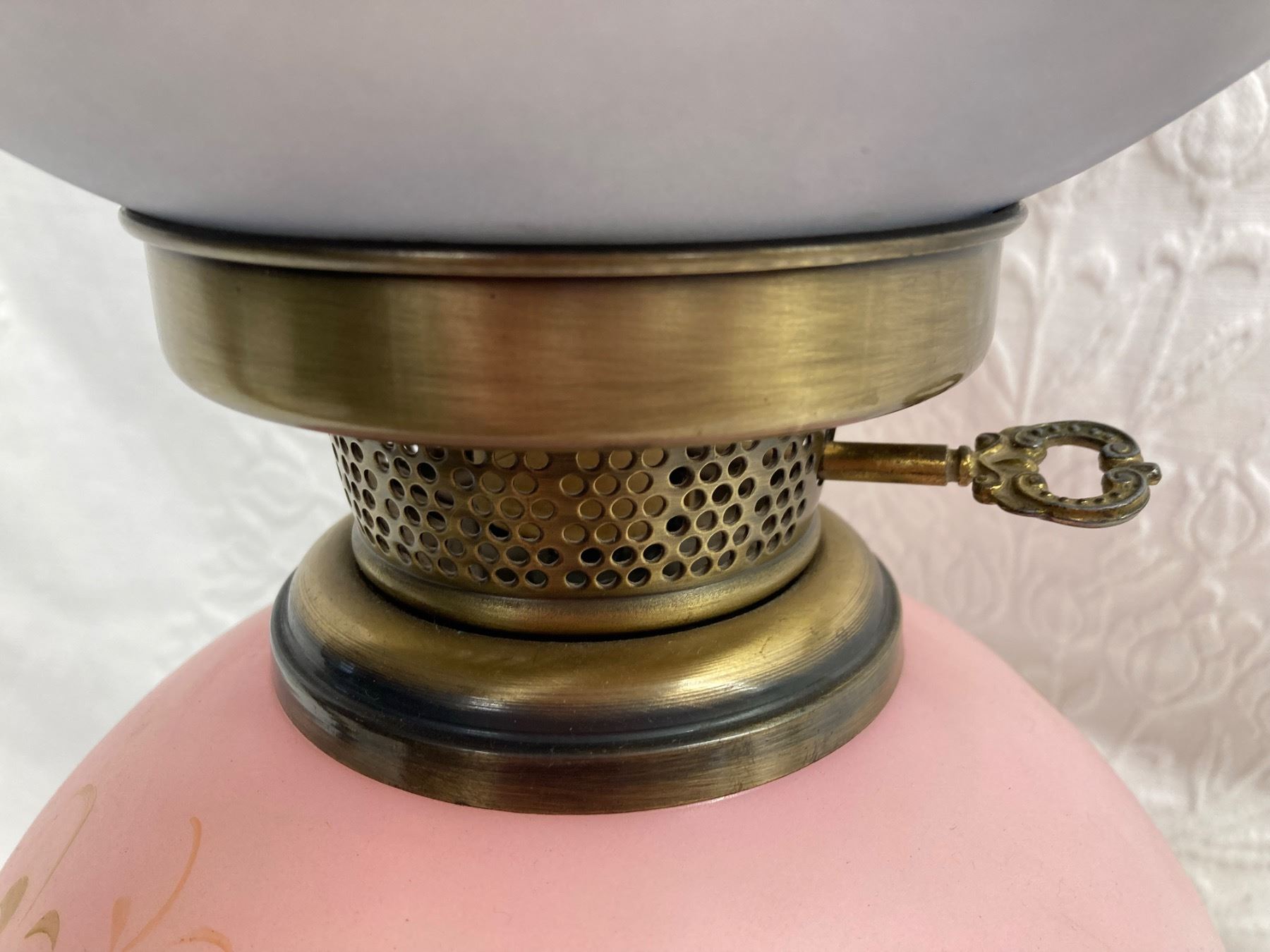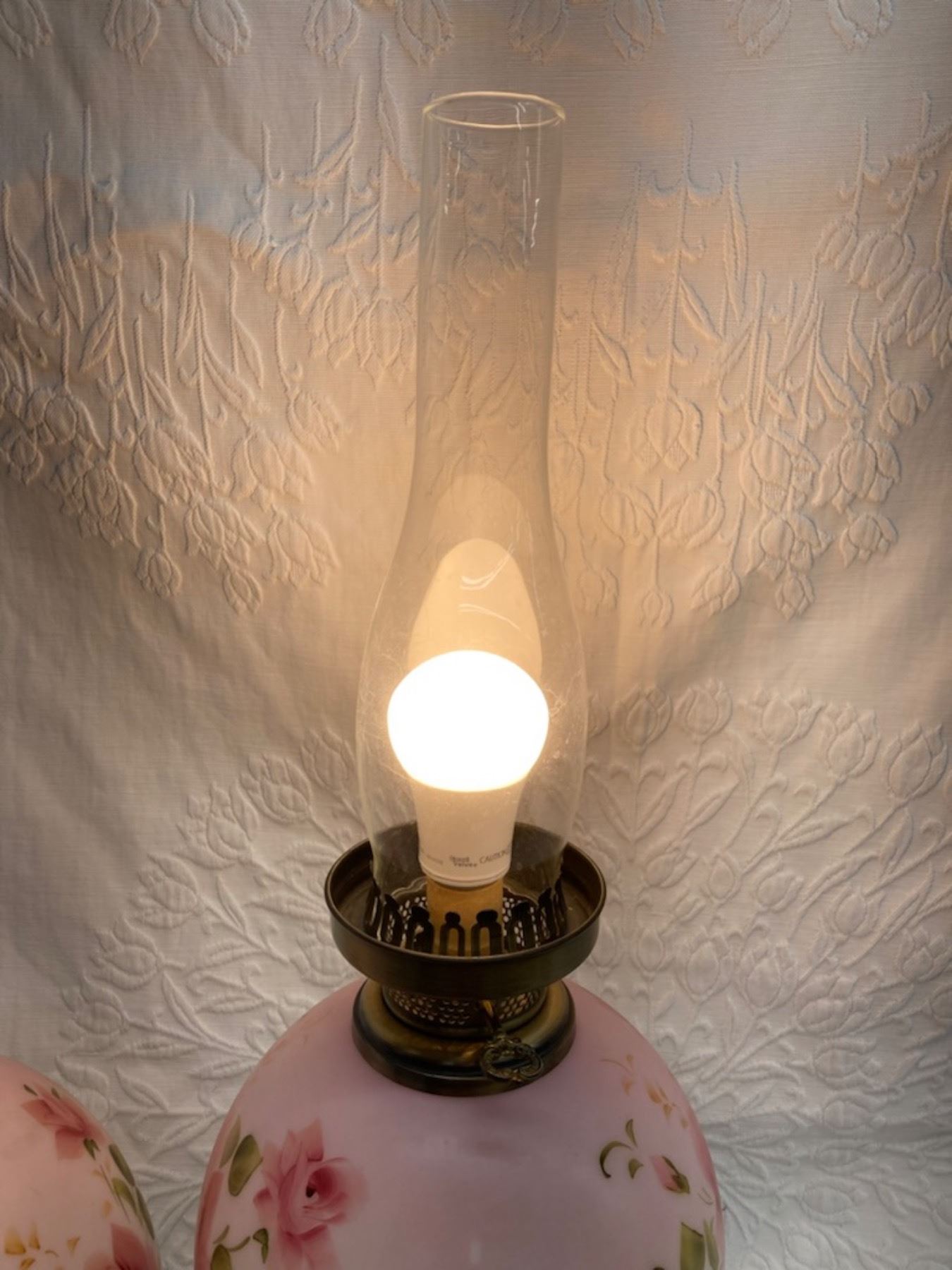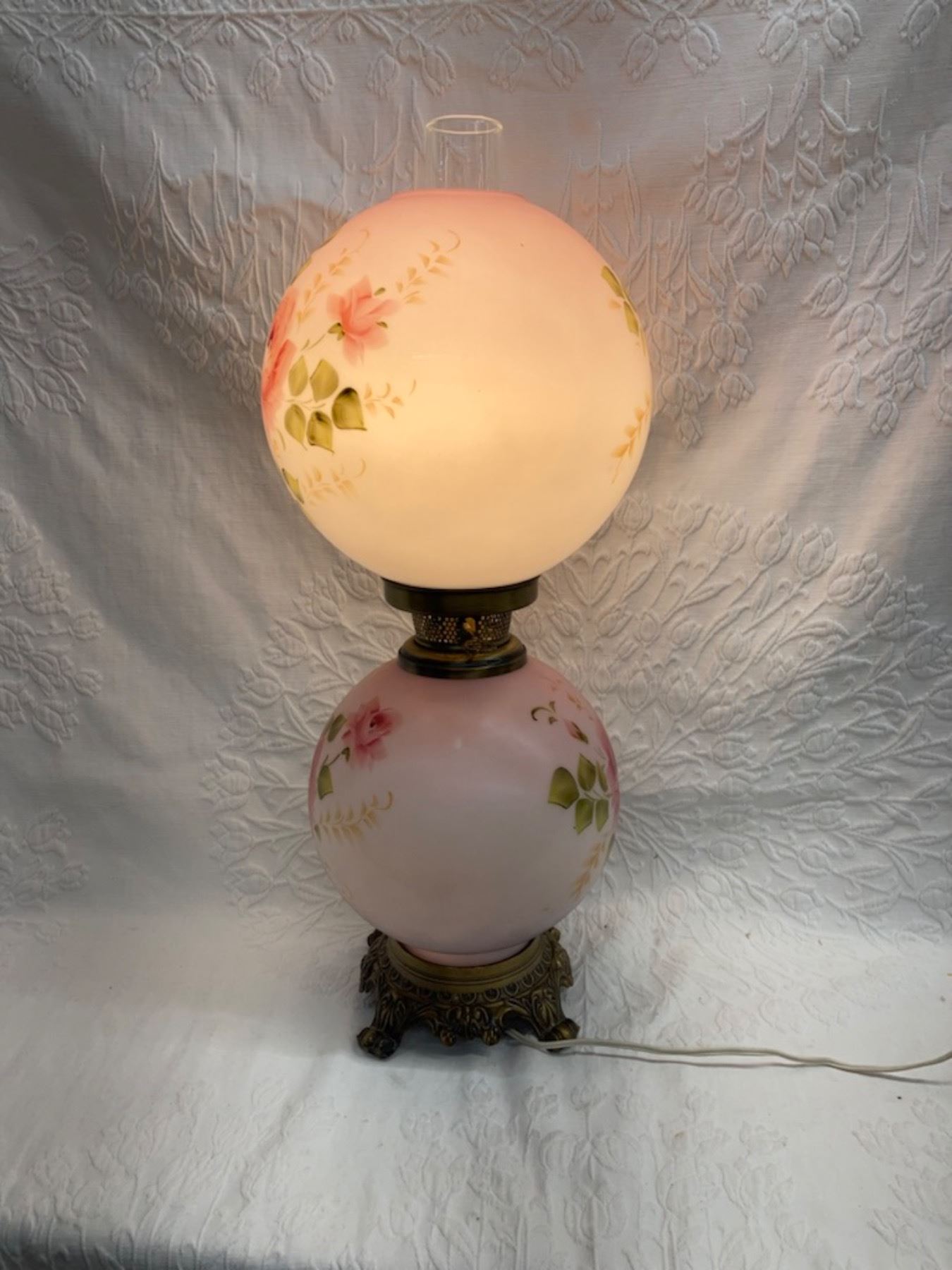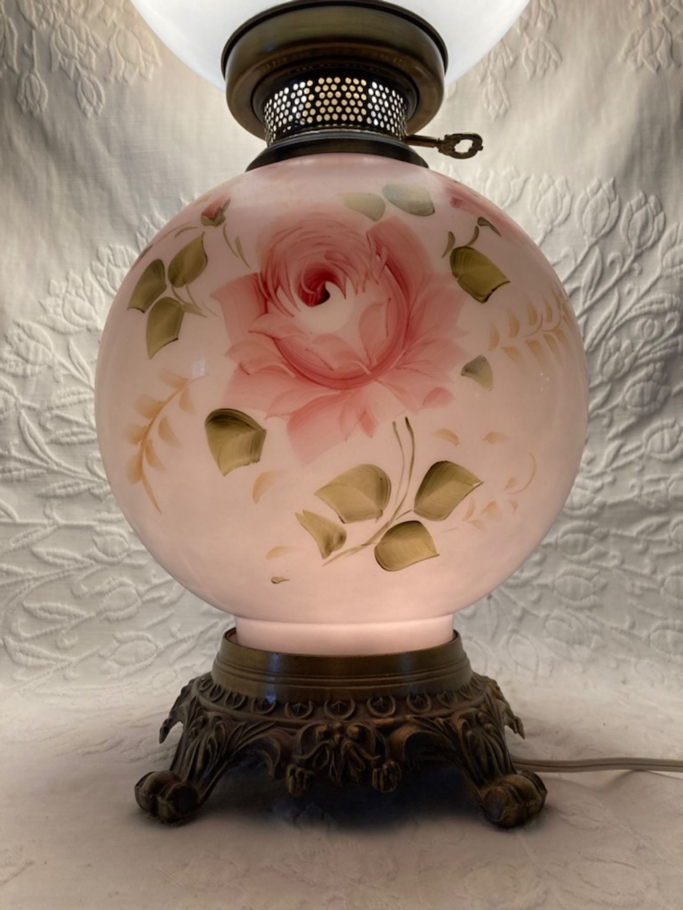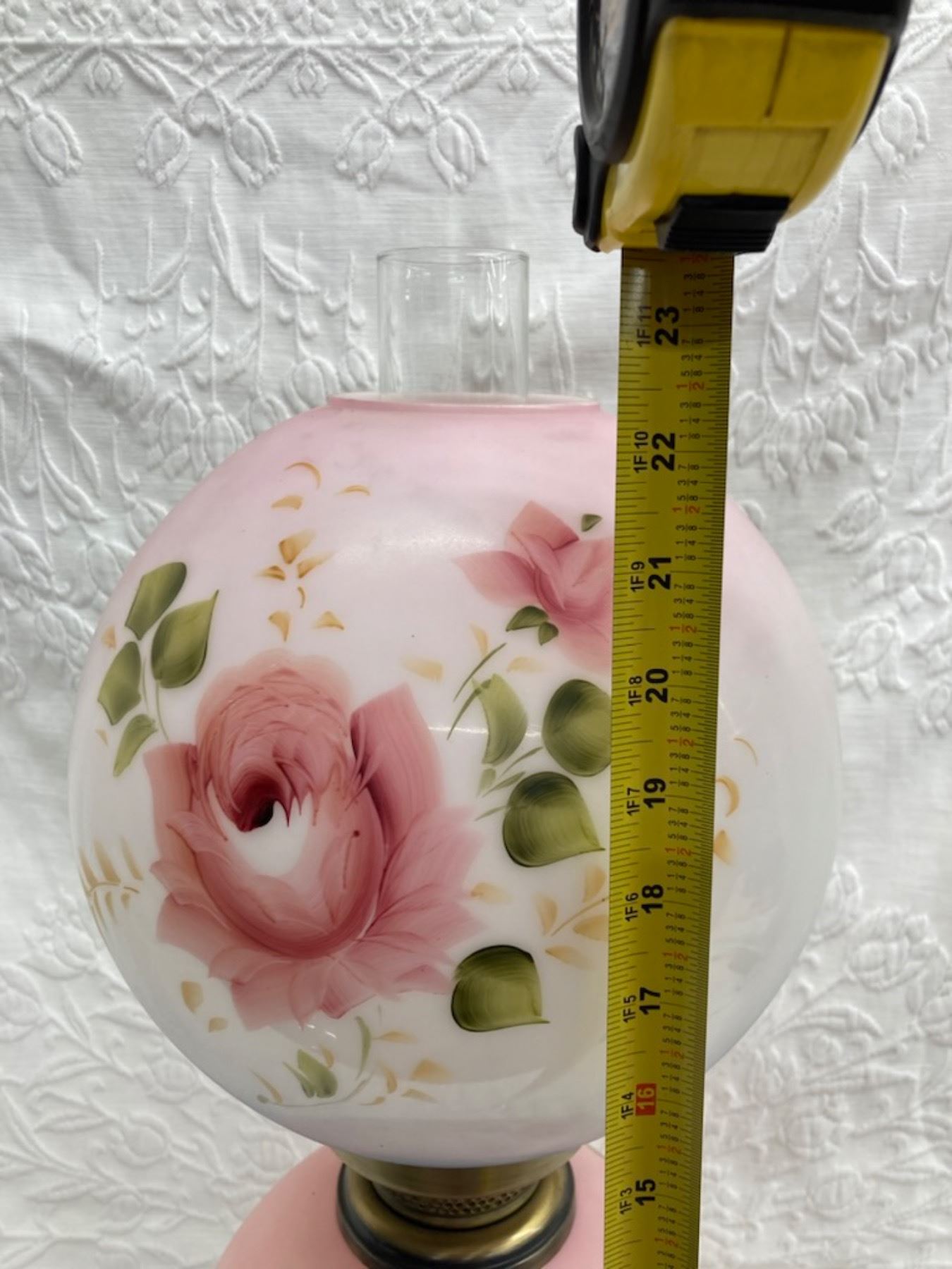 FEATURES HAND-PAINTED FLORAL DESIGN WITH PINK ROSES ON MILK GLASS GLOBES