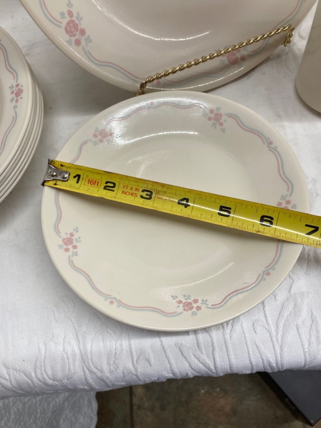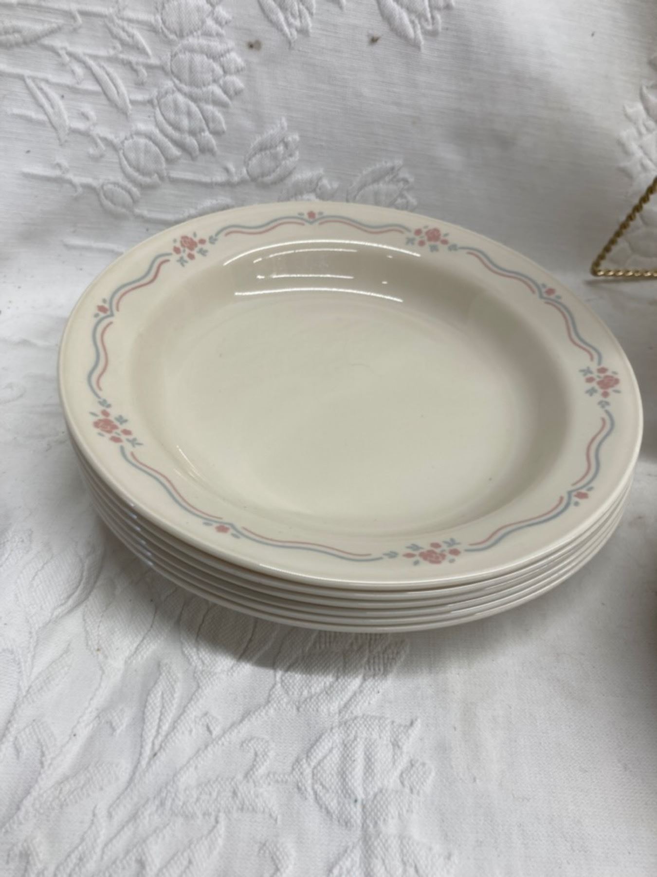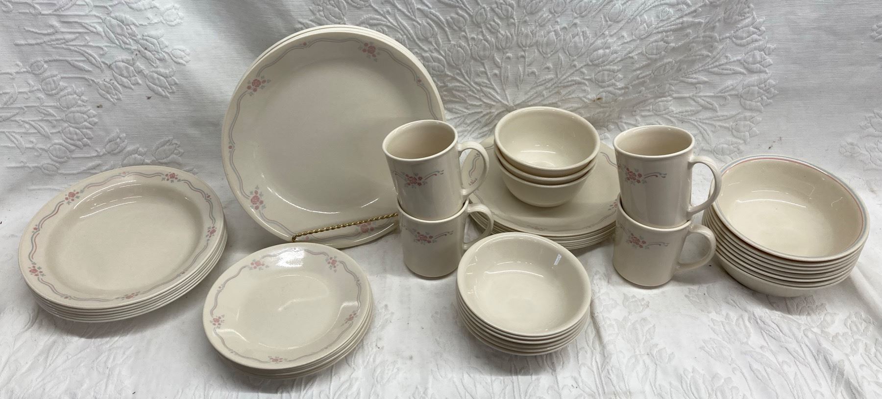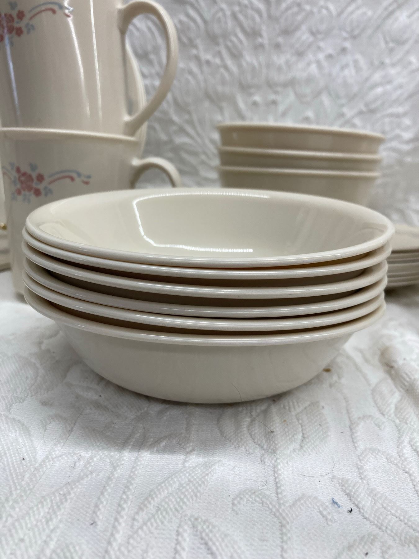 THE "ENGLISH BREAKFAST" PATTERN FEATURES A CREAM-COLORED BASE WITH A DELICATE PINK AND BLUE FLORAL DESIGN ALONG THE EDGES
