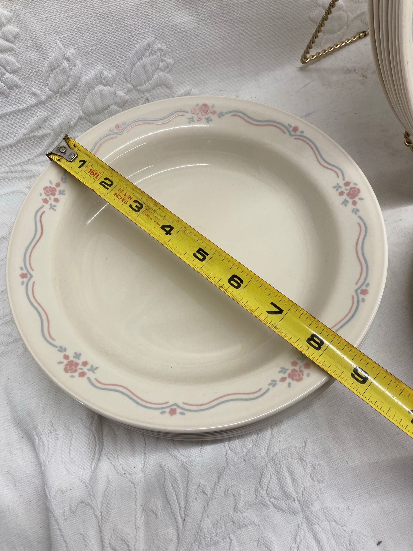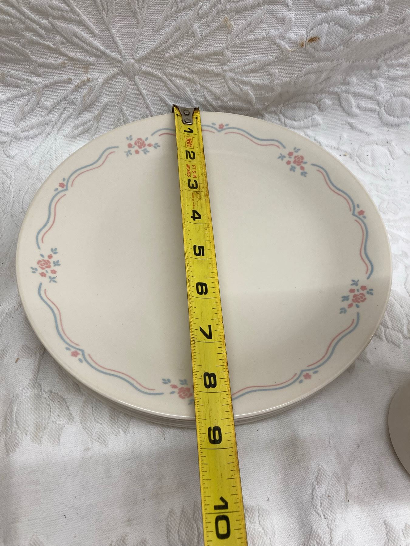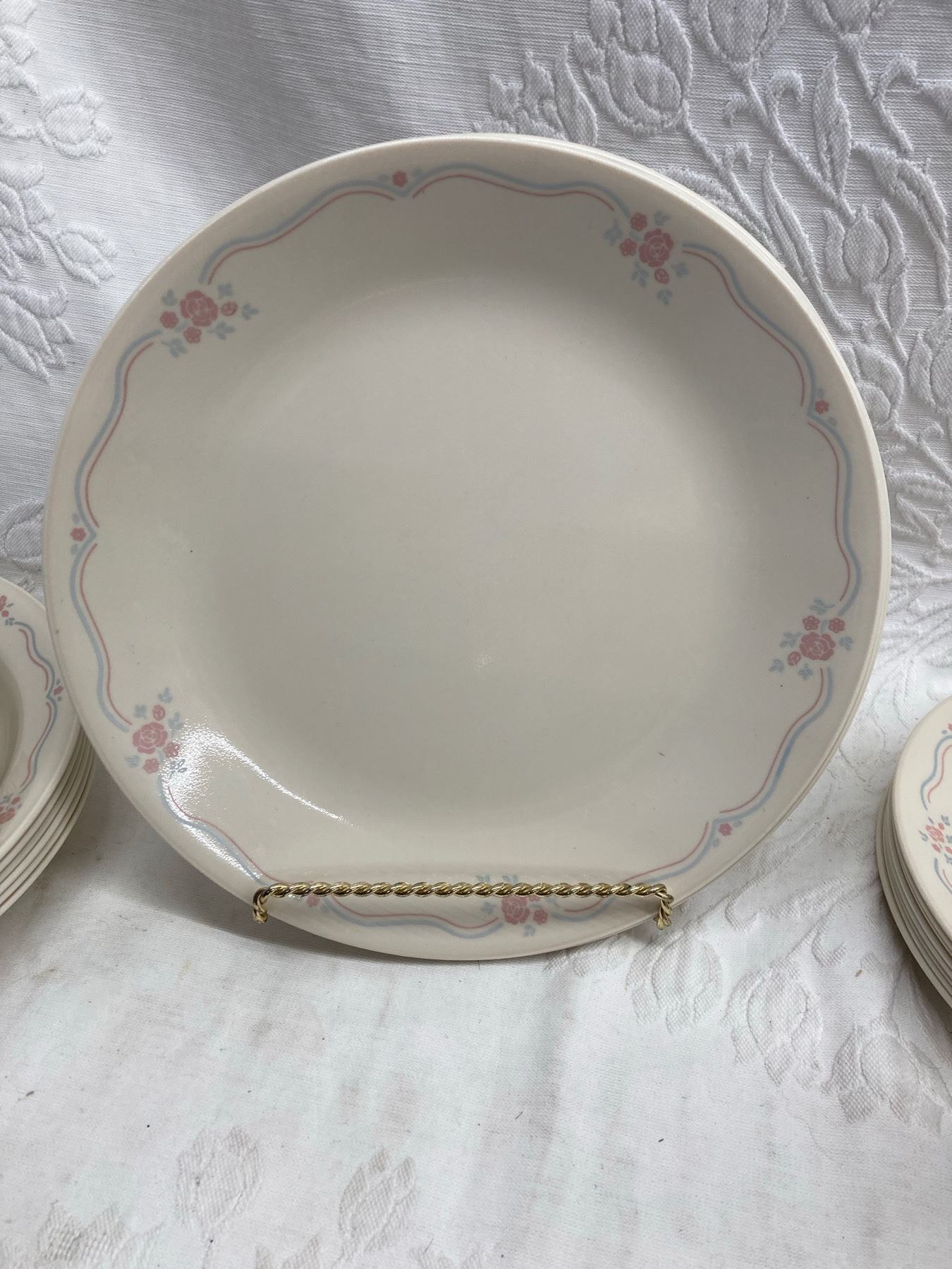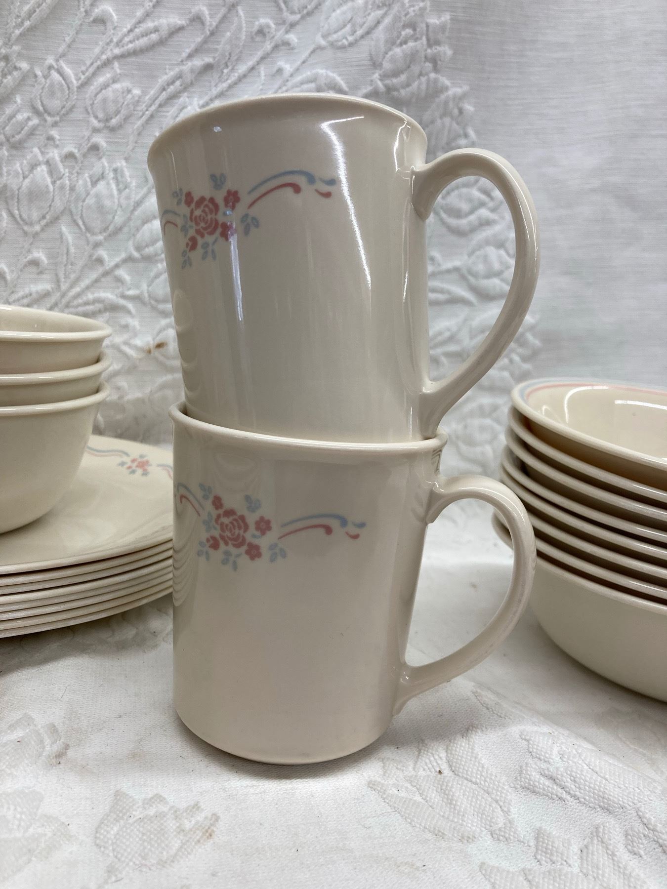 THE "ENGLISH BREAKFAST" PATTERN FEATURES A CREAM-COLORED BASE WITH A DELICATE PINK AND BLUE FLORAL DESIGN ALONG THE EDGES
