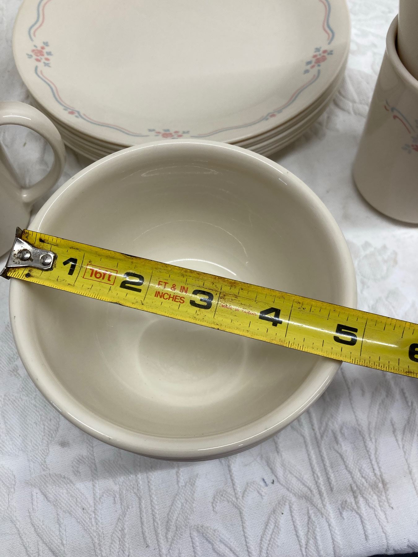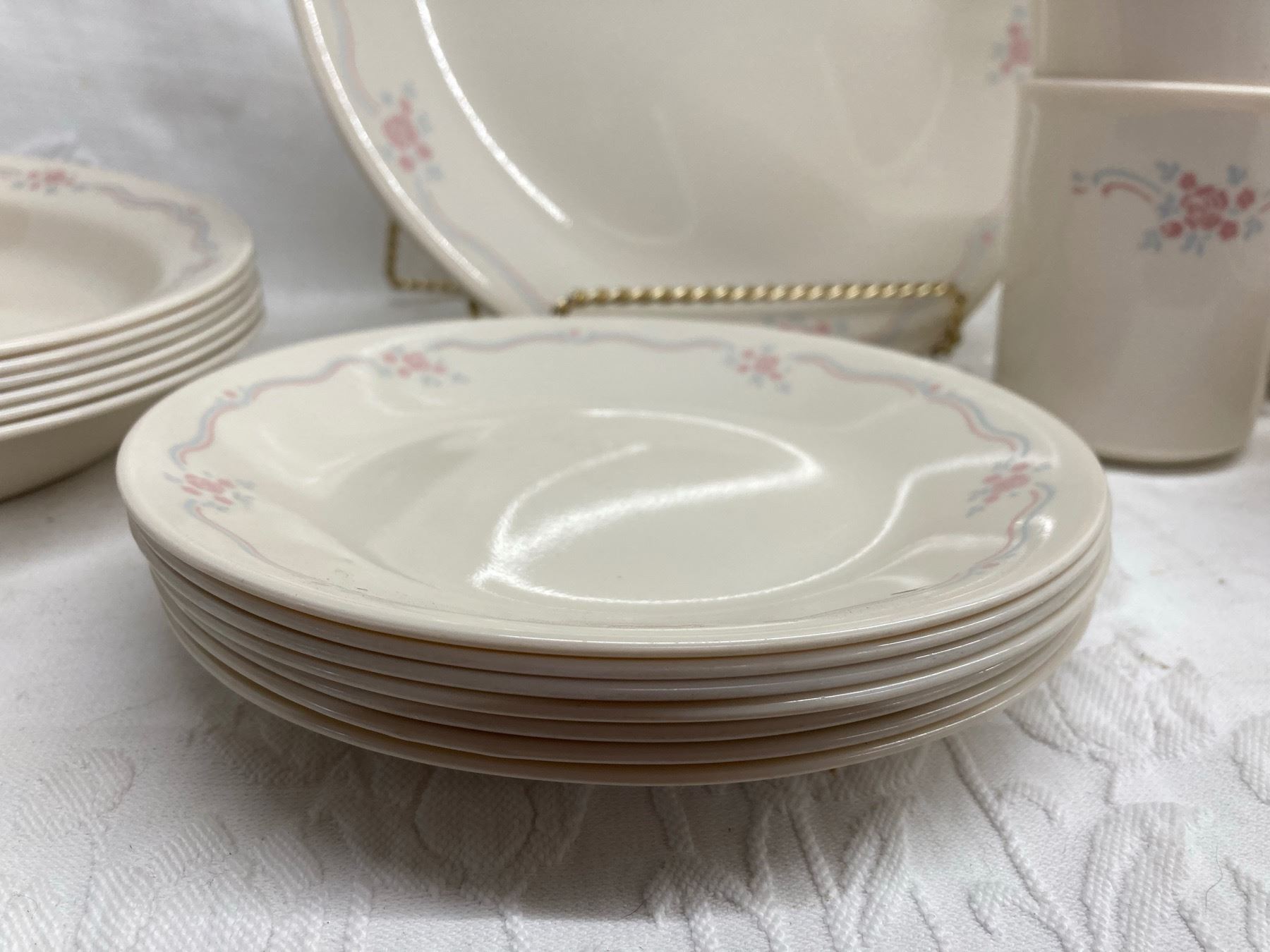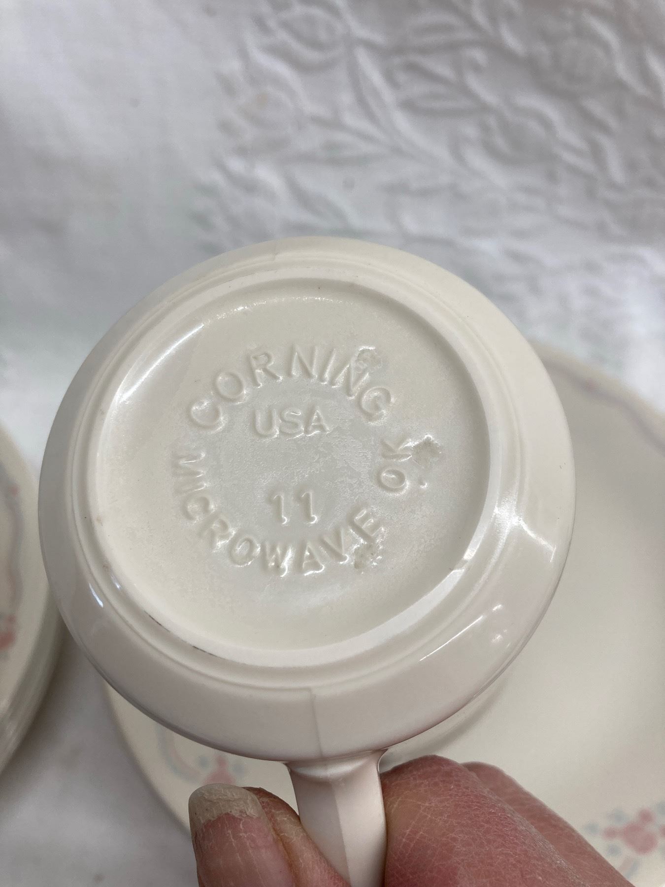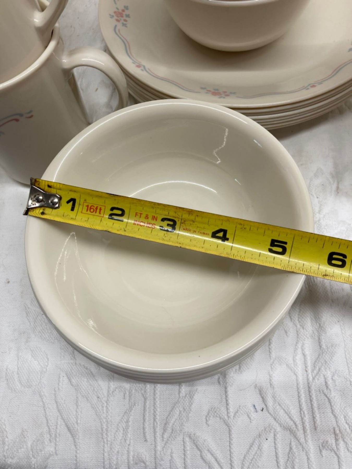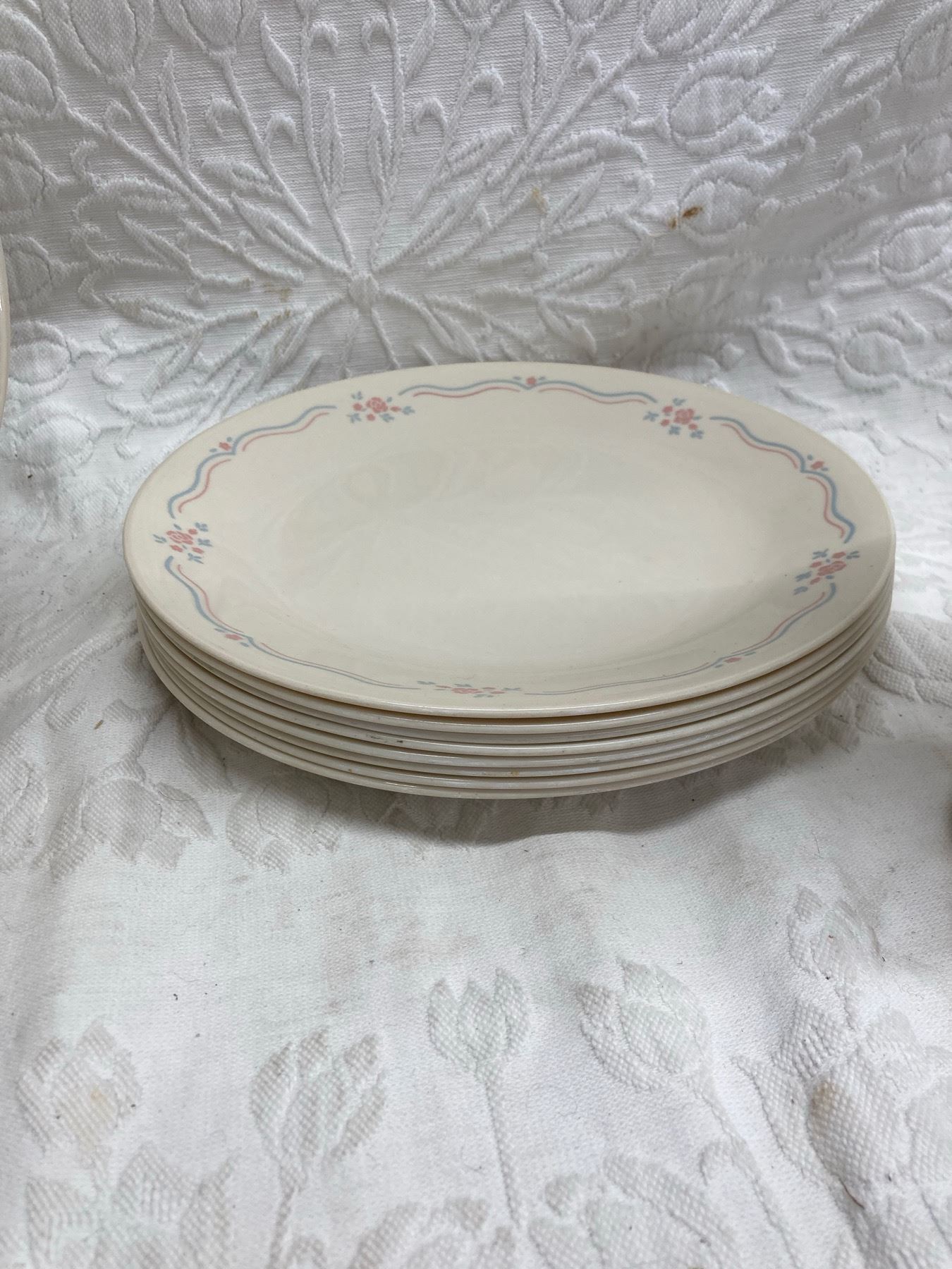 THE "ENGLISH BREAKFAST" PATTERN FEATURES A CREAM-COLORED BASE WITH A DELICATE PINK AND BLUE FLORAL DESIGN ALONG THE EDGES