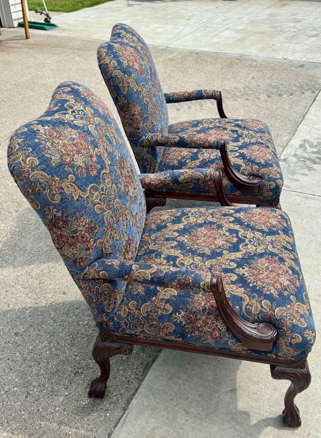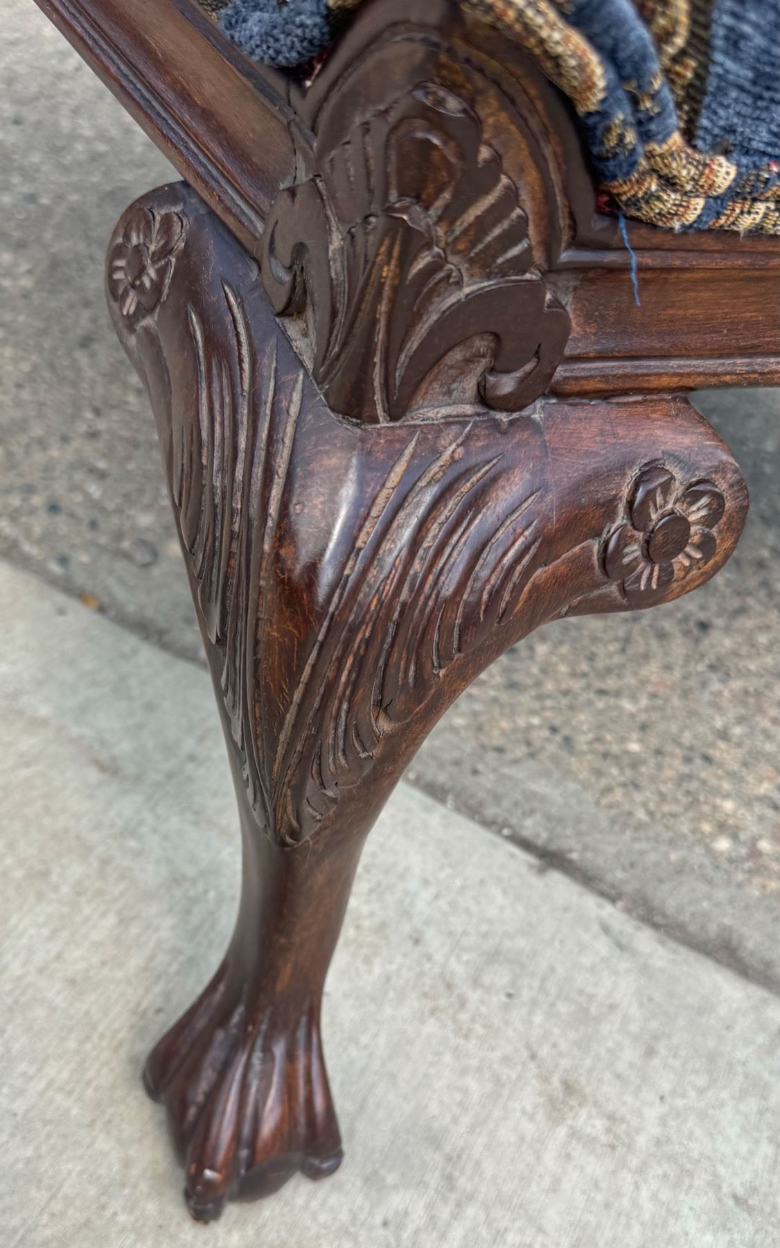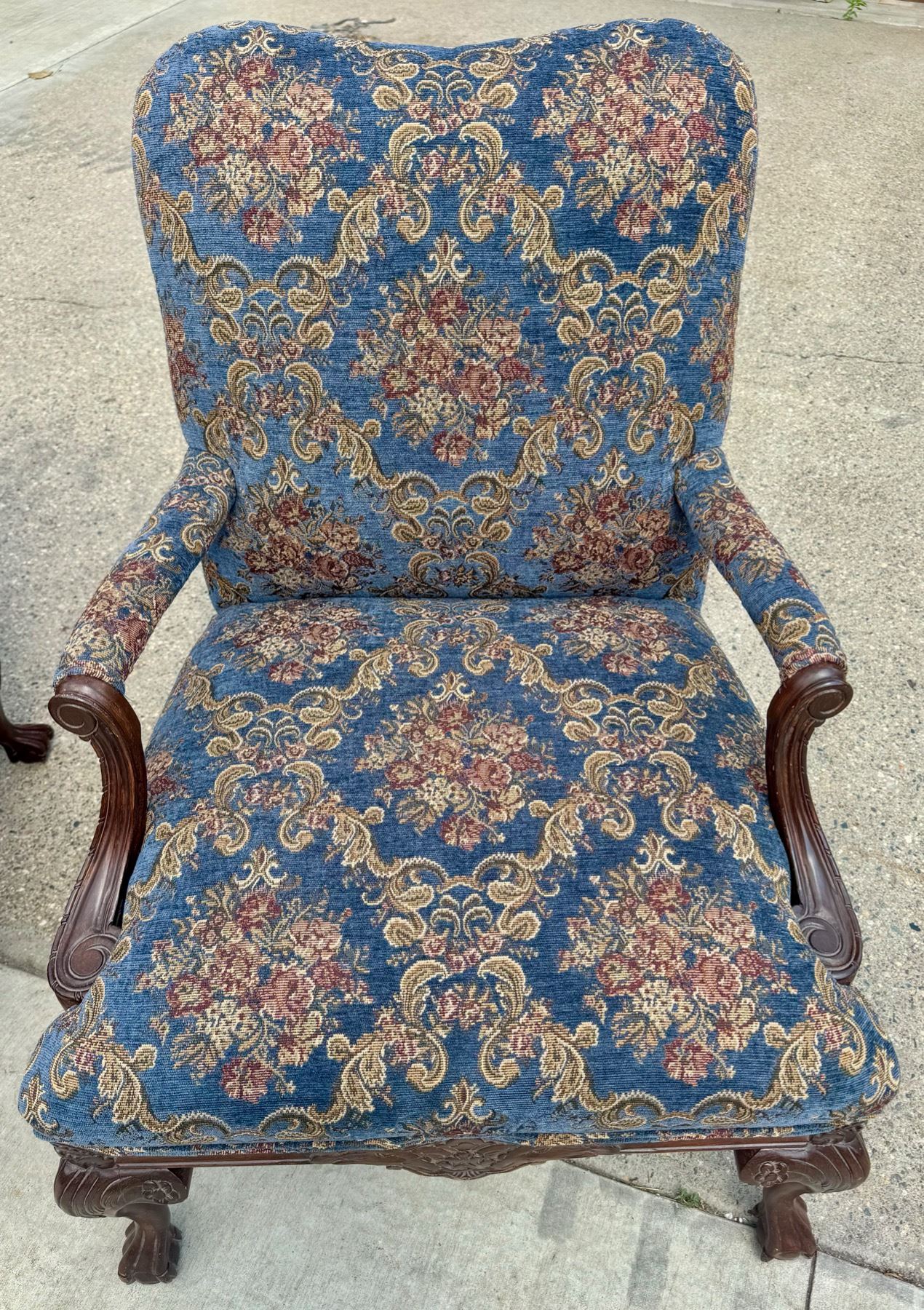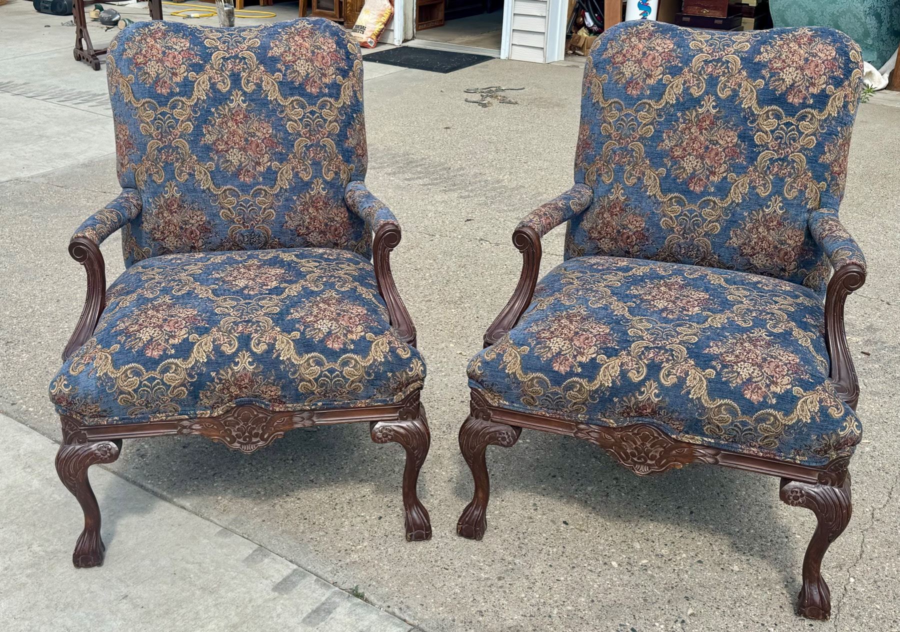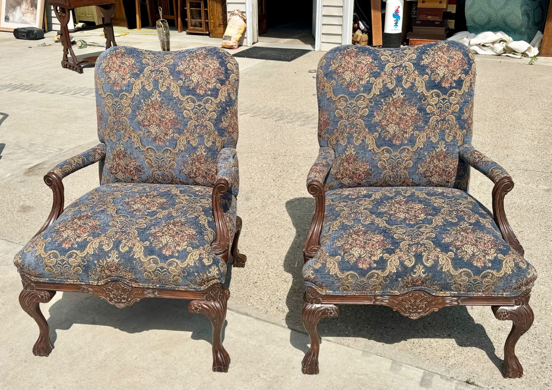 VINTAGE GEORGIAN STYLE CARVED MAHOGANY TAPESTRY ARMCHAIRS, PAIR
