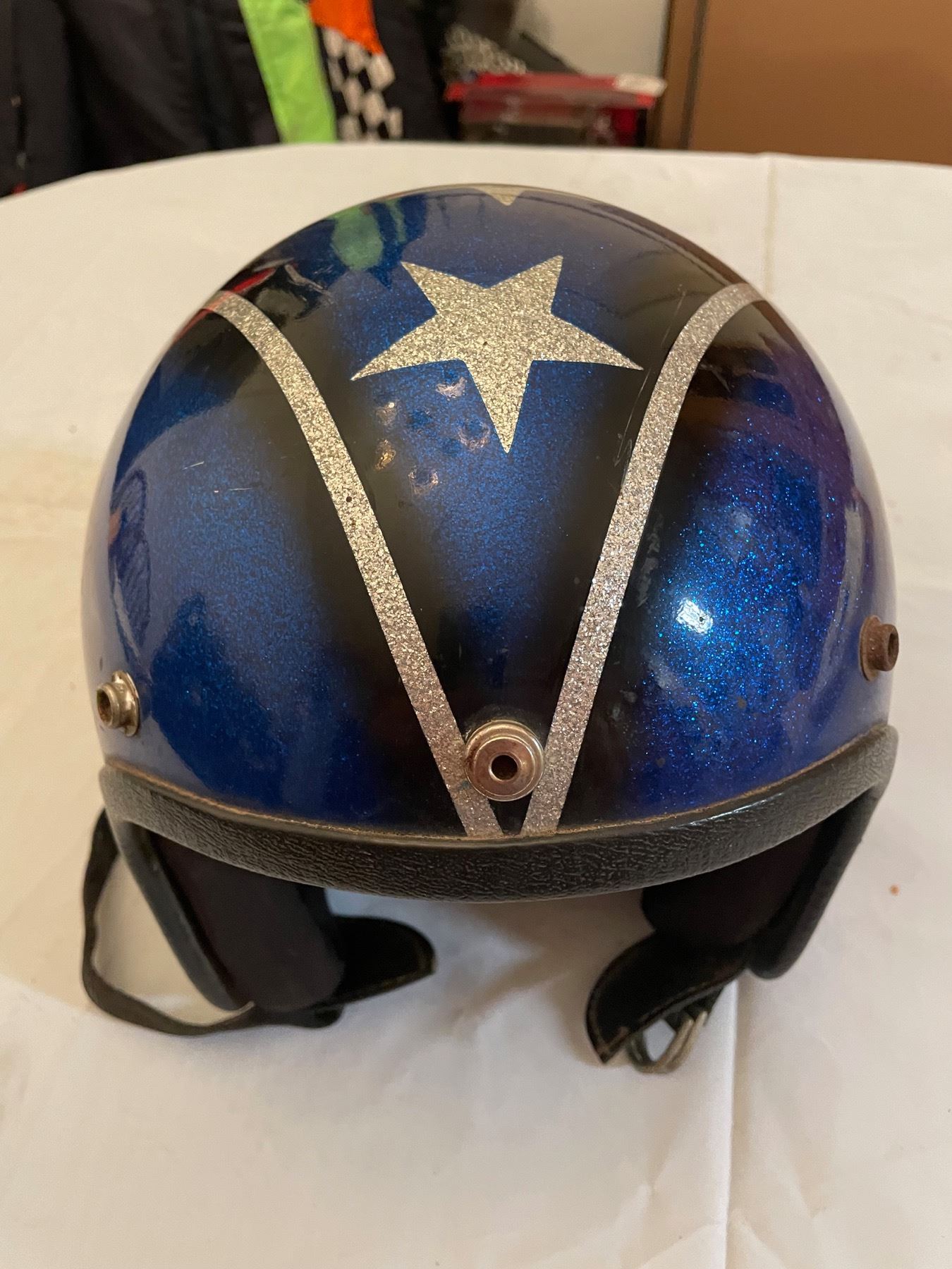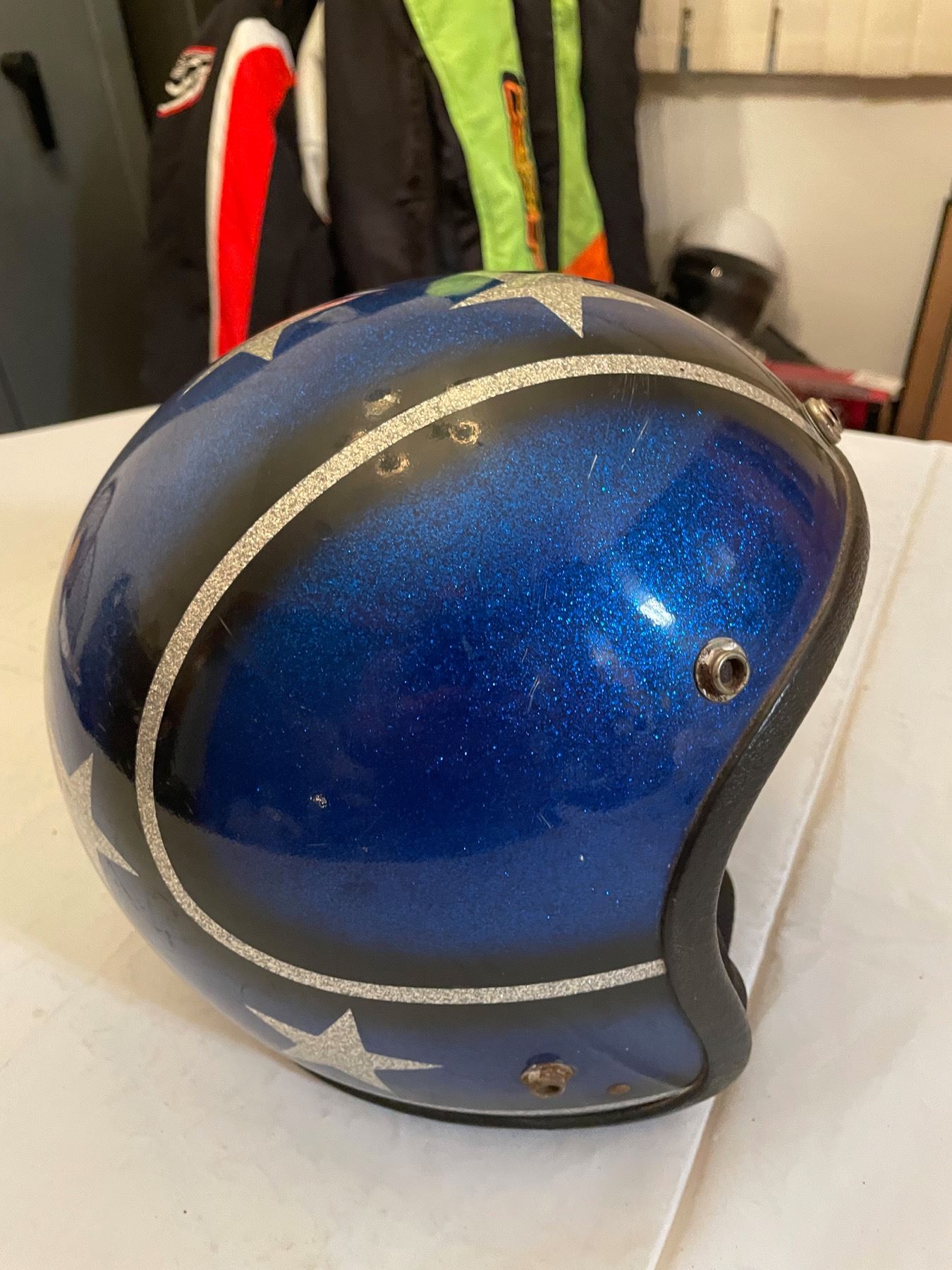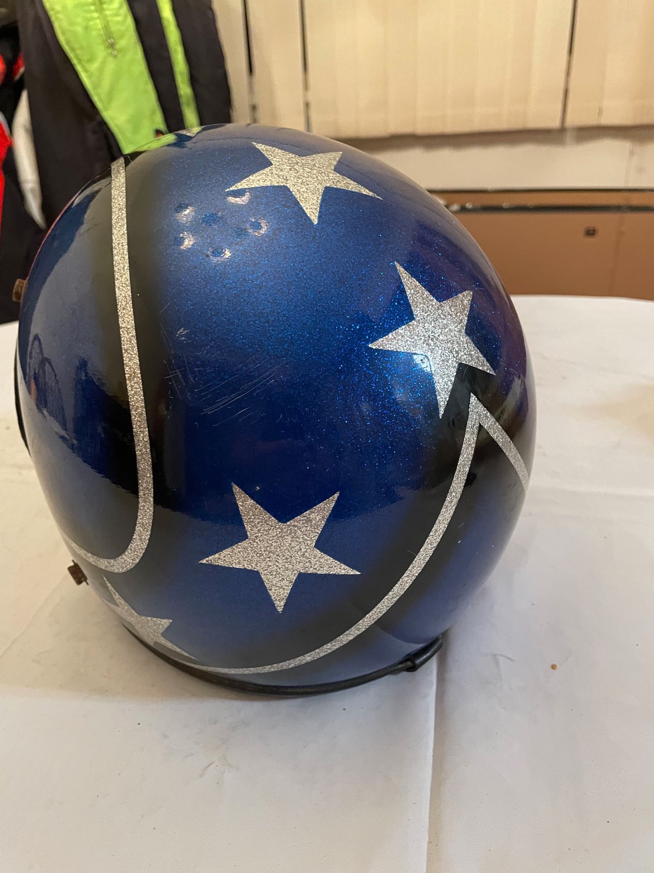 VINTAGE METAL FLAKE BLUE WITH METAL FLAKE SILVER STARS AND STRIPES HELMET;