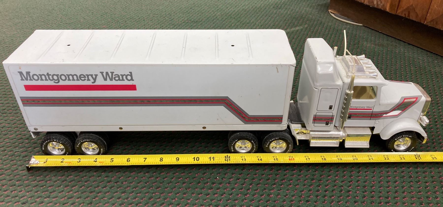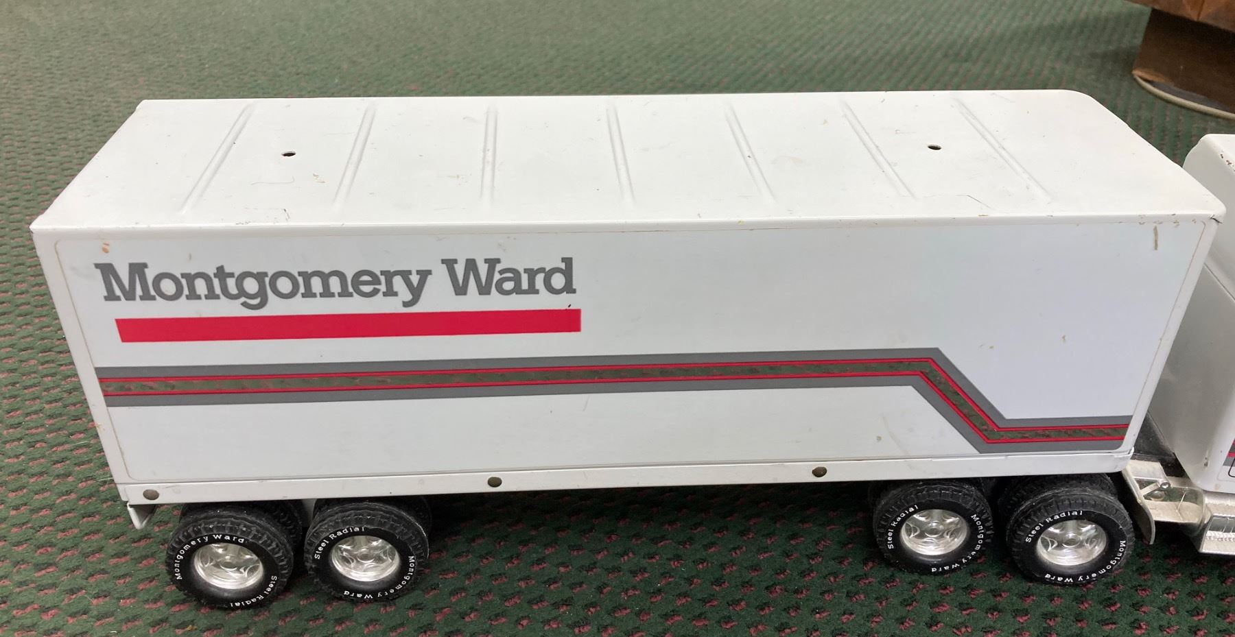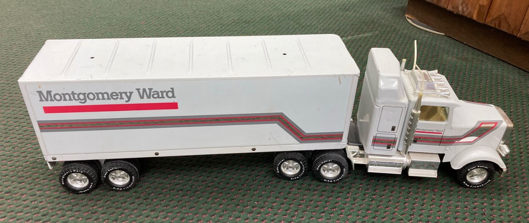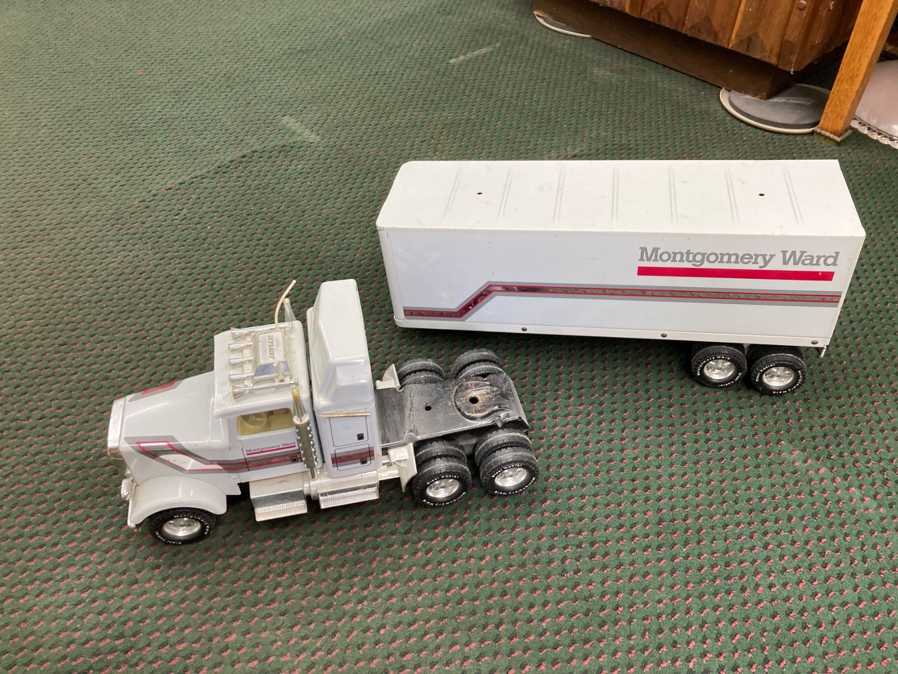 IT IS A LARGE DIE-CAST SEMI-TRACTOR TRAILER SET FEATURING THE MONTGOMERY WARD LOGO ON THE TRAILER AND CAB