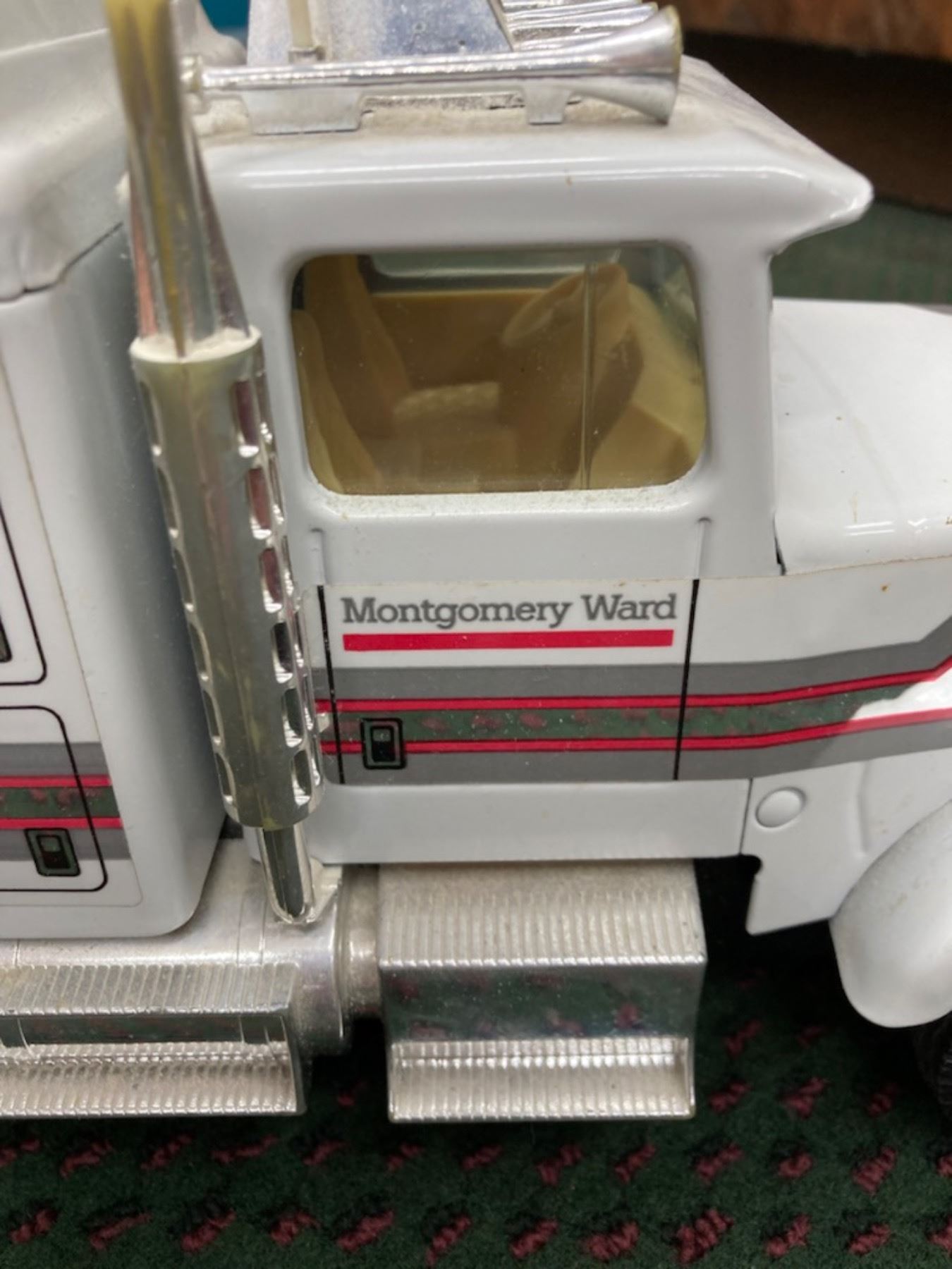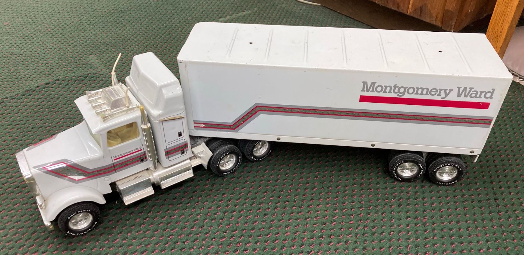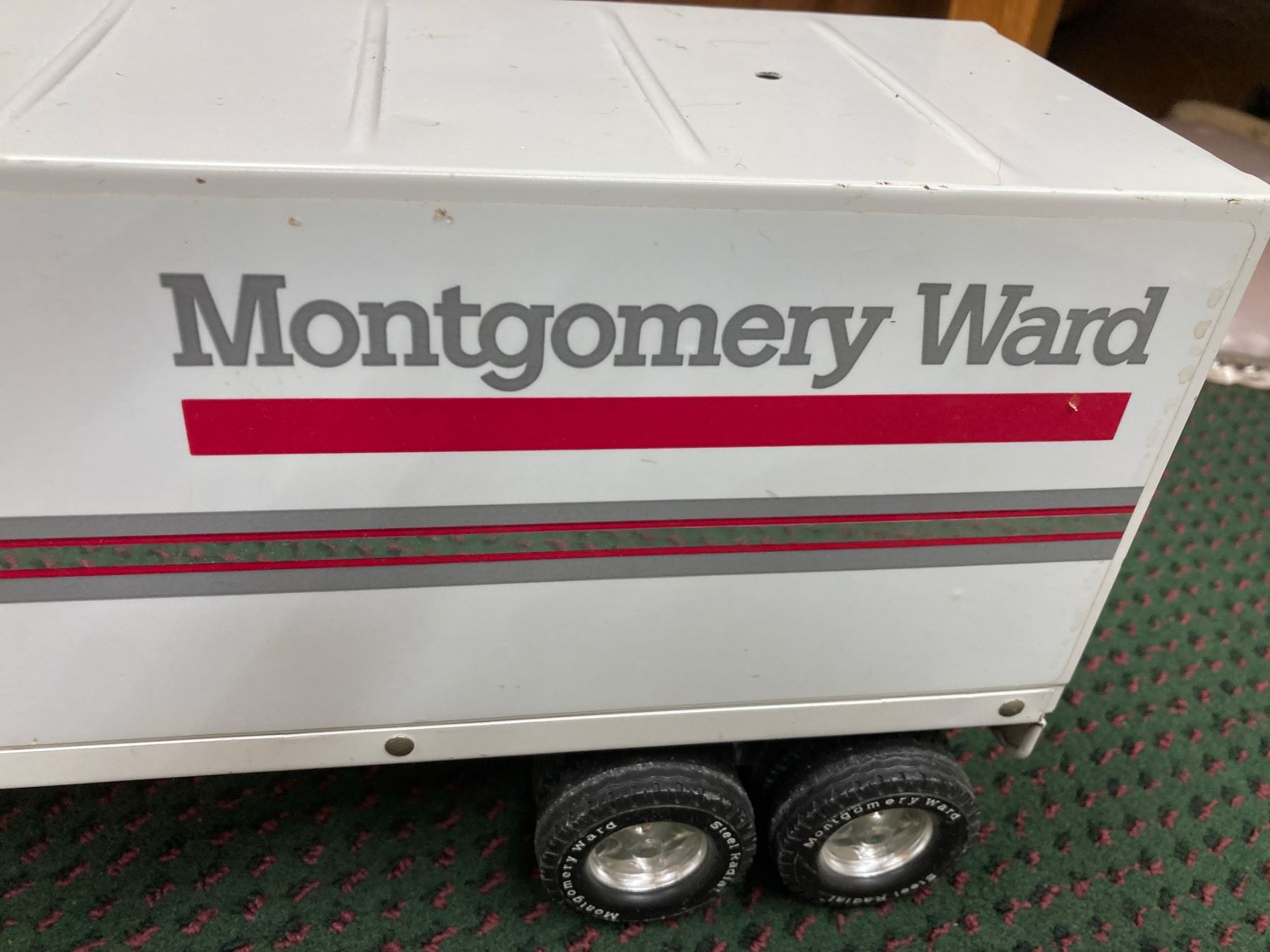 IT IS A LARGE DIE-CAST SEMI-TRACTOR TRAILER SET FEATURING THE MONTGOMERY WARD LOGO ON THE TRAILER AND CAB