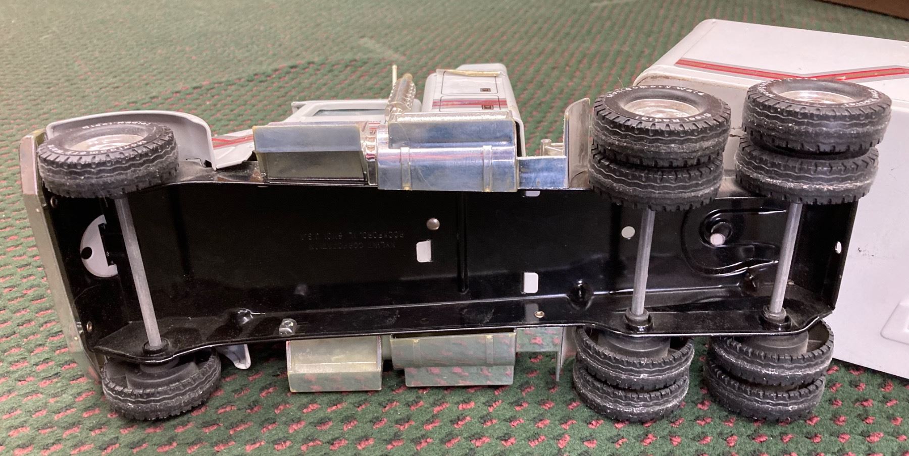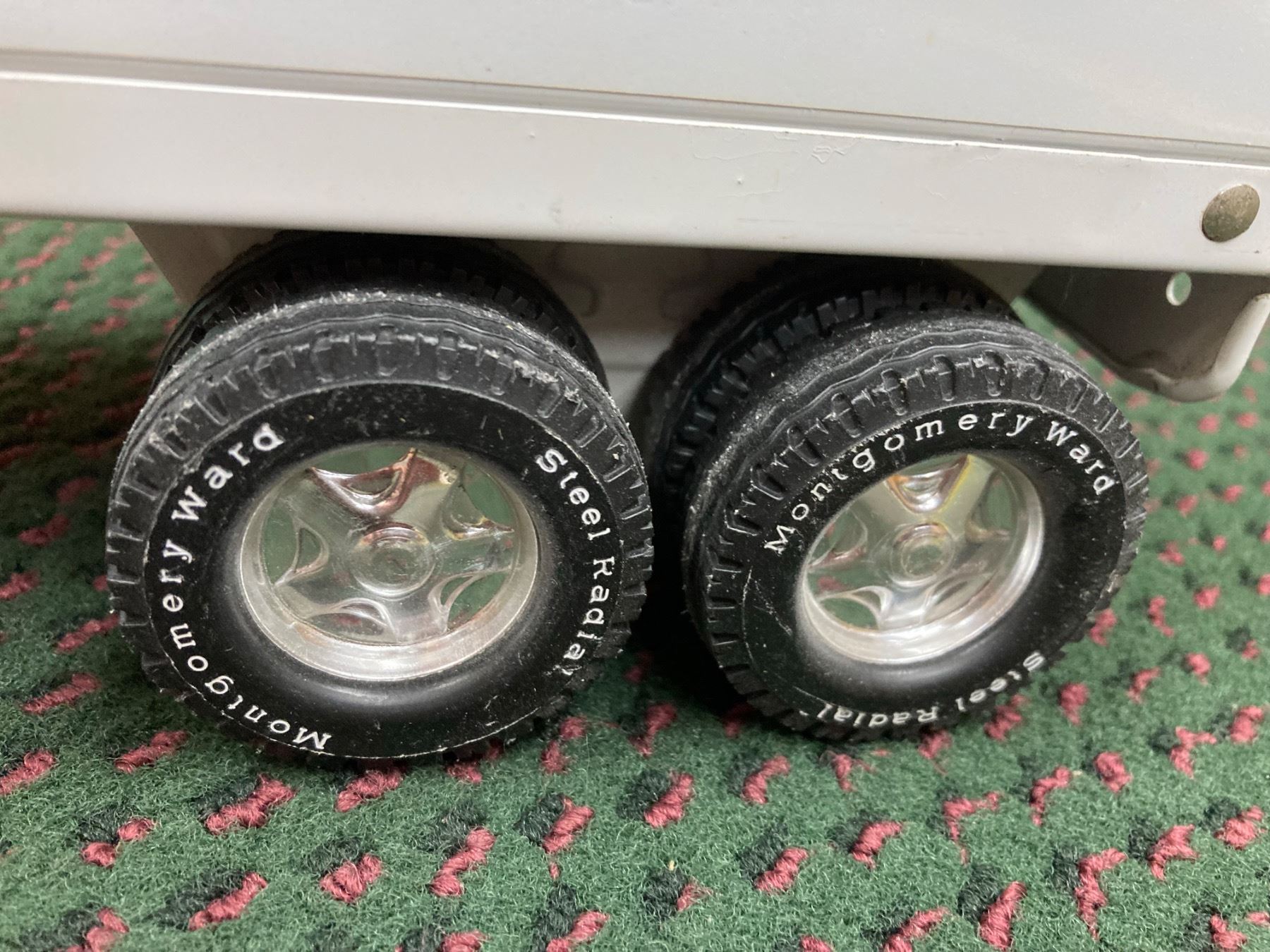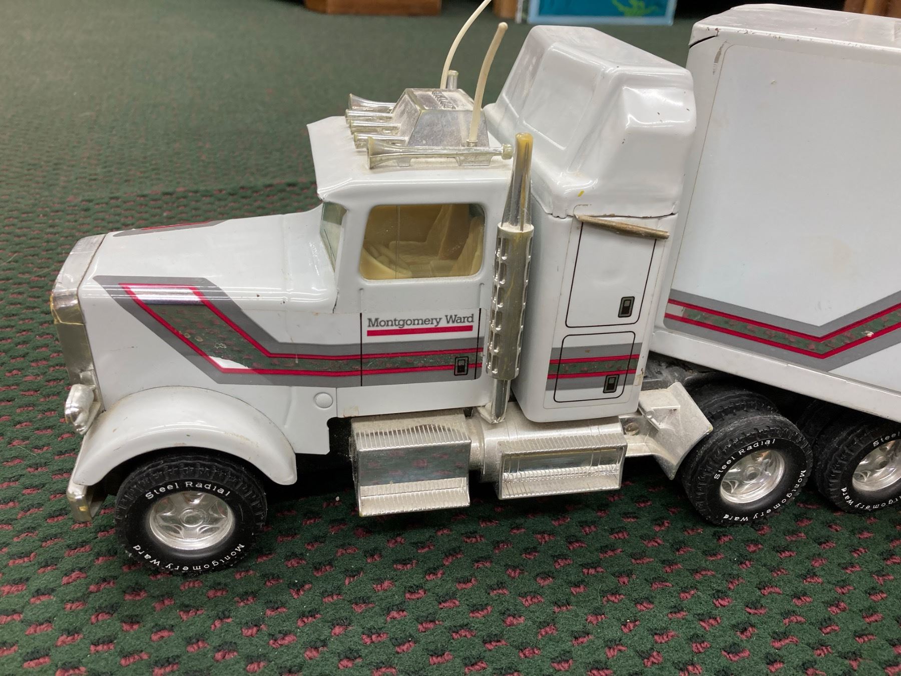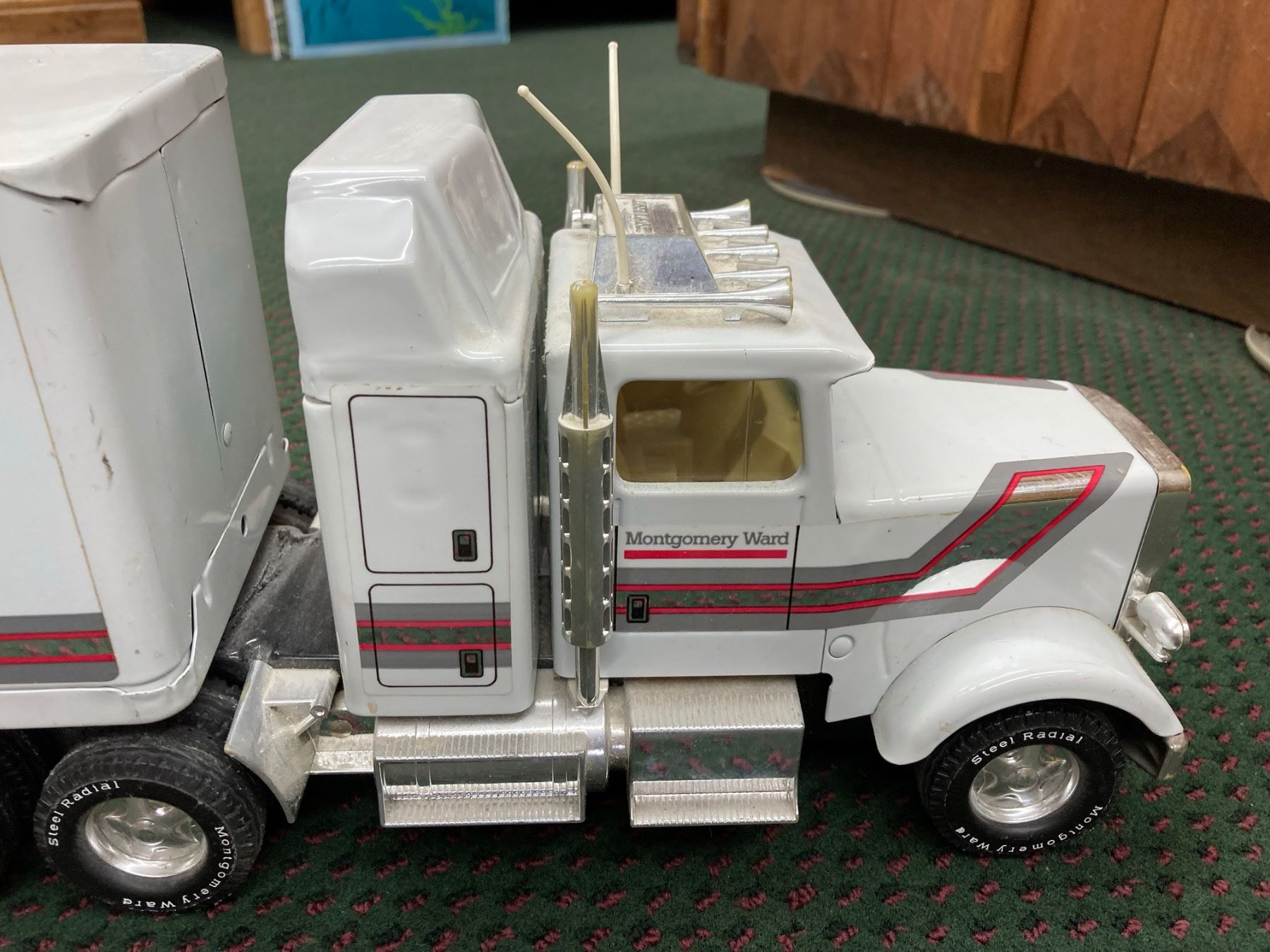 IT IS A LARGE DIE-CAST SEMI-TRACTOR TRAILER SET FEATURING THE MONTGOMERY WARD LOGO ON THE TRAILER AND CAB