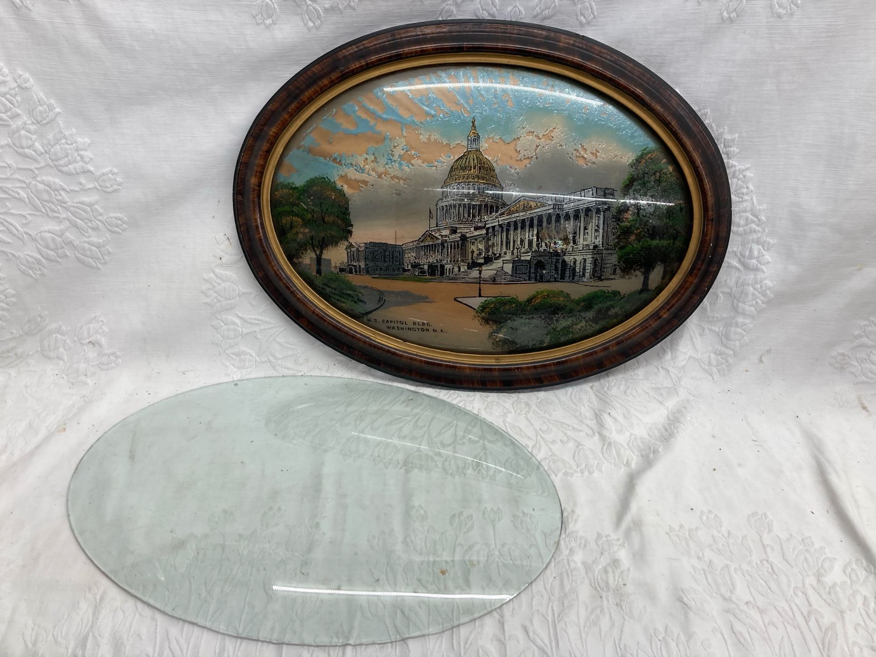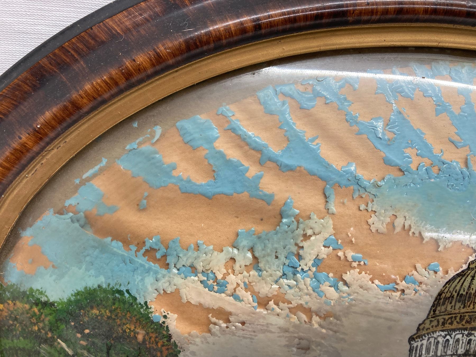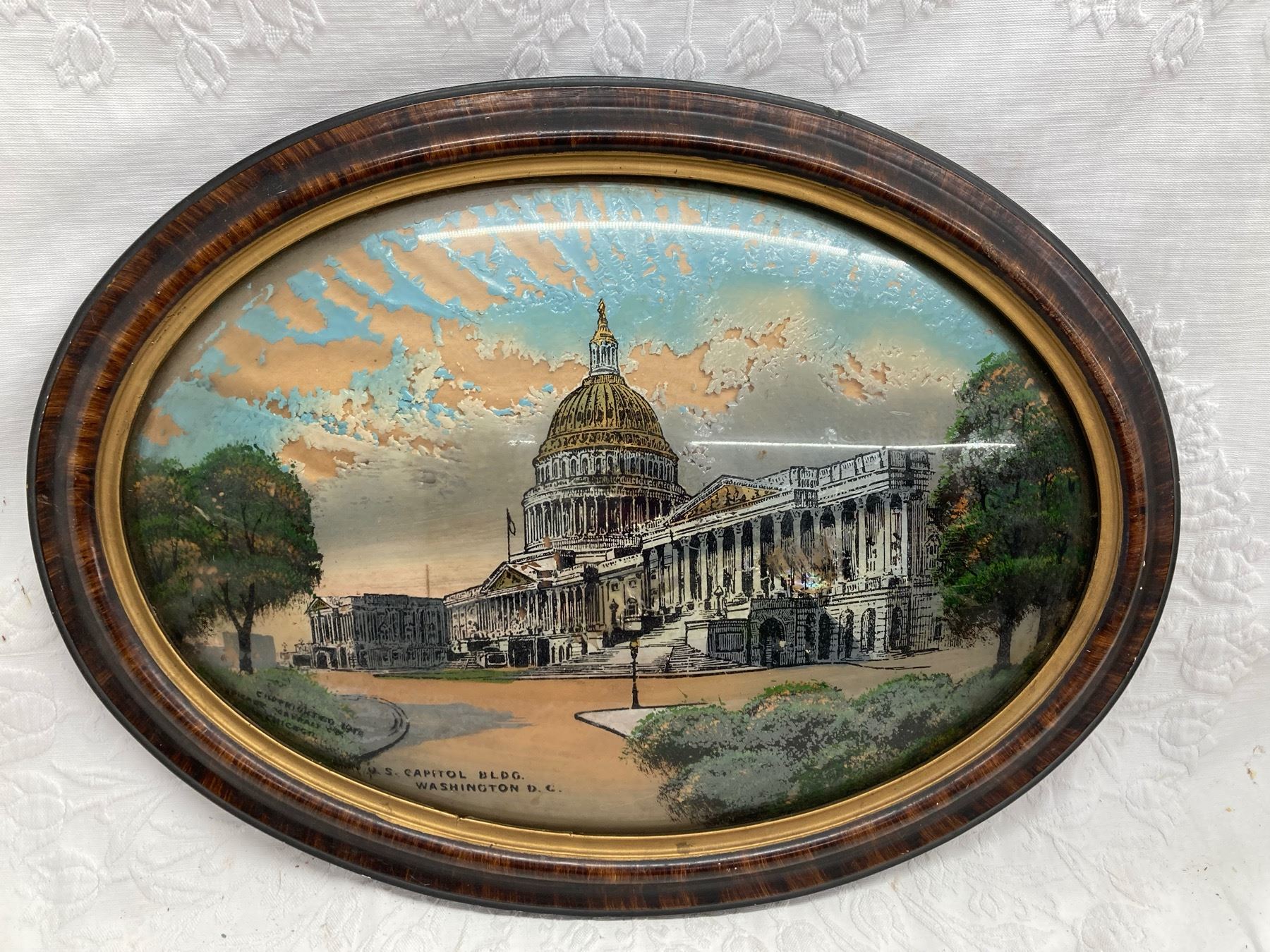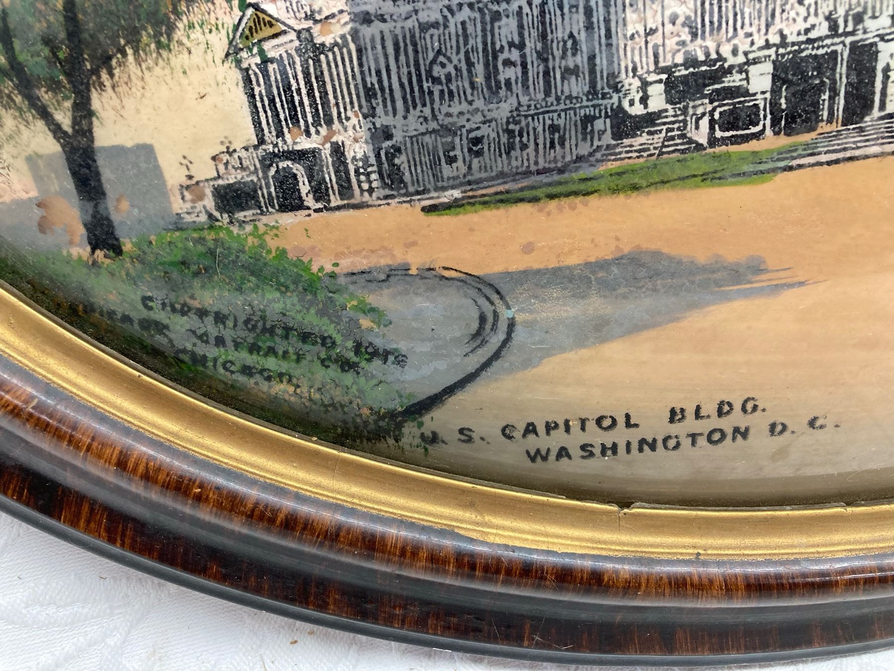 VINTAGE REVERSE PAINTING ON CONVEX BUBBLE GLASS DEPICTING THE UNITED STATES CAPITOL BUILDING IN WASHINGTON D.C., TYPICALLY DATING FROM AROUND 1916