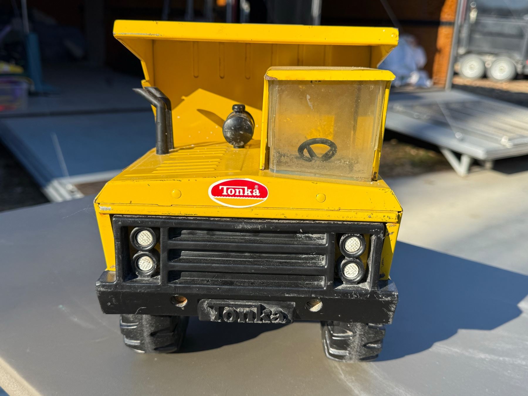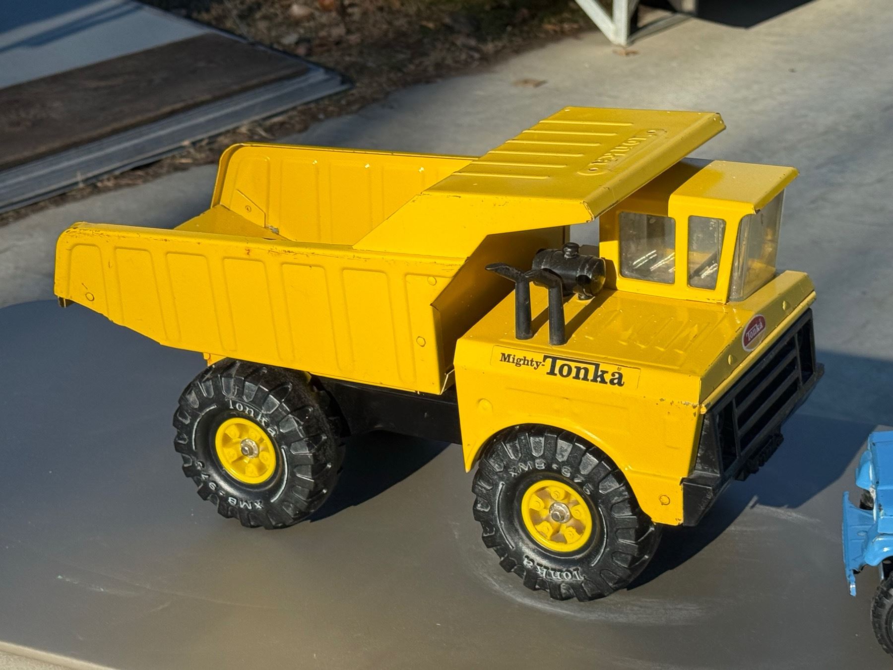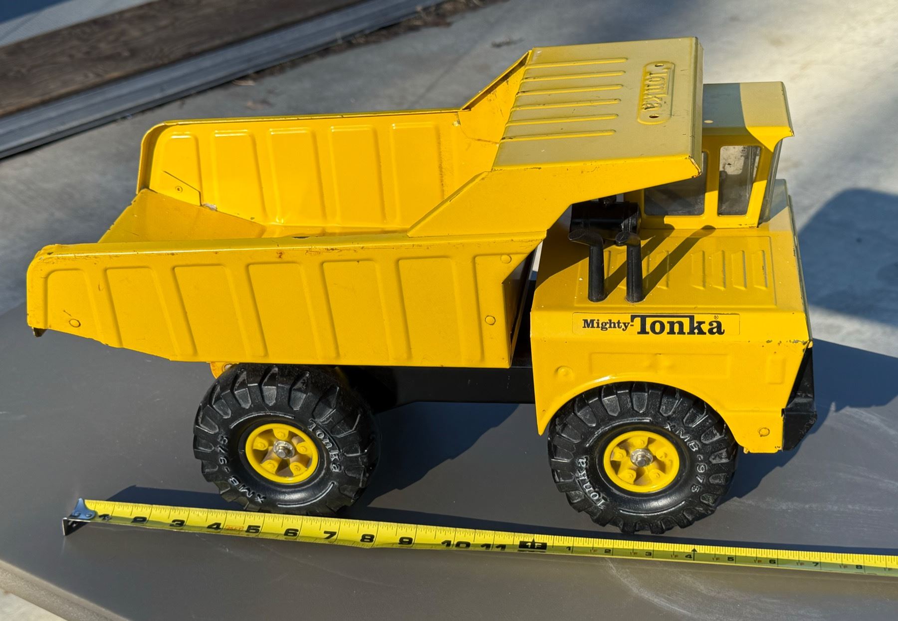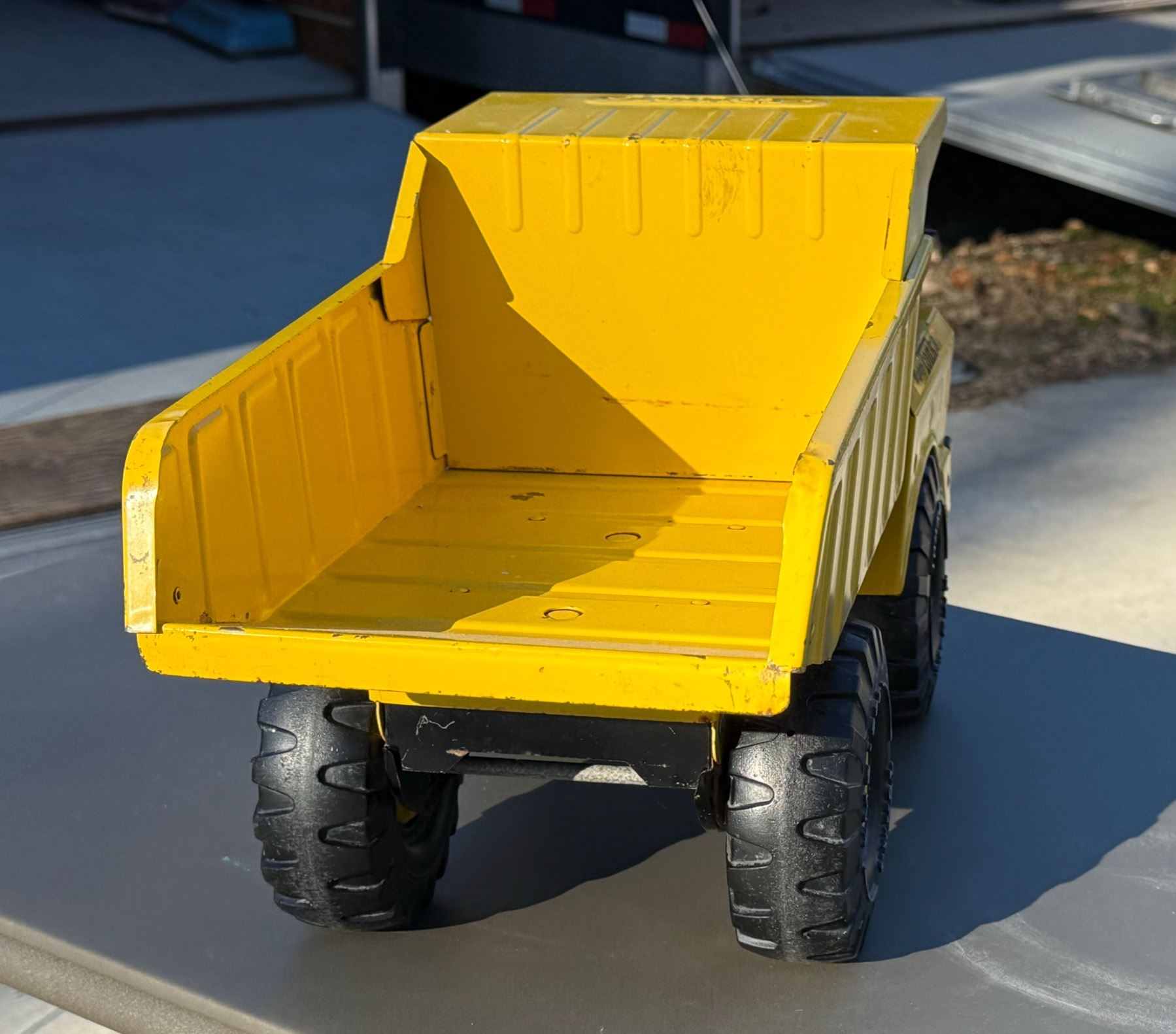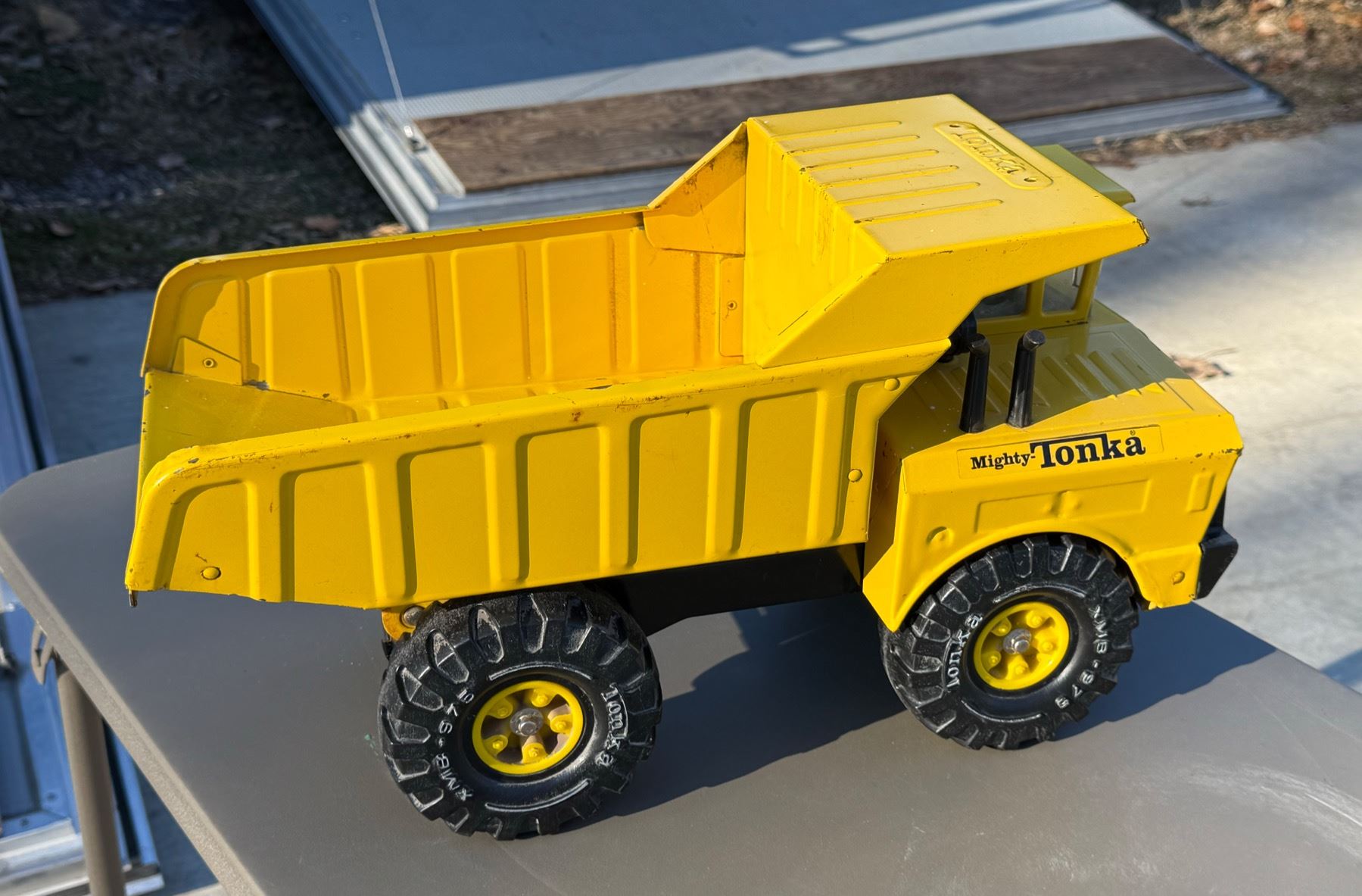 TONKA CLASSIC STEEL MIGHTY DUMP TRUCK, KNOWN FOR ITS DURABLE STEEL CONSTRUCTION AND MOVABLE BED FOR HAULING AND DUMPING; A POPULAR TOY FOR DECADES, DESIGNED TO WITHSTAND TOUGH PLAY AND INSPIRE IMAGINATIVE ADVENTURES