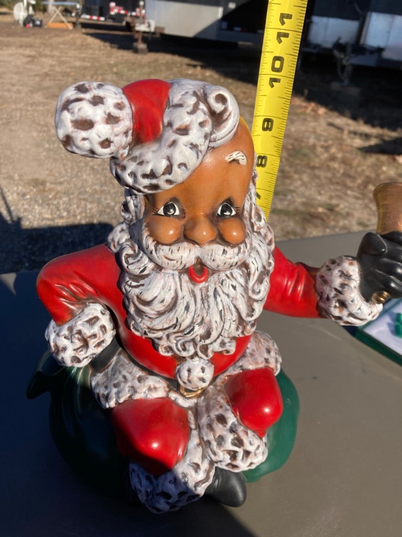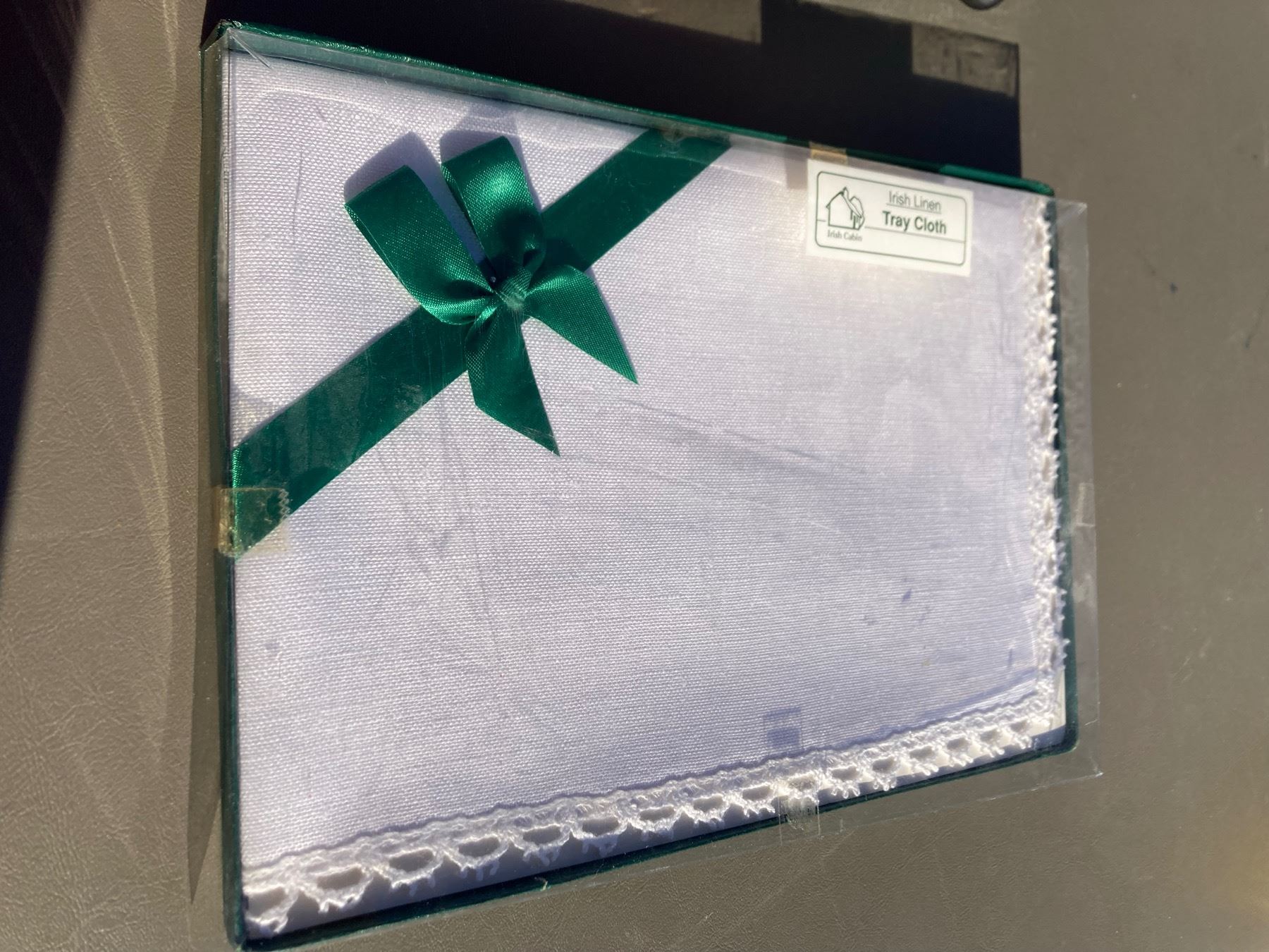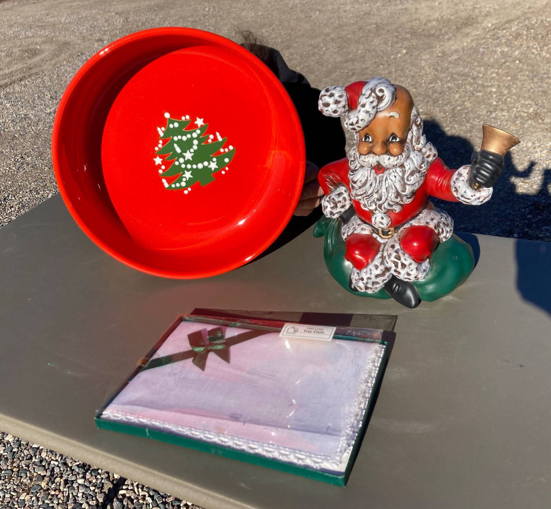 WAECHTERBACH CHRISTMAS TREE, CERAMIC SANTA, AND IRISH LINEN TRAY CLOTH