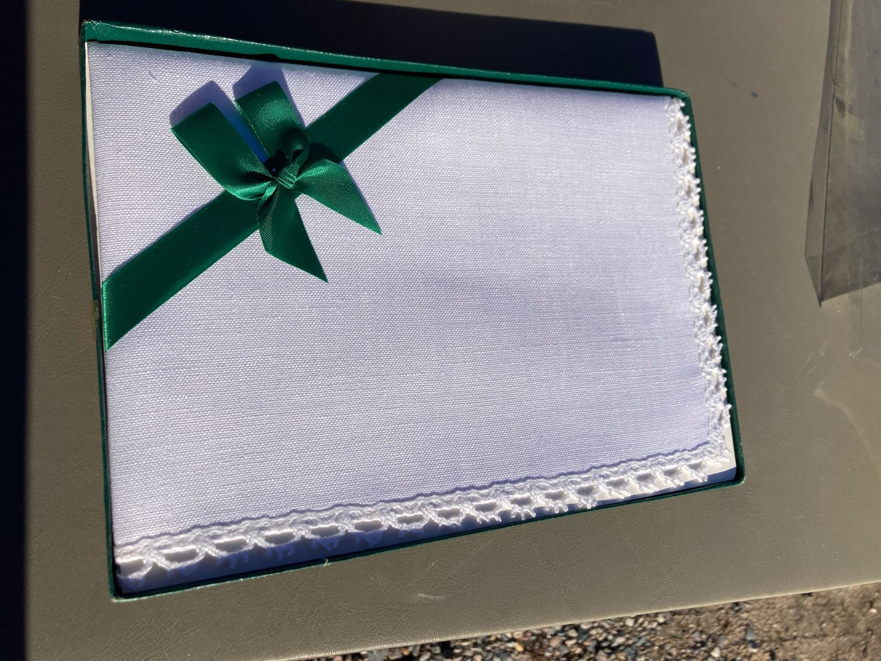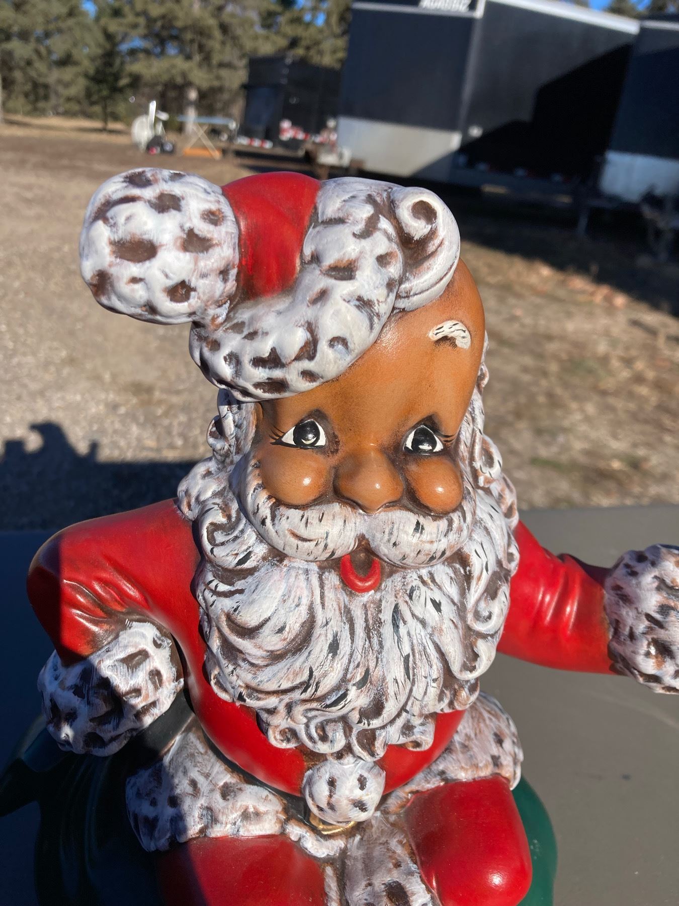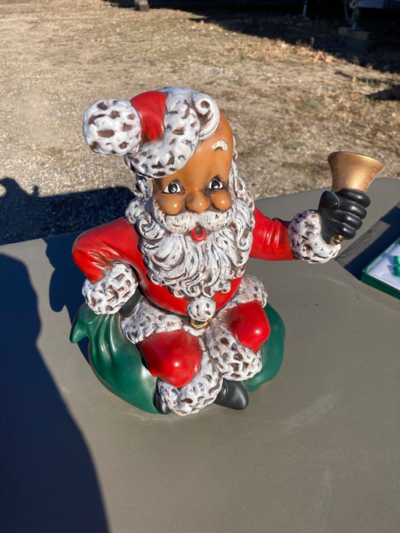 WAECHTERBACH CHRISTMAS TREE, CERAMIC SANTA, AND IRISH LINEN TRAY CLOTH